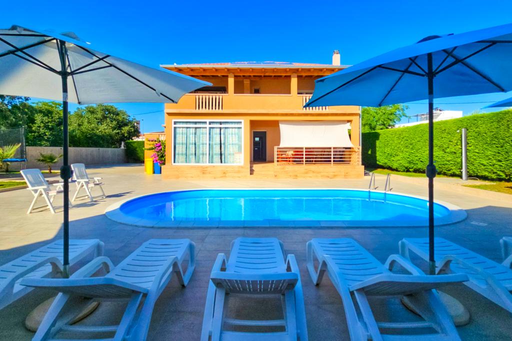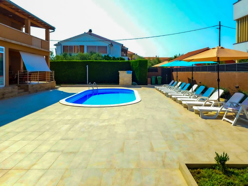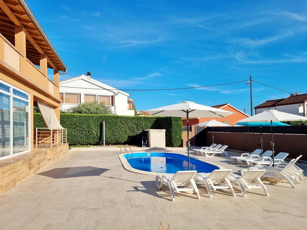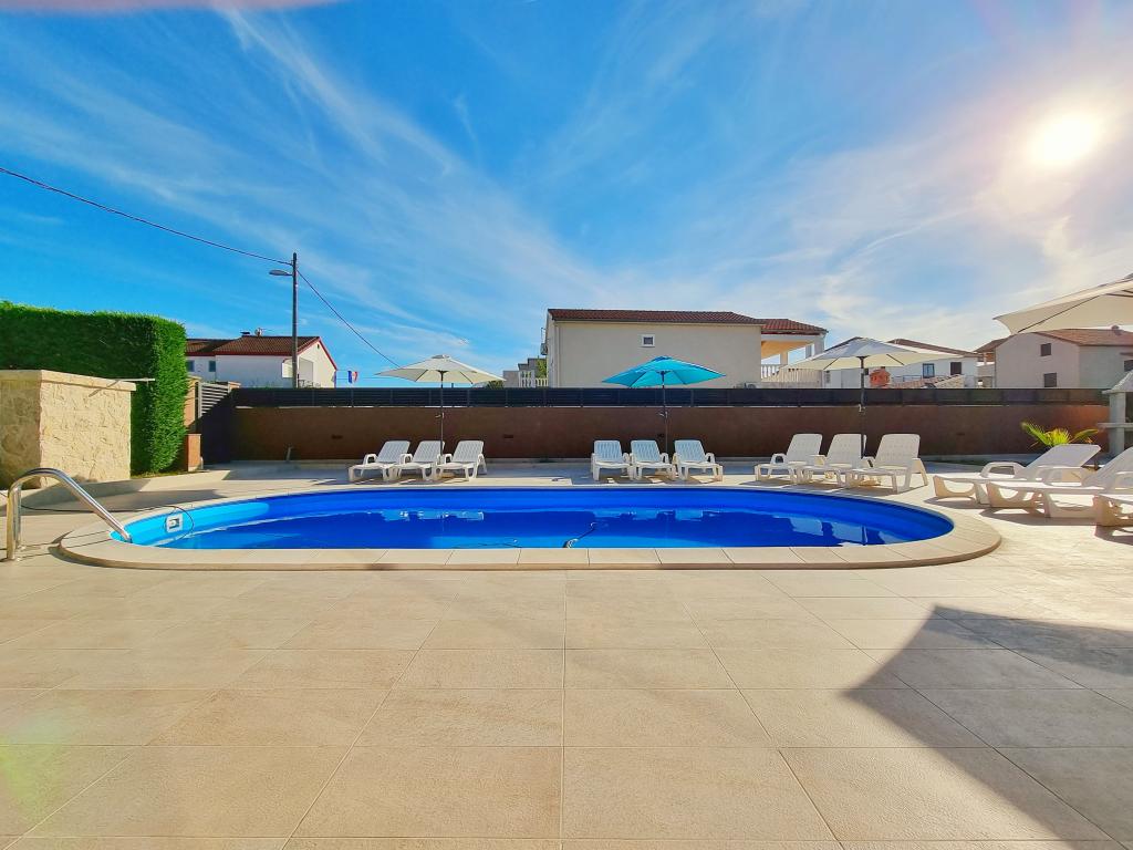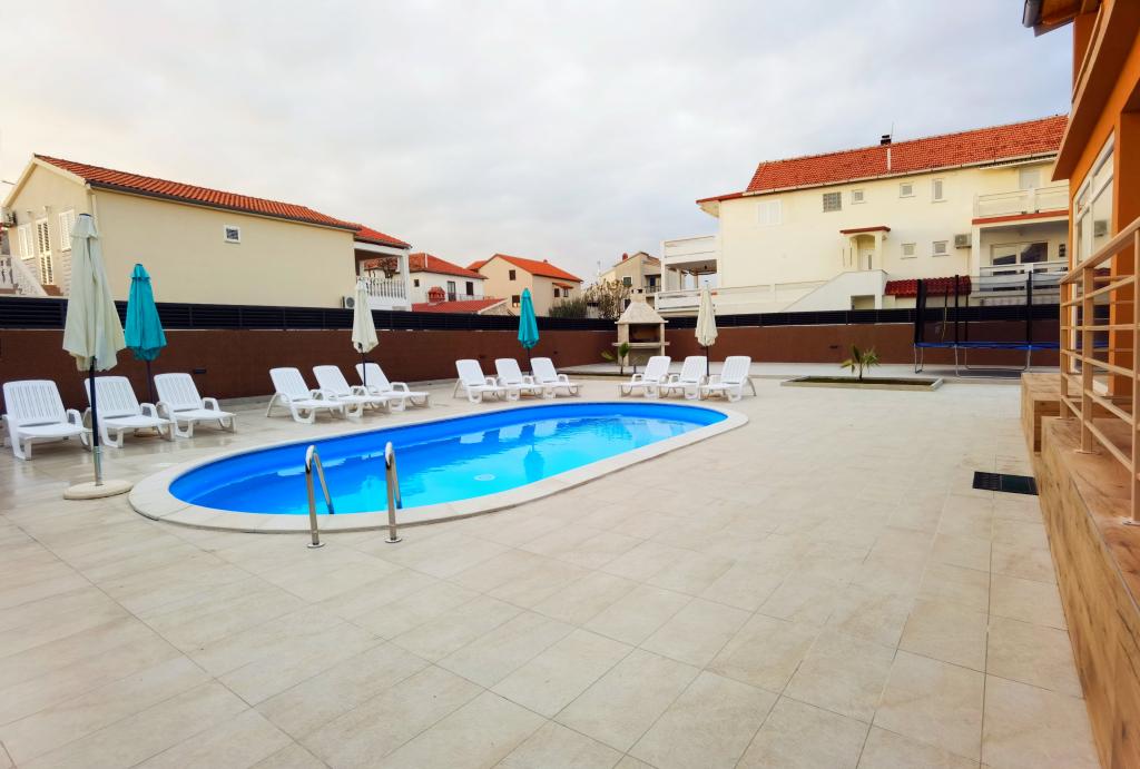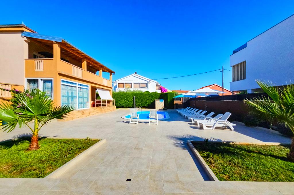 Bibinjében, Zadar közelében található ez a ház ideális nyaraláshoz! A strandoktól, az éttermekkel és kávézókkal teli régi falutól mindössze 5 perces sétára, a pékségtől, üzletektől, valamint a helyi gyümölcs- és bortermelőktől pedig 2 percre van. A ház bekerített (2 m magas) a magánélet érdekében, és két apartmanja van, mindegyik 90 m²-es, 2 hálószobával, konyhával, nappalival, 2 fürdőszobával és nagy terasszal. Az udvaron egy nagy parkoló, egy medence (8x4 m) és egy grill közös használatú. Látogassa meg a közeli Zadart, a Tengeri orgonát és a nemzeti parkokat, ahol felejthetetlen kirándulásokat tehet! Az uszoda 2025.05.15-től 2025.10.15-ig üzemel.