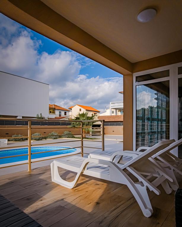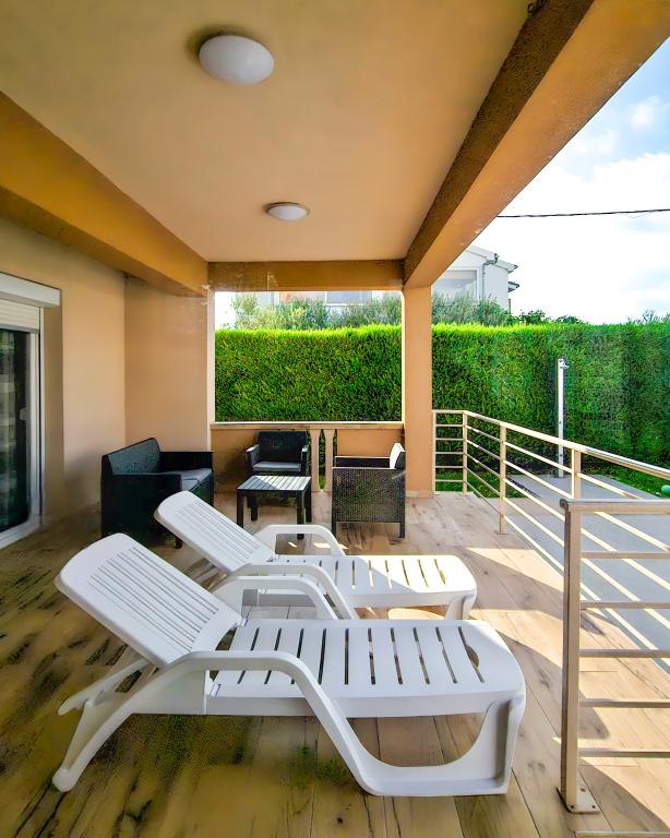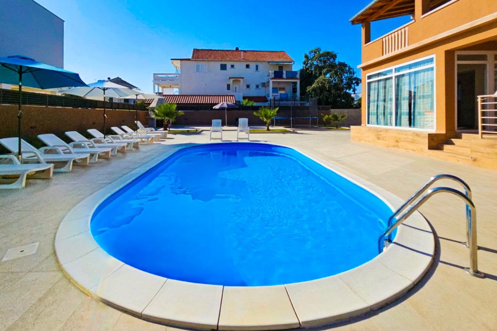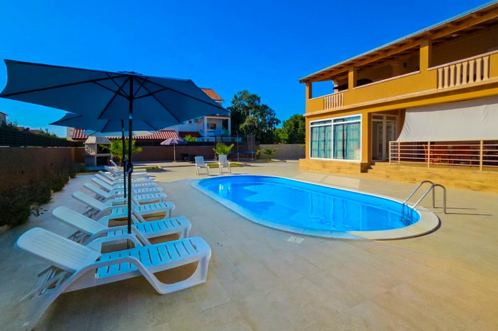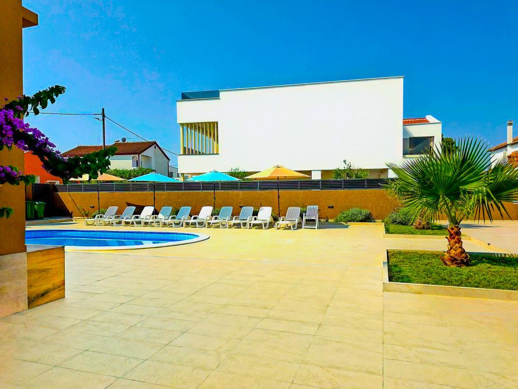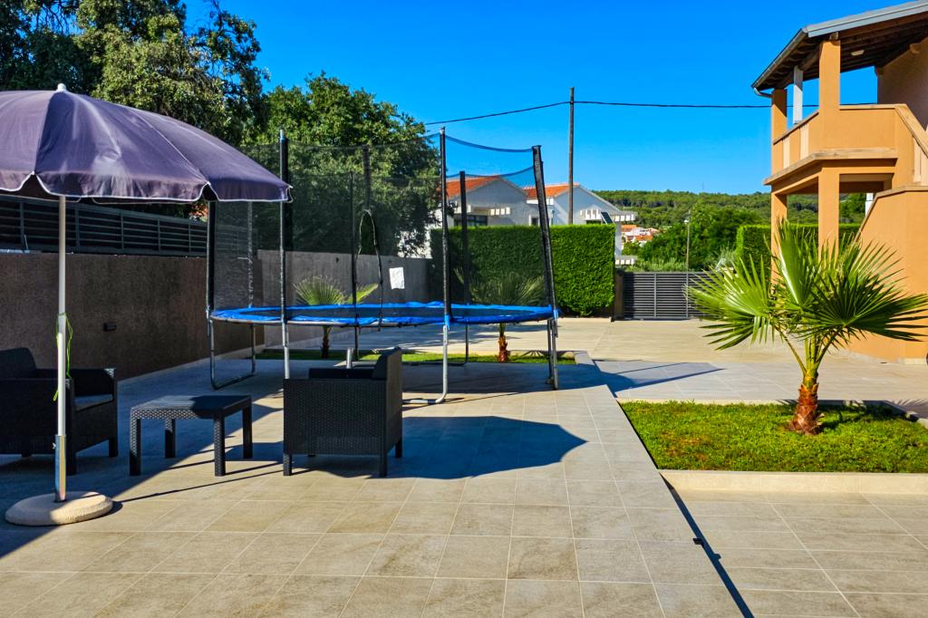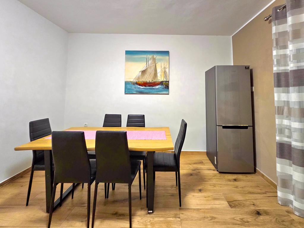 Bibinjében, Zadar közelében található ez a ház ideális nyaraláshoz! A strandoktól, az éttermekkel és kávézókkal teli régi falutól mindössze 5 perces sétára, a pékségtől, üzletektől, valamint a helyi gyümölcs- és bortermelőktől pedig 2 percre van. A ház bekerített (2 m magas) a magánélet érdekében, és két apartmanja van, mindegyik 90 m²-es, 2 hálószobával, konyhával, nappalival, 2 fürdőszobával és nagy terasszal. Az udvaron egy nagy parkoló, egy medence (8x4 m) és egy grill közös használatú. Látogassa meg a közeli Zadart, a Tengeri orgonát és a nemzeti parkokat, ahol felejthetetlen kirándulásokat tehet! Az uszoda 2025.05.15-től 2025.10.15-ig üzemel.