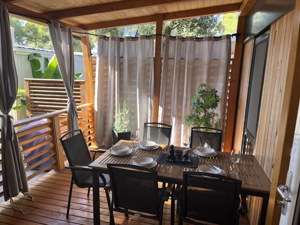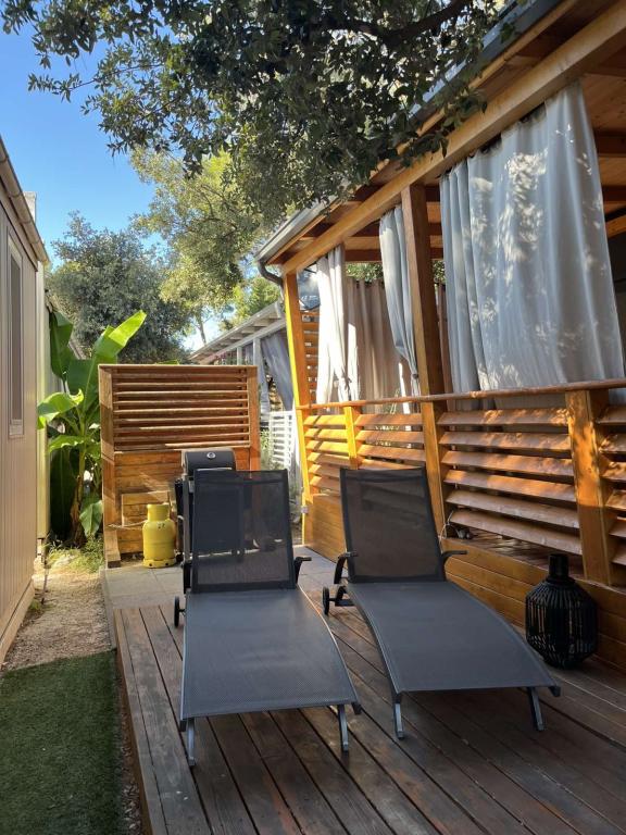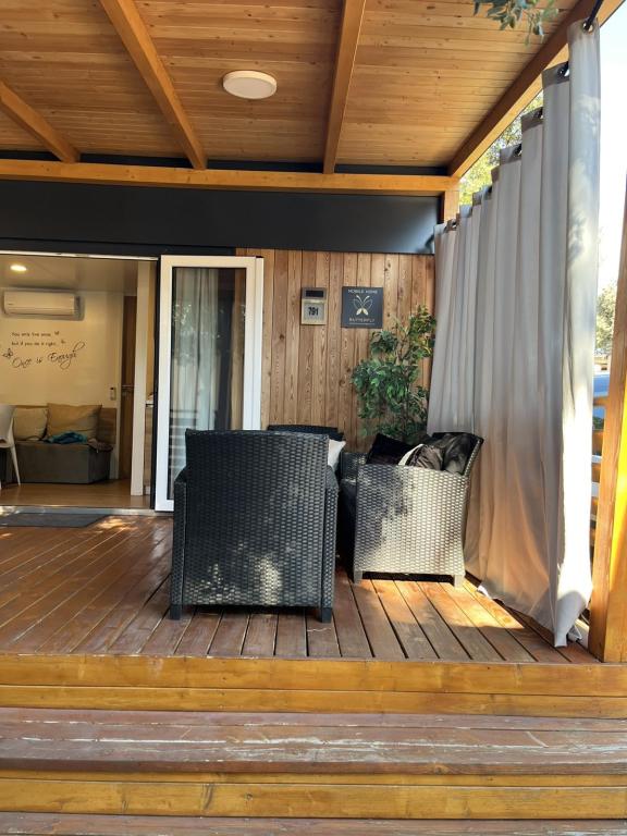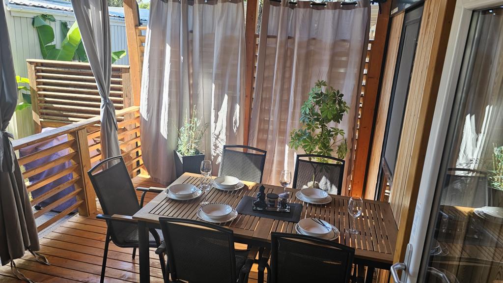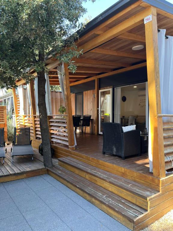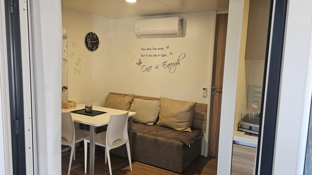 Modern, légkondicionált mobilház a Park Soline kempingben, mindössze pár lépésre a strandtól és 15 perc sétára Biograd központjától. 2 hálószobával, konyhával, nappalival, 2 fürdőszobával és fedett terasszal, kerti bútorokkal. Ingyenes Wi-Fi, parkoló, gyermekprogramok, sportpályák és mediterrán étterem a helyszínen. Tökéletes családok vagy párok számára, akik fenyőfák árnyékában szeretnének kikapcsolódni, közel a főbb látnivalókhoz.
