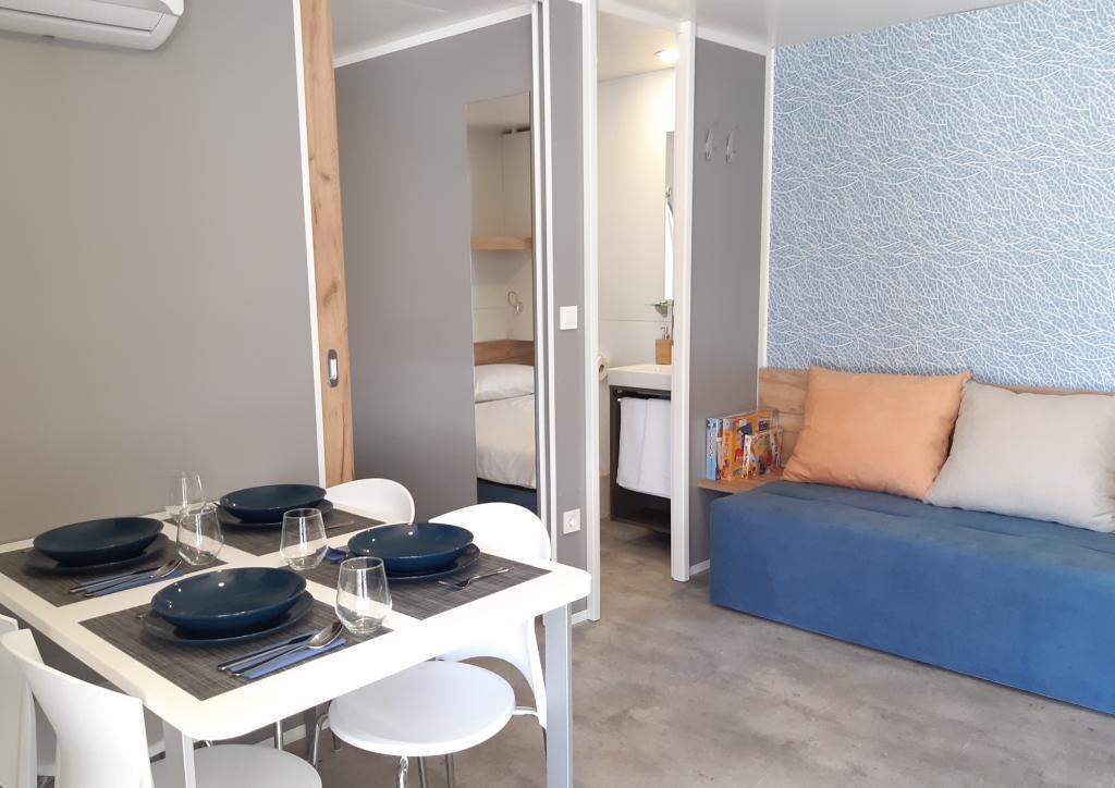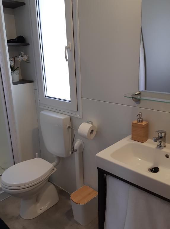 A Soline kemping csendes részén, egy fenyveserdőben található modern InnMare 781 mobilház tökéletes hely egy családi nyaraláshoz. 32 m2-es alapterületével egy franciaággyal ellátott hálószobából, egy két egyszemélyes ággyal ellátott hálószobából, egy kihúzható ággyal (1-2 fő részére) ellátott nappaliból, egy WC-vel ellátott fürdőszobából, egy 32 m2-es teraszból, egy kis udvarból és egy parkolóhelyből áll. Az ingatlan teljesen berendezett, a konyhában az alapfelszereltség mellett mikrohullámú sütő, vízforraló és eszpresszógép is található. A teraszon egy további étkezőasztal, nyugágyak találhatók a tökéletes szunyókáláshoz, fenyőfák illatával fűszerezve, az ingatlan mellett pedig egy elektromos grillpult található, amely szintén a vendégek által használható felszereltség szerves részét képezi. Az ingatlan mellett egy autó számára parkolóhely is található, amelyet a vendégek használhatnak. Üdvözöljük az InnMare 781-ben, egy modern ingatlanban, amely békés és idilli családi nyaralásra lett tervezve egy csendes fenyveserdőben, a tenger, a strandok és Biograd na moru könnyű elérhetőségével!