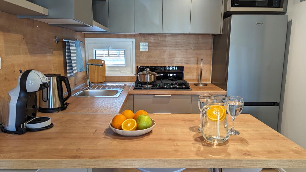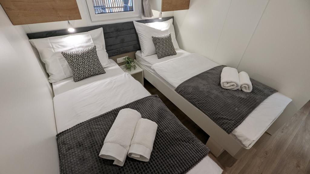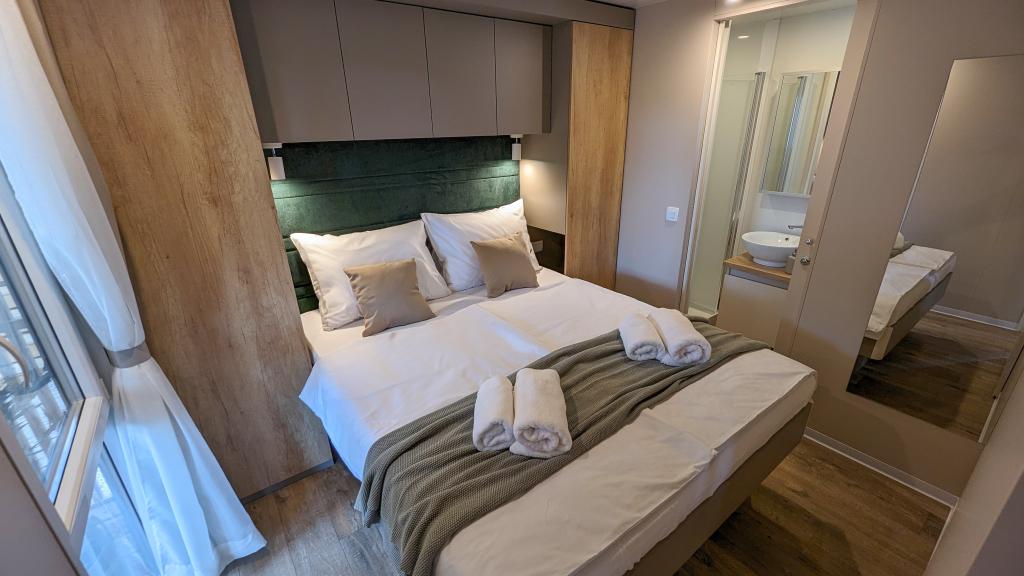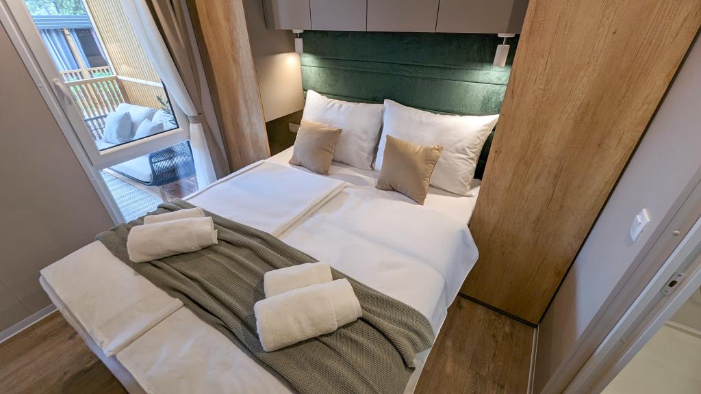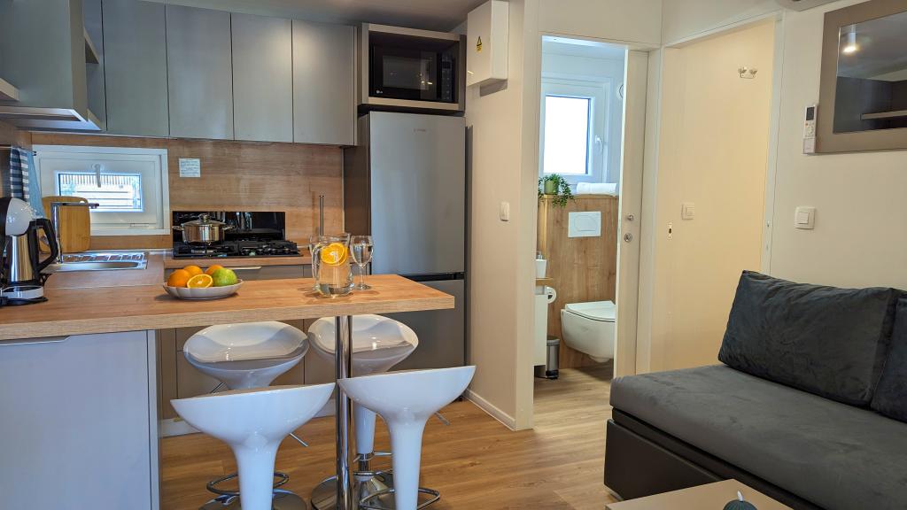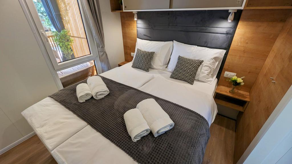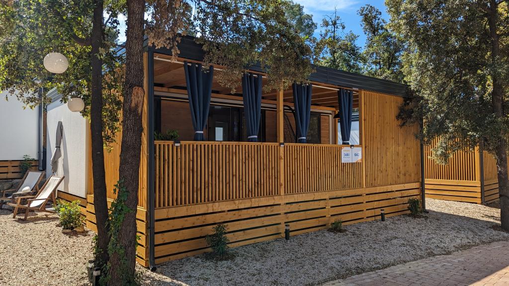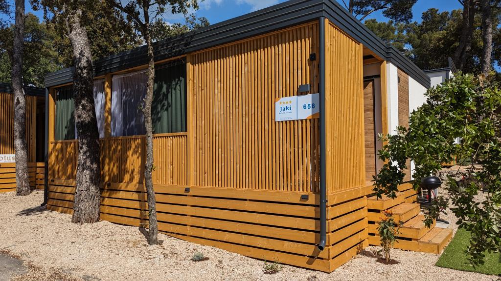 Élvezze a természetet és a kényelmet: Jaki mobilházak a Soline kempingben, Biograd na Moruban. A 4 csillagos kemping csendes részén, fenyőerdőkkel körülvett korszerűen felszerelt mobilházaink akár 6 fő elszállásolására is ideálisak. Élvezze a strand (2-5 perc séta), üzletek és éttermek, valamint a városközpontba vezető sétány (15 perc) közelségét. Ezek a nyaralók 2 hálószobával és 2 fürdőszobával, nappalival, nagy terasszal, étkezőasztallal és társalgóval, valamint teljesen felszerelt konyhával - mosogatógéppel, mikrohullámú sütővel, kávéfőzővel, kenyérpirítóval, turmixgéppel, szabadtéri grillezővel - rendelkeznek. A házban ingyenes wifi, ingyenes parkolás a ház mellett, Smart TV, légkondicionálás, törölköző és ágynemű is biztosított. A tábor számos lehetőséget kínál az egész család számára: gyönyörű homokos és kavicsos strandok, amelyek egészen a városközpontig nyúlnak, mediterrán specialitásokat kínáló étterem, játszótér, sportolási lehetőségek és kerékpárkölcsönzés. A Dalmaland, Horvátország legnagyobb tematikus vízi parkja 15 perces autóútra fekszik.