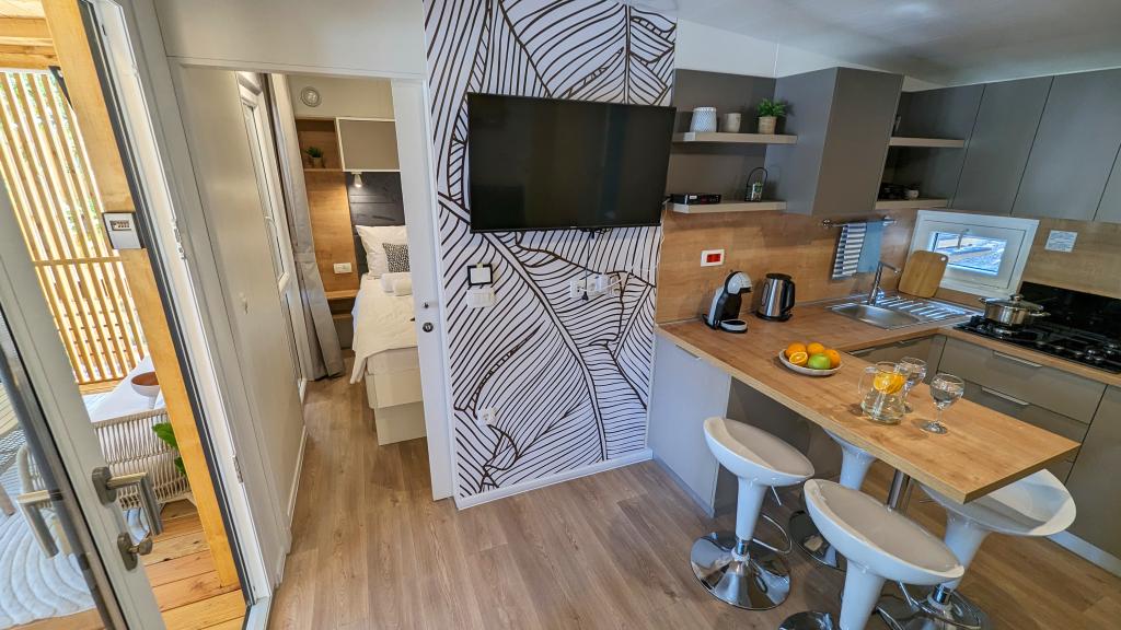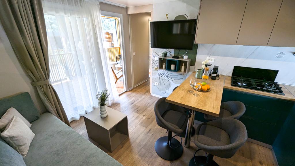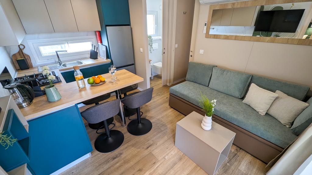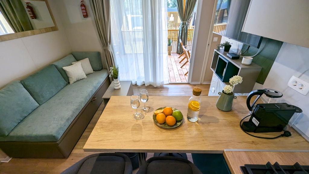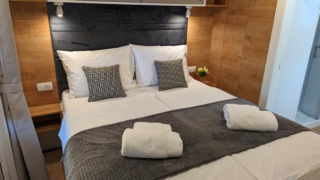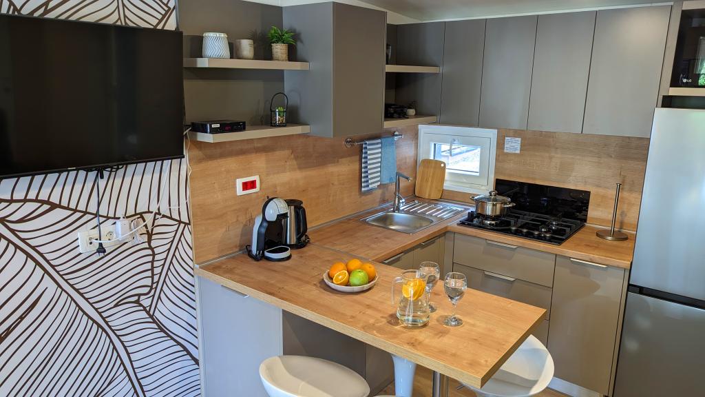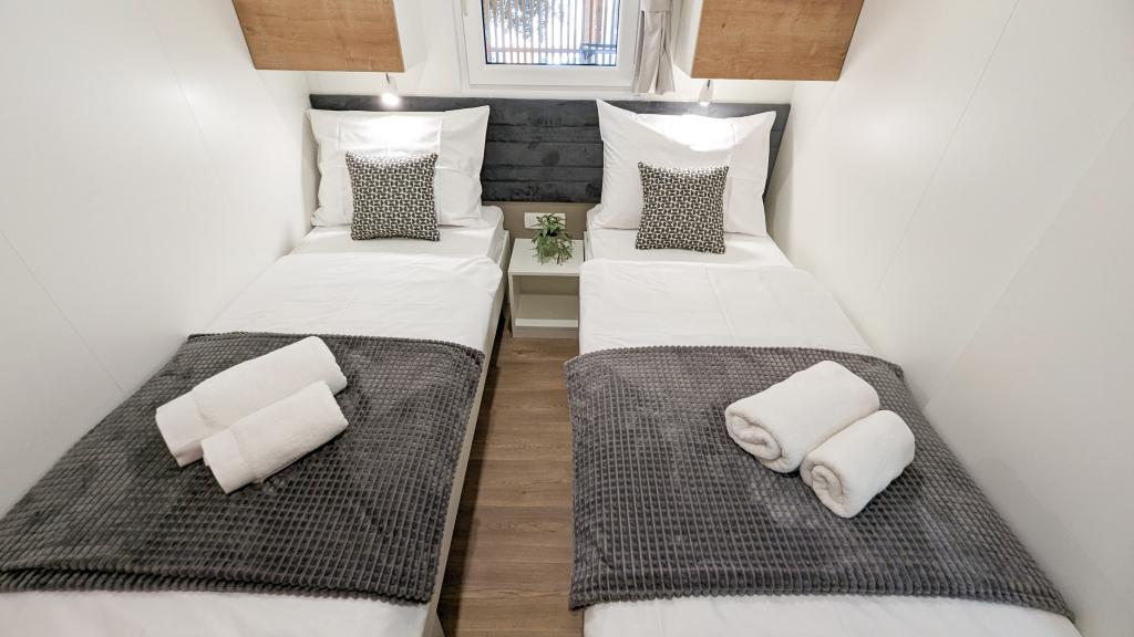Élvezze a természetet és a kényelmet: Jaki mobilházak a Soline kempingben, Biograd na Moruban. A 4 csillagos kemping csendes részén, fenyőerdőkkel körülvett korszerűen felszerelt mobilházaink akár 6 fő elszállásolására is ideálisak. Élvezze a strand (2-5 perc séta), üzletek és éttermek, valamint a városközpontba vezető sétány (15 perc) közelségét. Ezek a nyaralók 2 hálószobával és 2 fürdőszobával, nappalival, nagy terasszal, étkezőasztallal és társalgóval, valamint teljesen felszerelt konyhával - mosogatógéppel, mikrohullámú sütővel, kávéfőzővel, kenyérpirítóval, turmixgéppel, szabadtéri grillezővel - rendelkeznek. A házban ingyenes wifi, ingyenes parkolás a ház mellett, Smart TV, légkondicionálás, törölköző és ágynemű is biztosított. A tábor számos lehetőséget kínál az egész család számára: gyönyörű homokos és kavicsos strandok, amelyek egészen a városközpontig nyúlnak, mediterrán specialitásokat kínáló étterem, játszótér, sportolási lehetőségek és kerékpárkölcsönzés. A Dalmaland, Horvátország legnagyobb tematikus vízi parkja 15 perces autóútra fekszik.