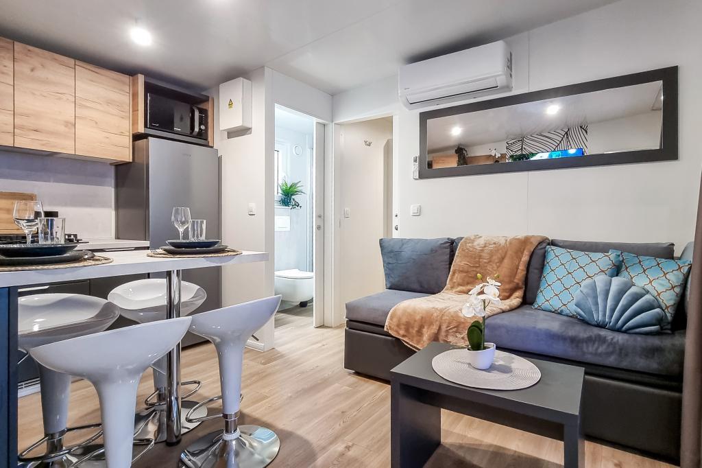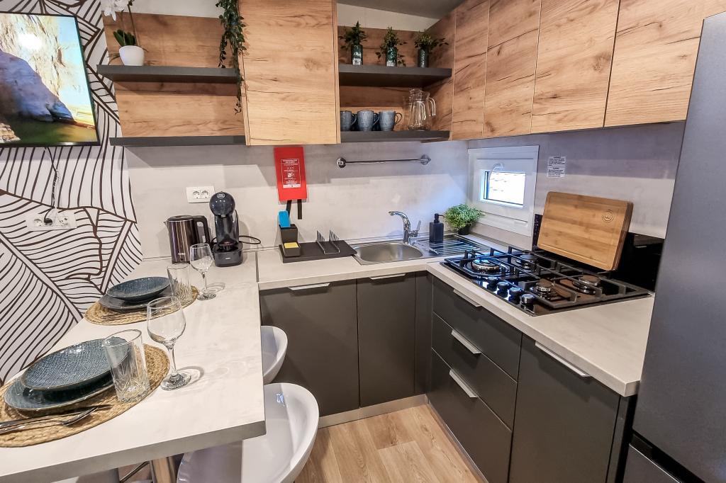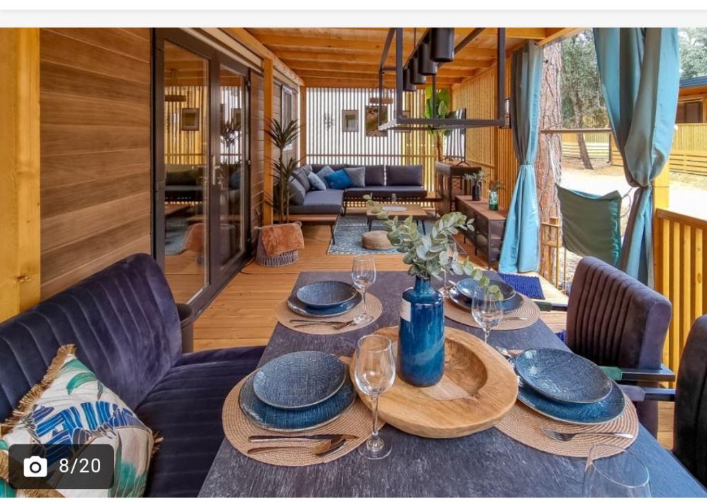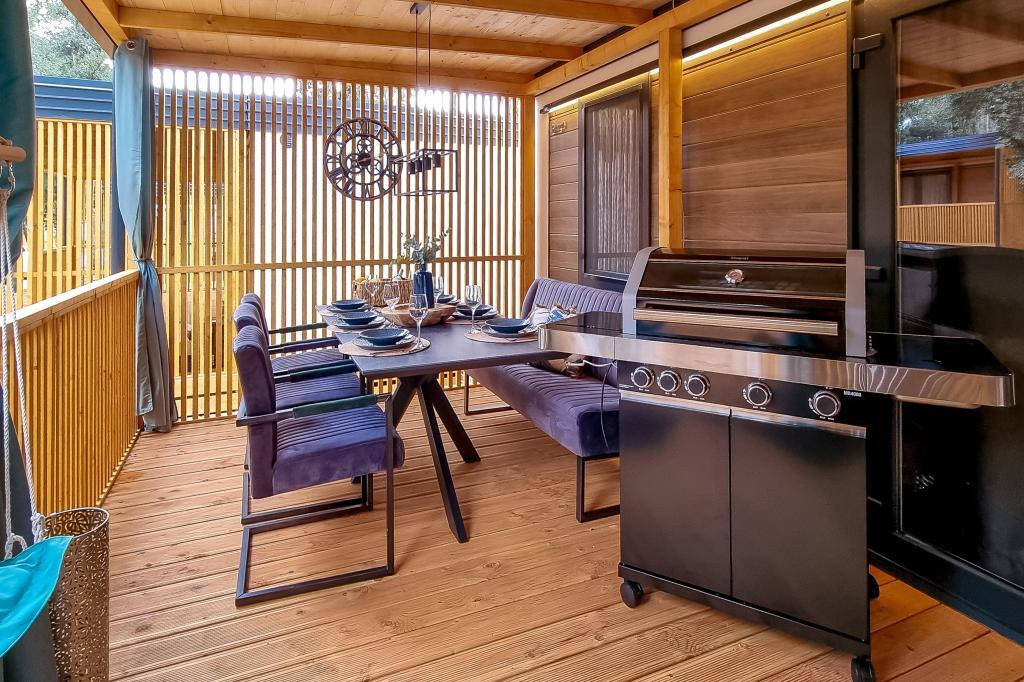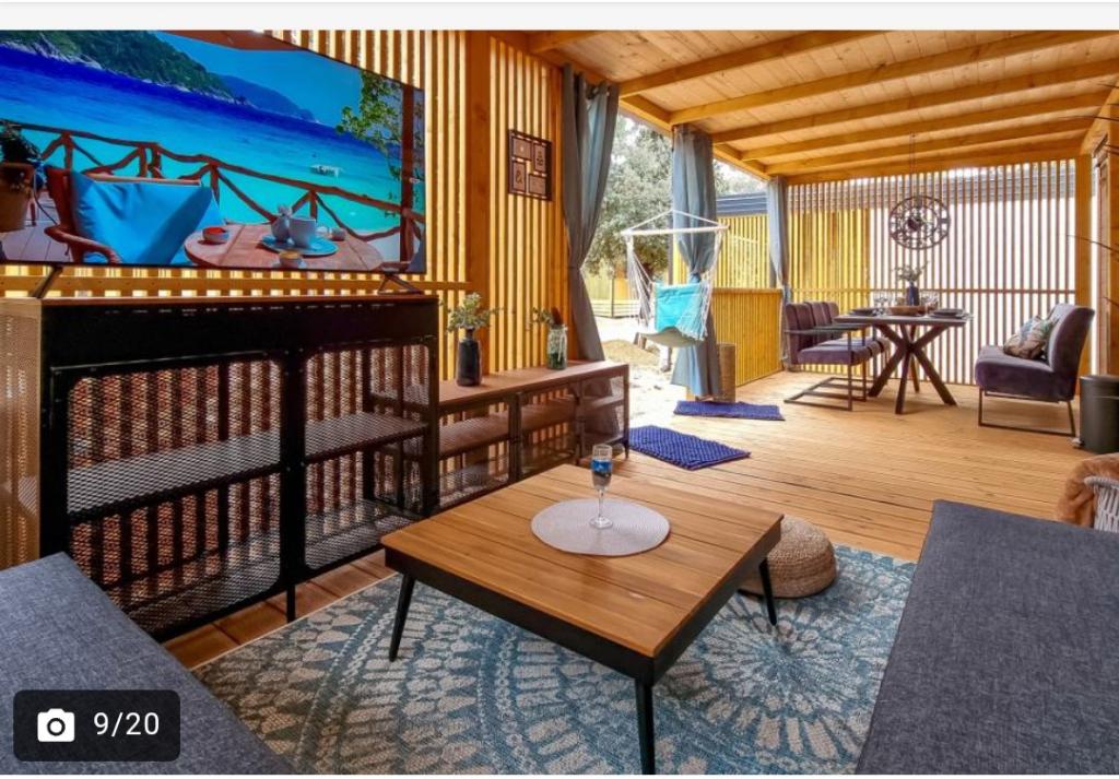 Modern felszereltségű mobilházunk kényelmes szállást kínál akár 6 fő részére, 2 tágas hálószobával, egy kihúzható kanapéval felszerelt nappalival és 2 fürdőszobával. Élvezze a nagy fedett teraszt, amely étkezővel és kültéri nappalival rendelkezik, ideális hosszú esti összejövetelekhez. Itt dartsozhat, vagy pihenhet a nagyméretű tévé előtt, miközben grillezhet nagyméretű gázgrillünkön és kültéri tűzhelyünkön. A fedett teraszt fenyőfák és lágy tengeri szellő veszi körül. A terasz egyik oldalán egy tágas étkező található, amely kényelmes kanapéval és még kényelmesebb fotelekkel van felszerelve, míg a másik oldalon a kültéri nappalink kényelmes ülősarokkal várja vendégeit, ahol nemcsak pihenhet, hanem kedvenc tévéműsorait is élvezheti a hatalmas tévén, amelyen elérhetőek műholdas TV-csatornák, Netflix és HBO GO csatornák. A ház 3 percre található a gyönyörű strandtól.