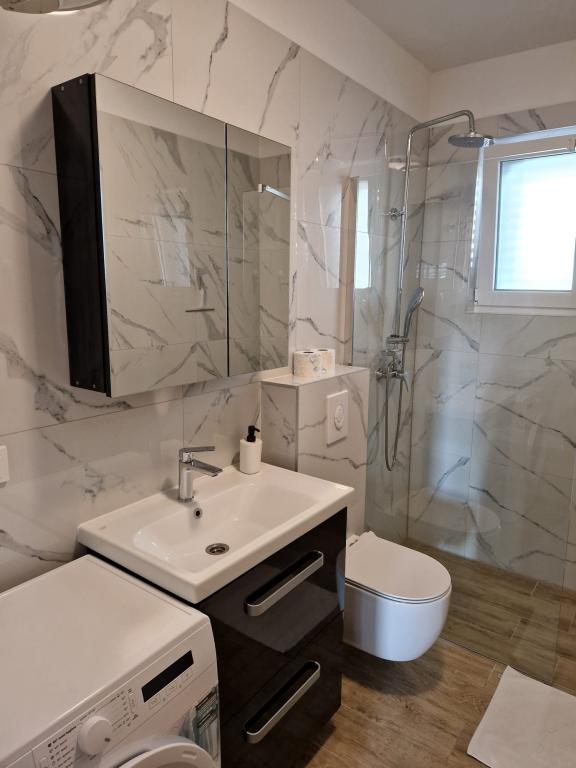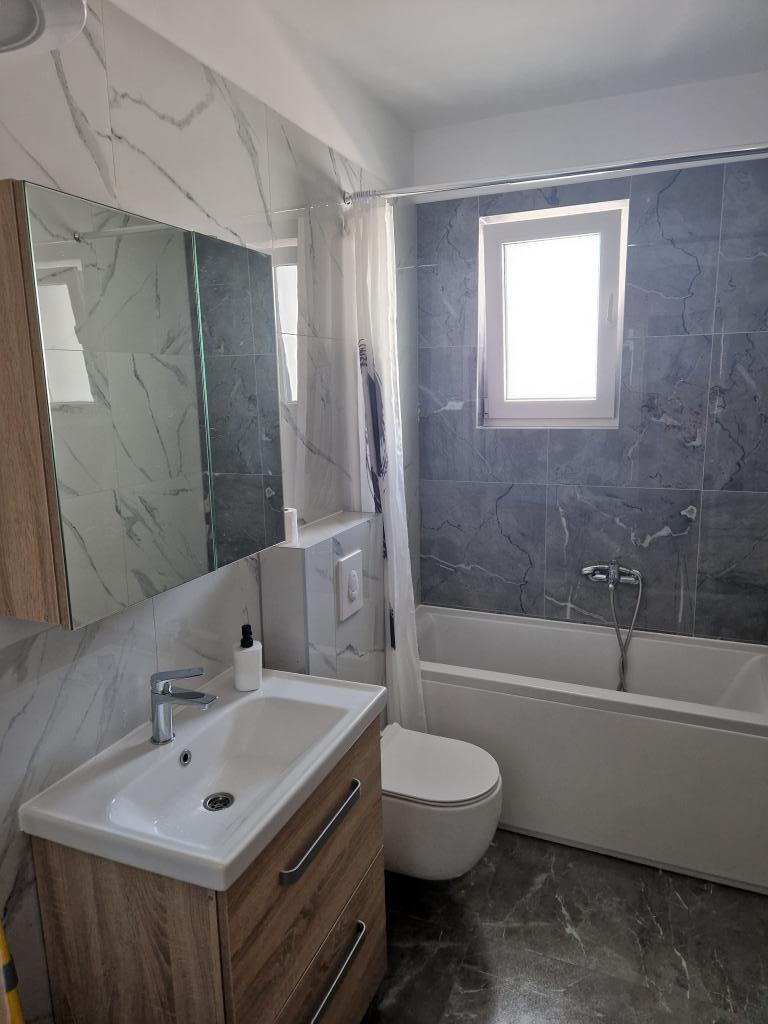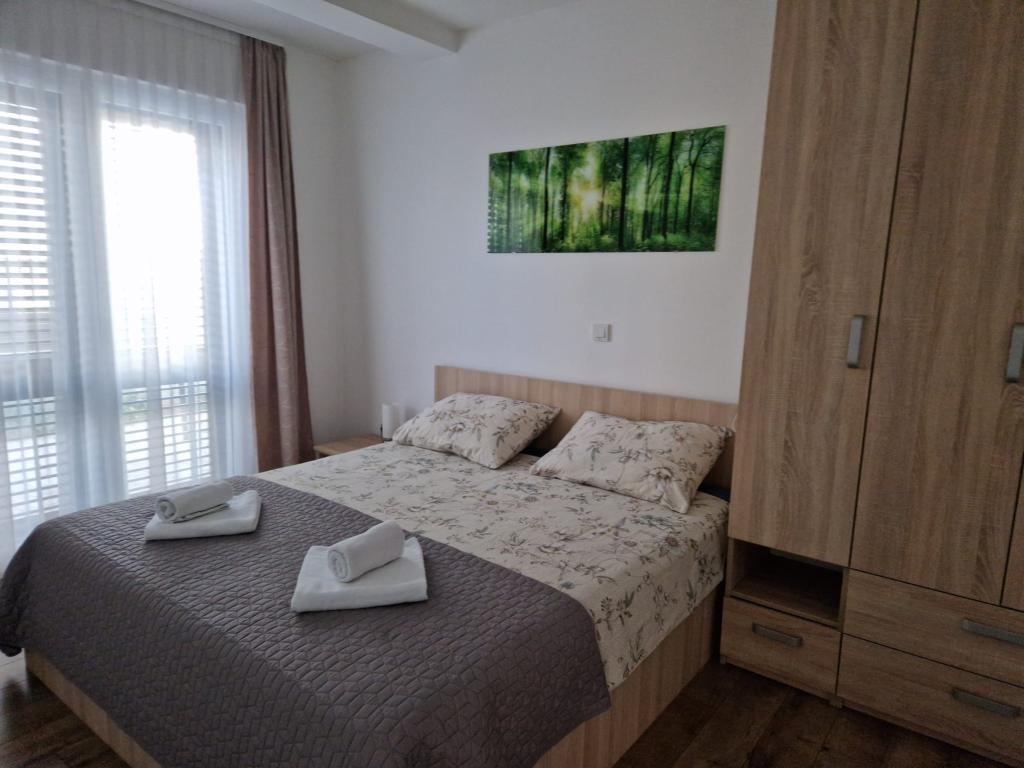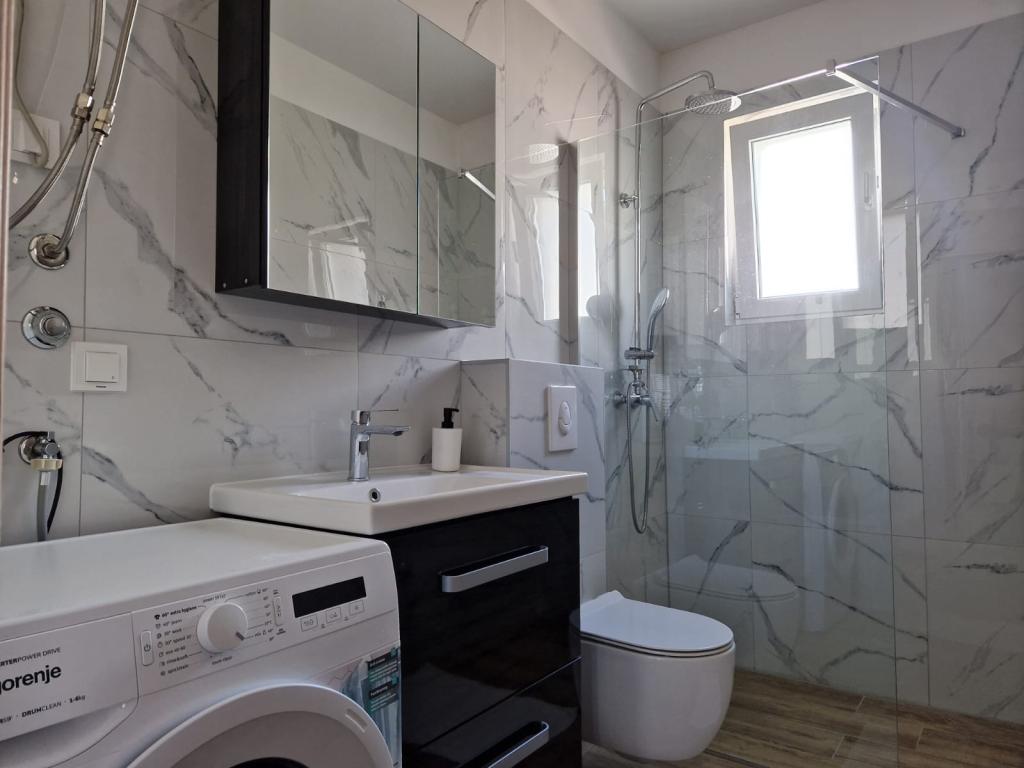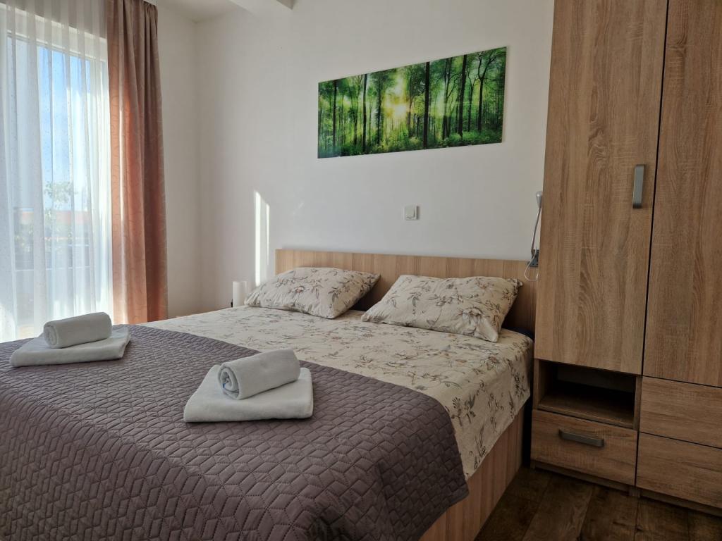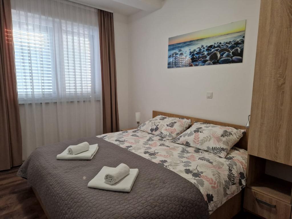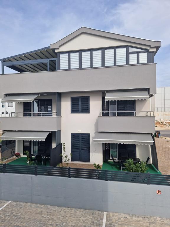 A Villa Toni egy újonnan épült épület. Az apartmanok nagyon szépen berendezettek, modernek és tágasak. Minden apartmanhoz teljesen felszerelt konyha tartozik. Minden nappaliban van egy kanapé. A szobákban nagy franciaágyak és minőségi és kényelmes matracok találhatók. Minden apartman légkondicionált és mosógéppel felszerelt. A teraszokon és az erkélyeken napellenzők vannak (elöl és oldalt). A villa a város csendes részén található. Az udvarban parkolóhely biztosított. A közelben számos szupermarket, strand, étterem és kávézó található. 10 perc sétára van a központtól és 5 percre a strandtól.