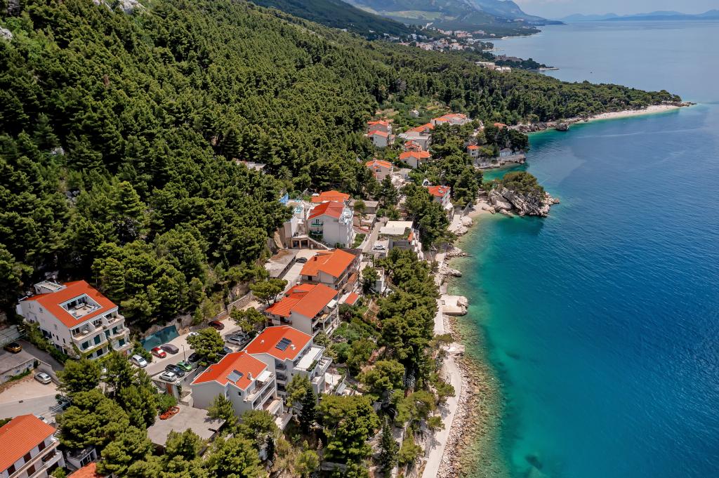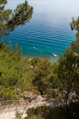 Házunk Brela csendes és zöld részén található, 50 méterre a tengertől. A közvetlenül a ház alatt található strand privát lépcsőn közelíthető meg. A híres Punta Rata strand kb. 500 méterre található a háztól, a város központja pedig kb. 10-15 perces sétával elérhető a gyönyörű tenger melletti tájon. Minden apartman légkondicionált, műholdas TV-vel és internet-hozzáféréssel felszerelt.