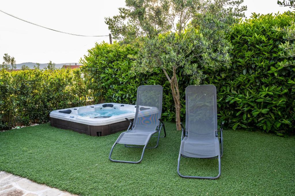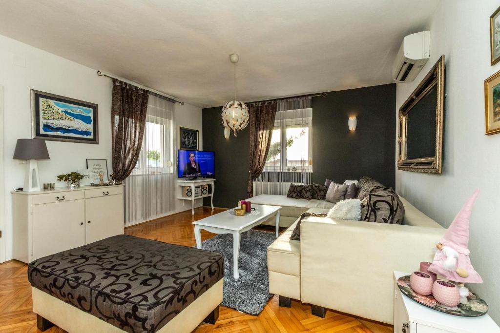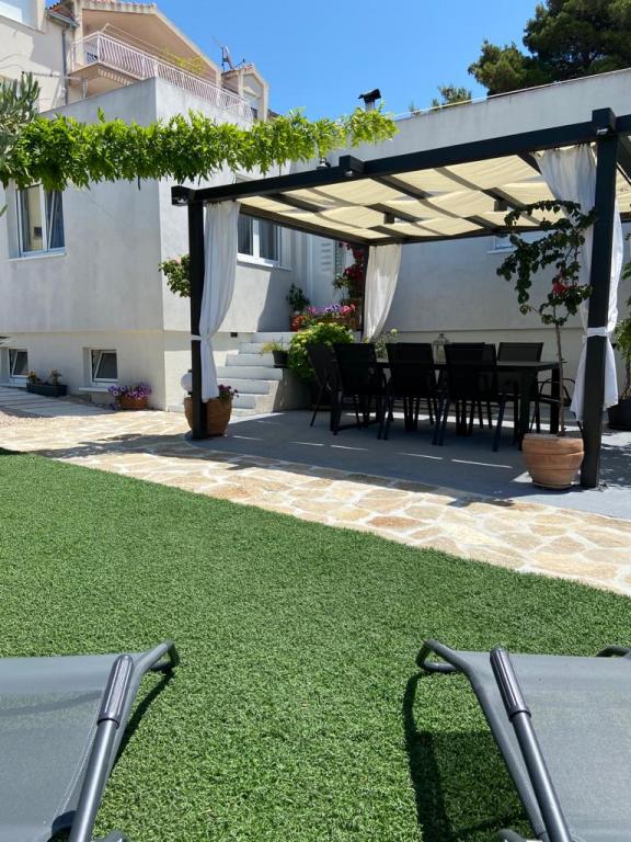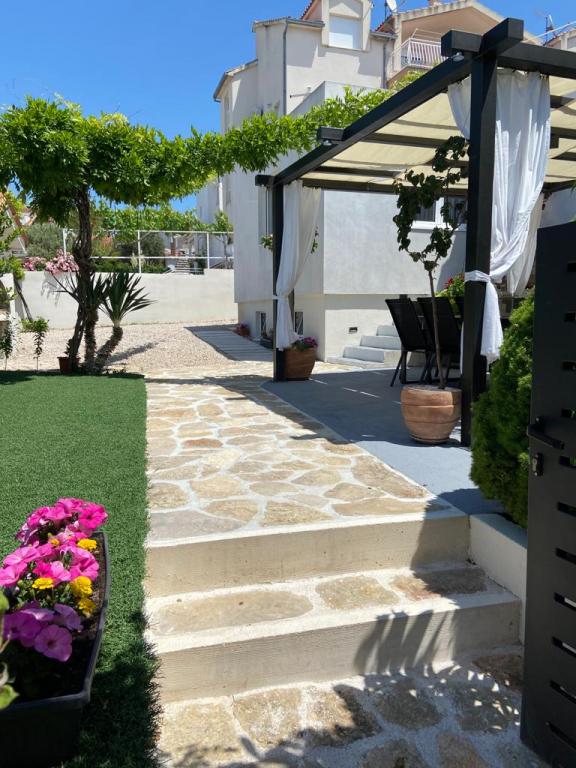 Modern, 85 m2-es apartman a ház földszintjén 2 hálószobával - az egyikben egy 180 cm-es franciaágy, a másikban egy 160 cm-es franciaágy és egy kanapéágy (1 felnőtt vagy 2 gyermek számára). Kérésre lehetőség van babaágy elhelyezésére. A tágas nappaliban egy nagyméretű kanapéágy található további 2 fő számára, étkező, modern konyha mosogatógéppel, hűtőszekrénnyel fagyasztóval, sütővel, tűzhellyel, minden szükséges készülékkel és edényekkel, valamint egy étkező. Egy nagy fürdőszoba káddal és mosógép is rendelkezésre áll. A ház előtt terasz található fedett pavilonnal és asztallal székekkel, jakuzzival és nyugágyakkal, valamint grillezővel a kertben. Ingyenes parkolás két autó számára. Ingyenes wi-fi. Légkondicionált nappali és mindkét hálószoba. A strand 150 méterre található az utcán. A háztól 100 méterre található egy bolt. A strandon 3 strandbár/kávézó található, amelyek közül az egyikben árnyékos játszótér található a gyerekek számára. A Solaris beach resort kb. 1 km-re a háztól, stranddal, éttermekkel, aquaparkkal és gyermek- és felnőttbarát szolgáltatásokkal.