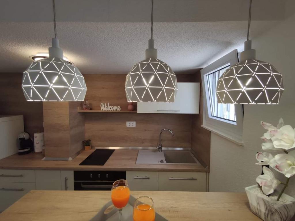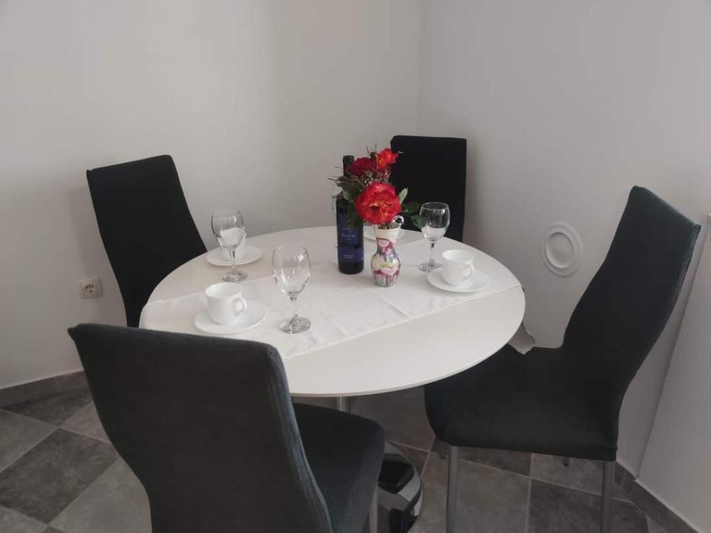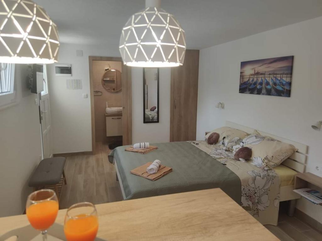 Az apartmanok zöldövezetben, csendes környéken találhatók. A strand 200 m-re vagy kevesebb, mint 5 perc sétára található. A Studio alkalmazás 2 személyes, azzal a ténnyel, hogy egy kisebb gyerek is használhat utazóágyat. A 2+2 apartman ideális 10 éves gyermekes családok számára. Minden elérhető közelségben van, így nincs szükség autóra.