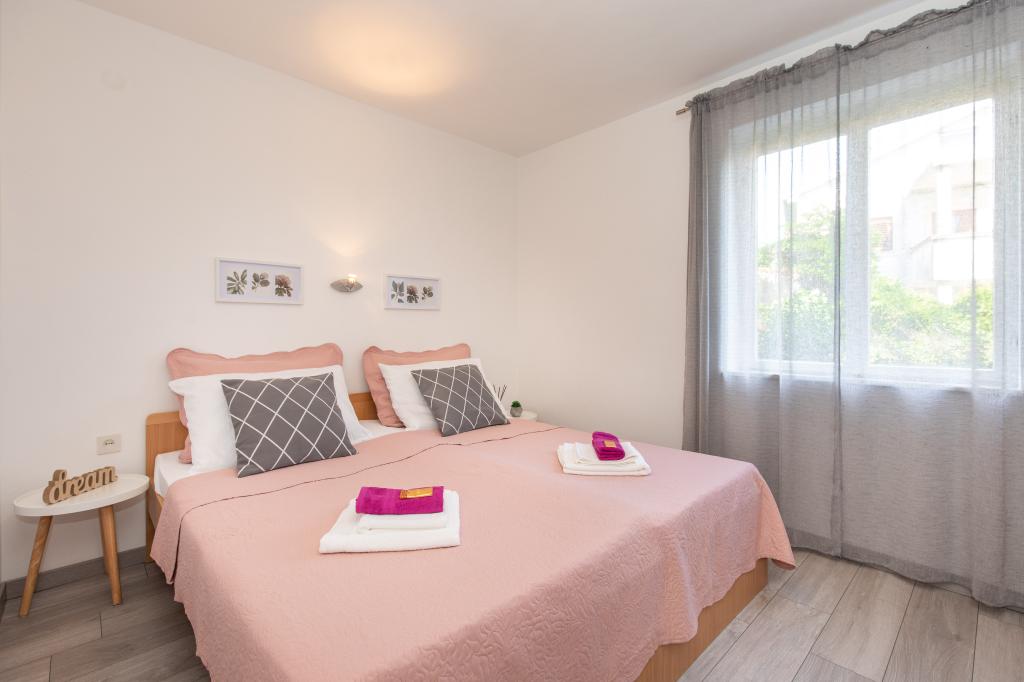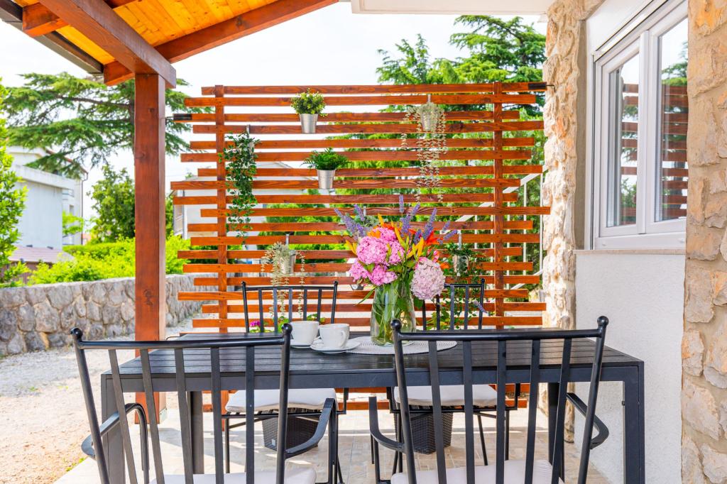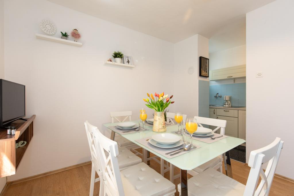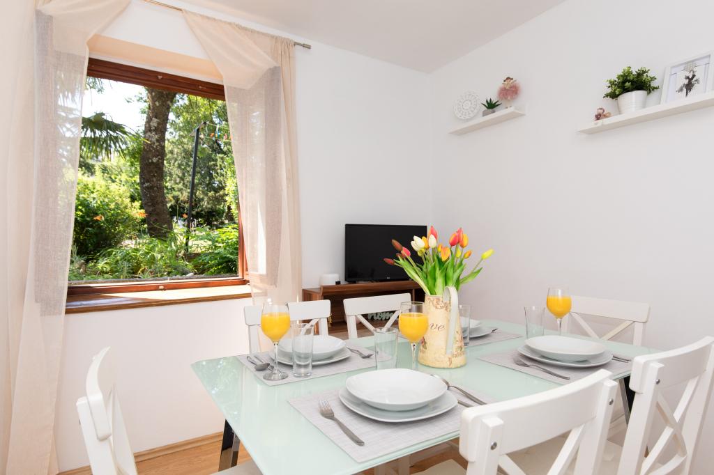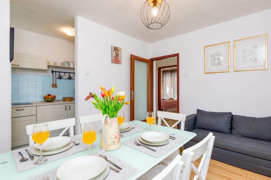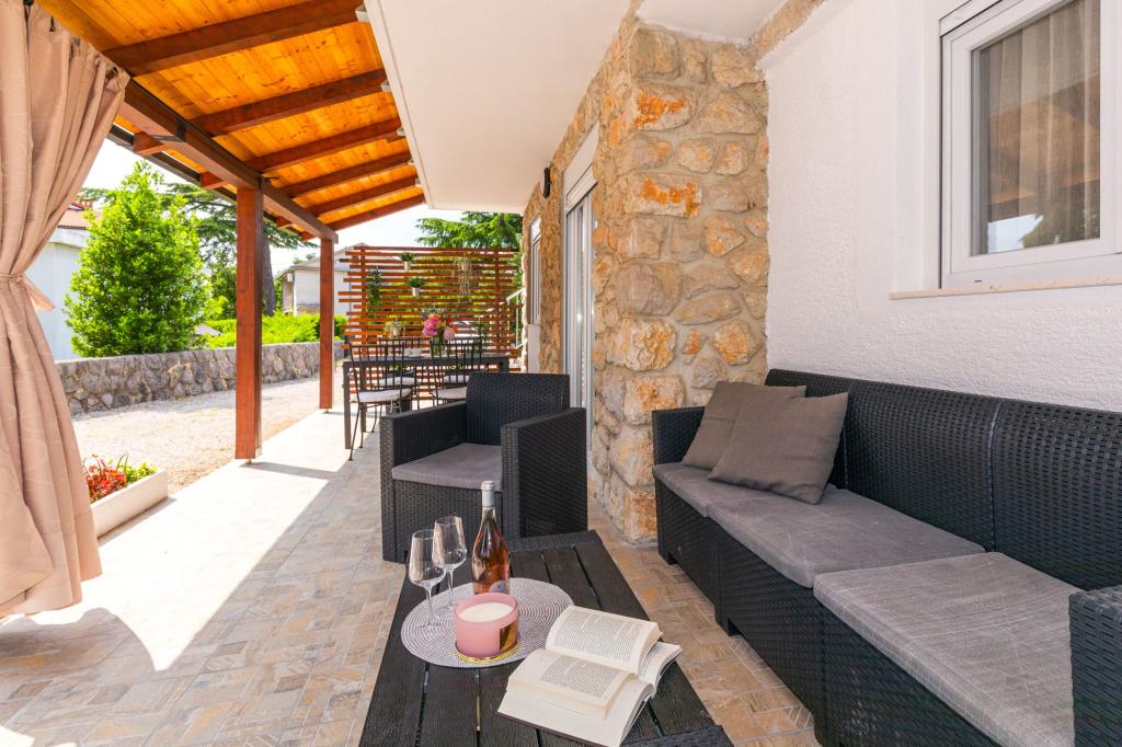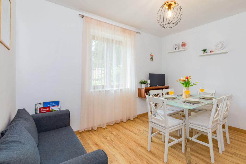 Háromszobás apartman egy családi ház földszintjén Crikvenica csendes részén. A lakáshoz tartozik egy bekerített udvar, két gépkocsi beállási lehetőséggel. A létesítmény teljesen felszerelt mindennel, ami a gondtalan nyaraláshoz kell, Wi-Fi, légkondi, mosógép, hajszárító, kávéfőző, kenyérpirító, kiságy és babaetető. Élvezheti a tágas teraszon, és grillező is rendelkezésre áll. Az apartman mindössze 700 méterre található a városközponttól és a strandtól. Körülbelül 10 perc gyalog a város, de legalább 15 perc a visszaút. Az apartmantól sétatávolságra számos vendéglátó egység található, amelyek a változatos gasztronómiai kínálat mellett gazdag éjszakai életet is kínálnak. A házigazdák minden információért rendelkezésre állnak.