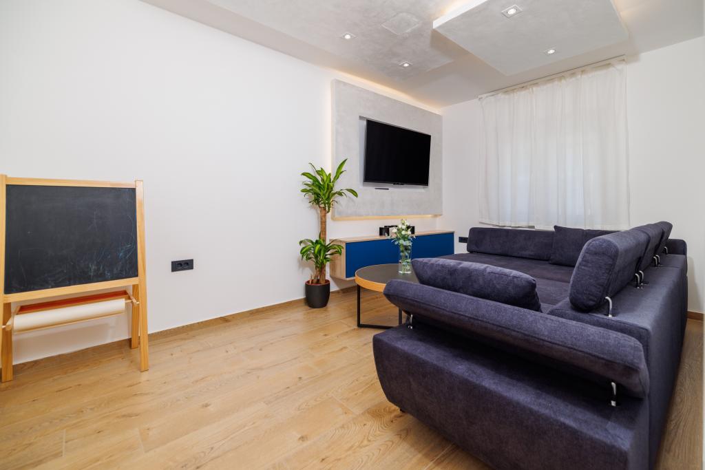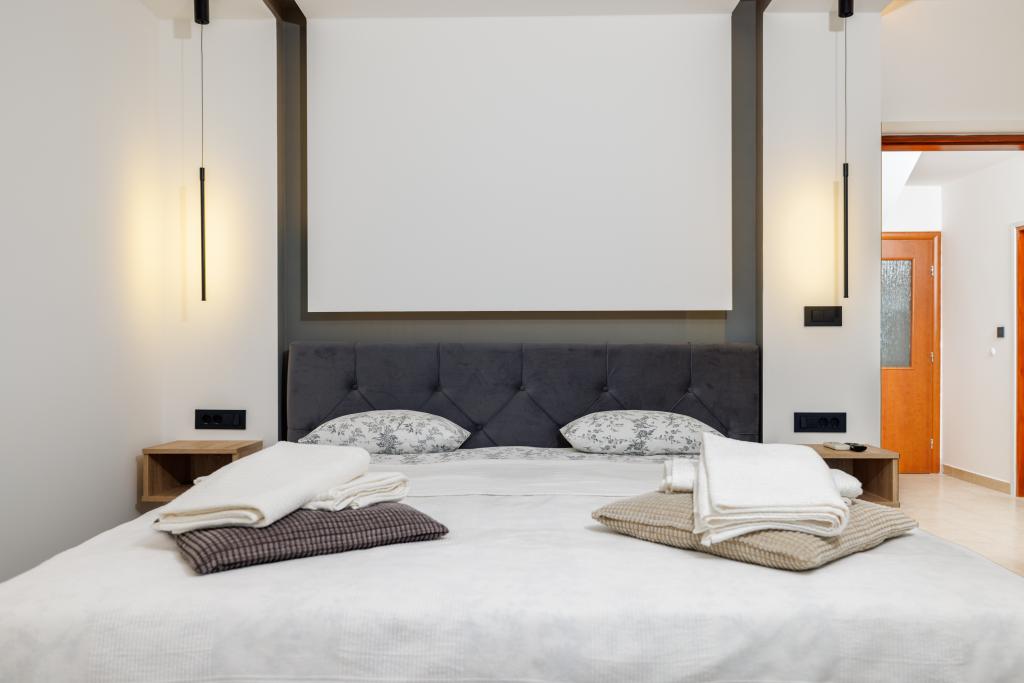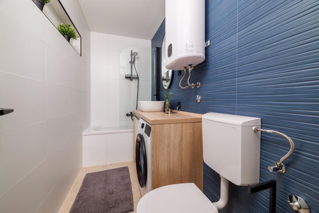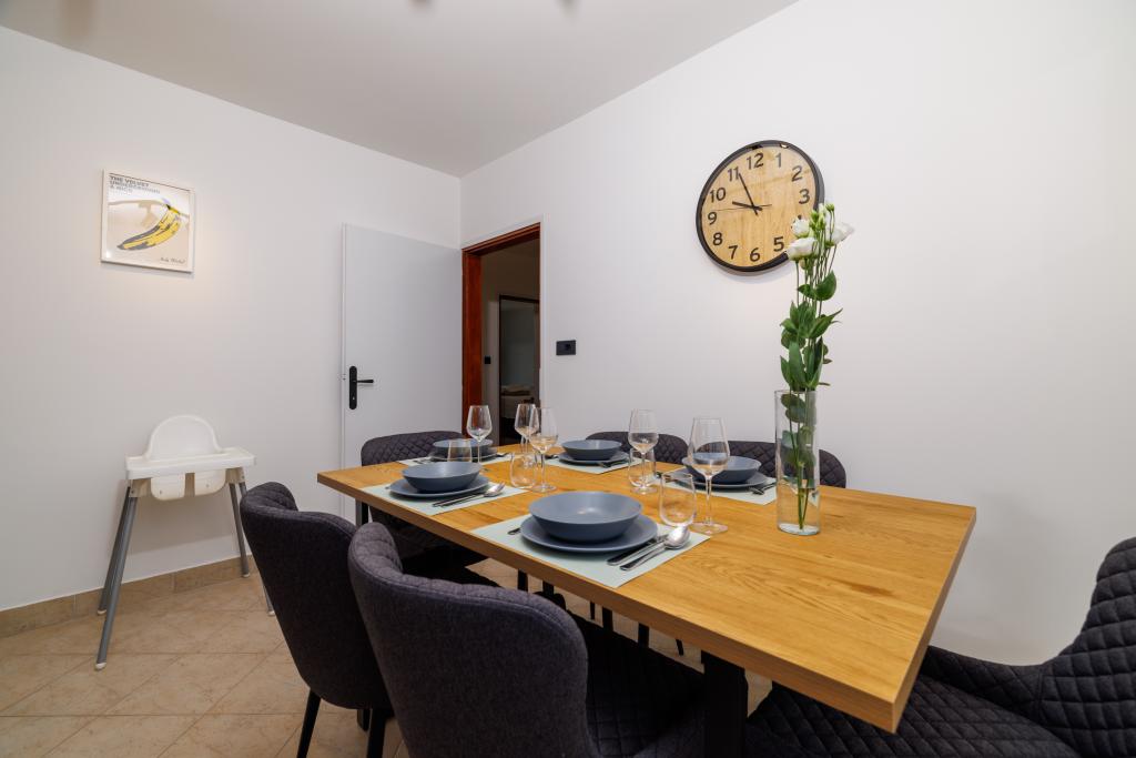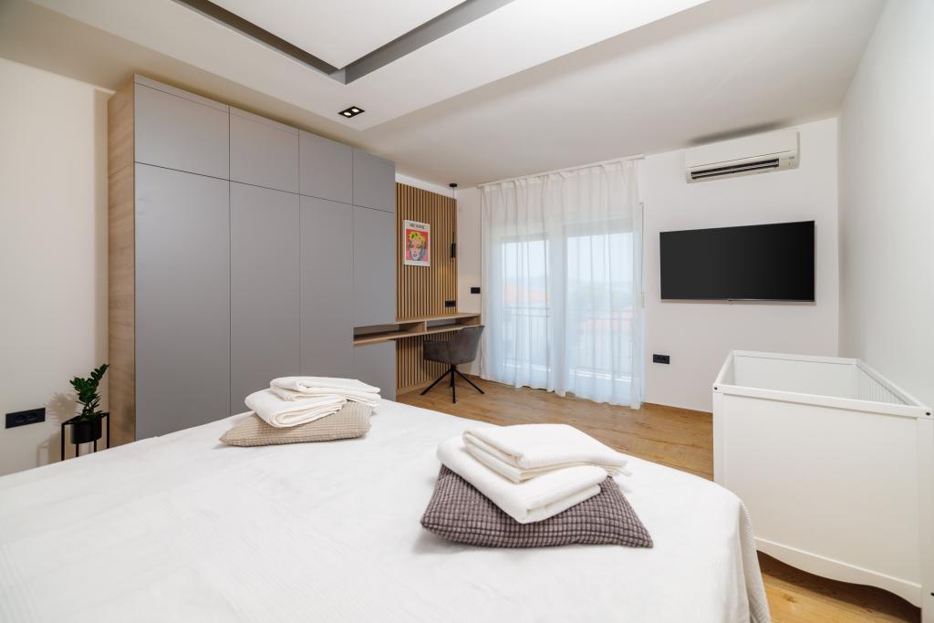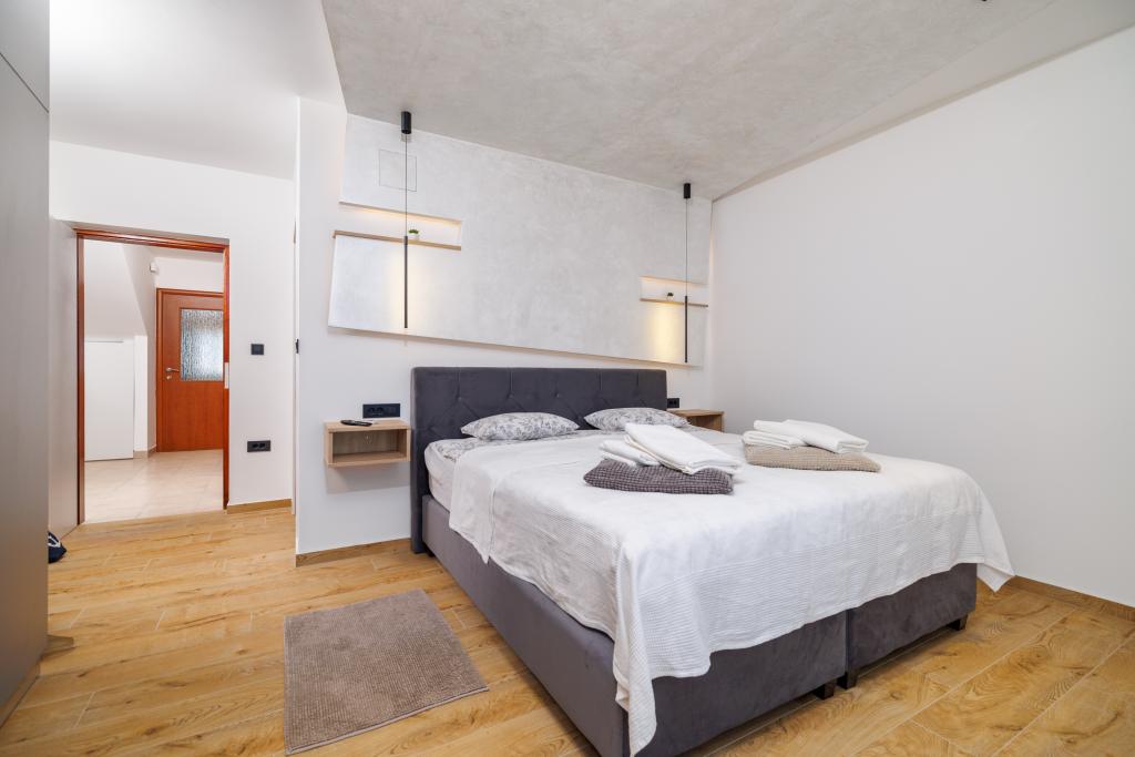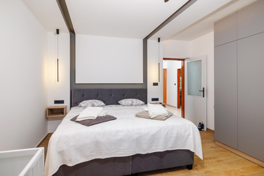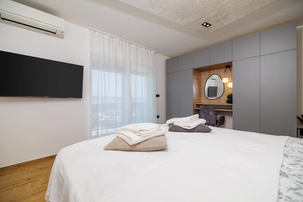 Az újonnan berendezett, modern stílusban teljesen felújított App Mladen a város csendes részén található, mindössze 5 perces sétára a központtól és 2 perces sétára a strandtól. Az apartman alkalmas egy kellemes és nyugodt nyaralásra. A legközelebbi strand mindössze 50 méterre található az apartmantól. A központ közelsége (300 m), az ingyenes parkolás, az internet (wi-fi) és a légkondicionálás további előnyöket kínálunk vendégeinknek. A lakás modern bútorokkal és minden egyéb berendezéssel felszerelt. Nappali (dupla kanapé, csempe, játszótér). Konyha (elektromos főzőlap, sütő, hűtőszekrény fagyasztóval, kávéfőző, mikrohullámú sütő, mosogatógép, vízforraló, konyharuha). Hálószobák: (2 db kétágyas szoba, minden szobában egy franciaágy). Fürdőszobák (fürdőszoba WC-vel, zuhanyzóval és mosdóval, valamint fürdőszoba WC-vel, káddal, mosdóval és mosógéppel). Erkély / terasz (saját erkély, részben fedett, tengerre néző, ülőgarnitúra, erkély mérete: 12m
