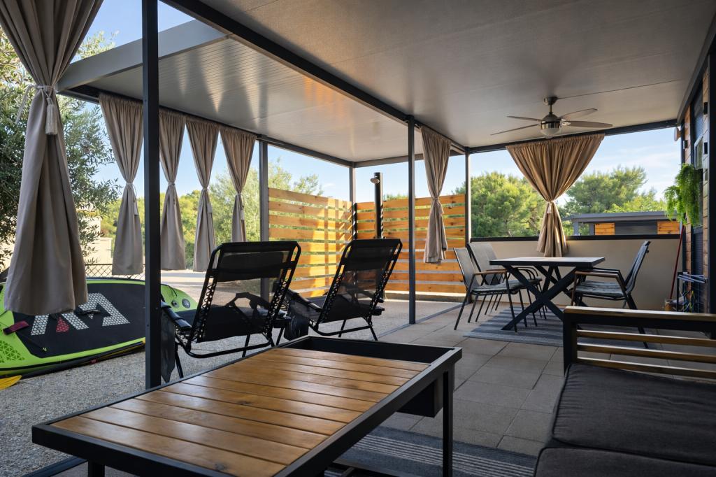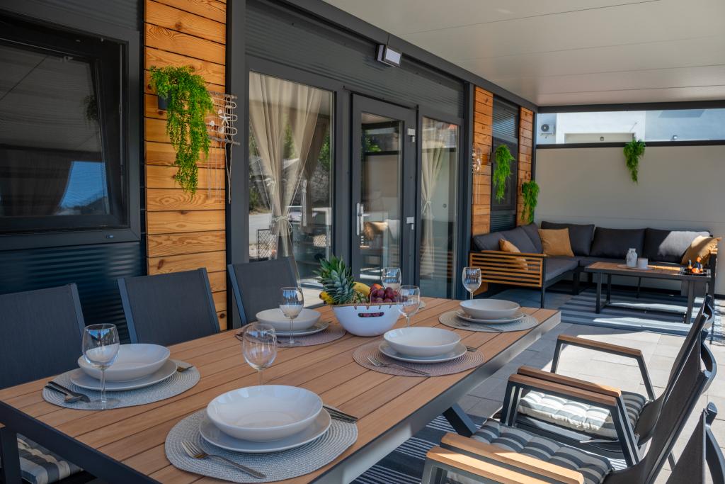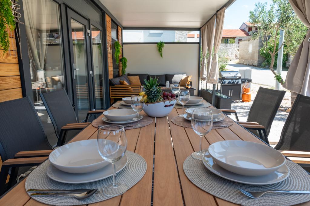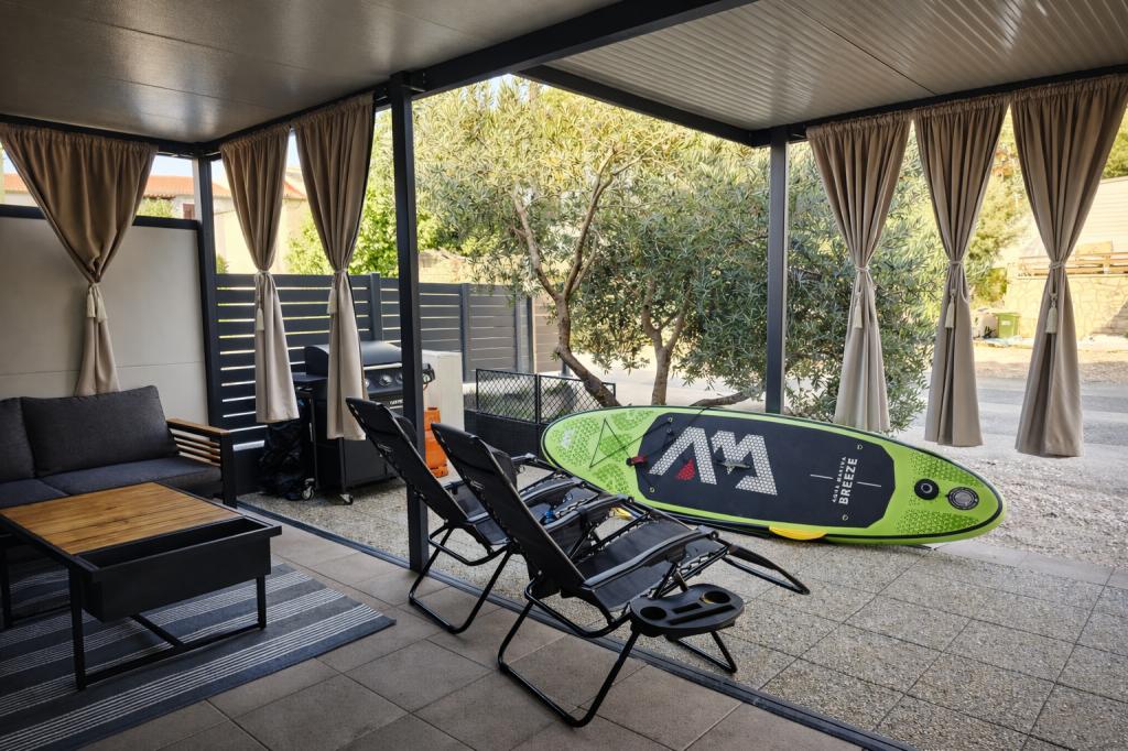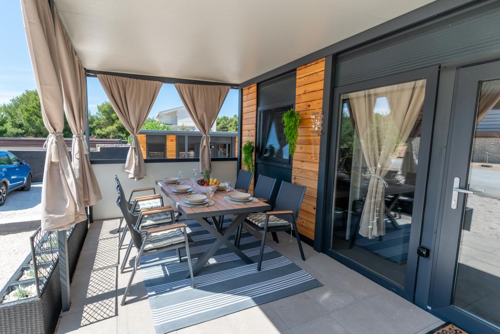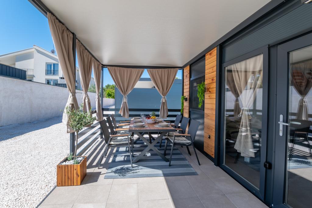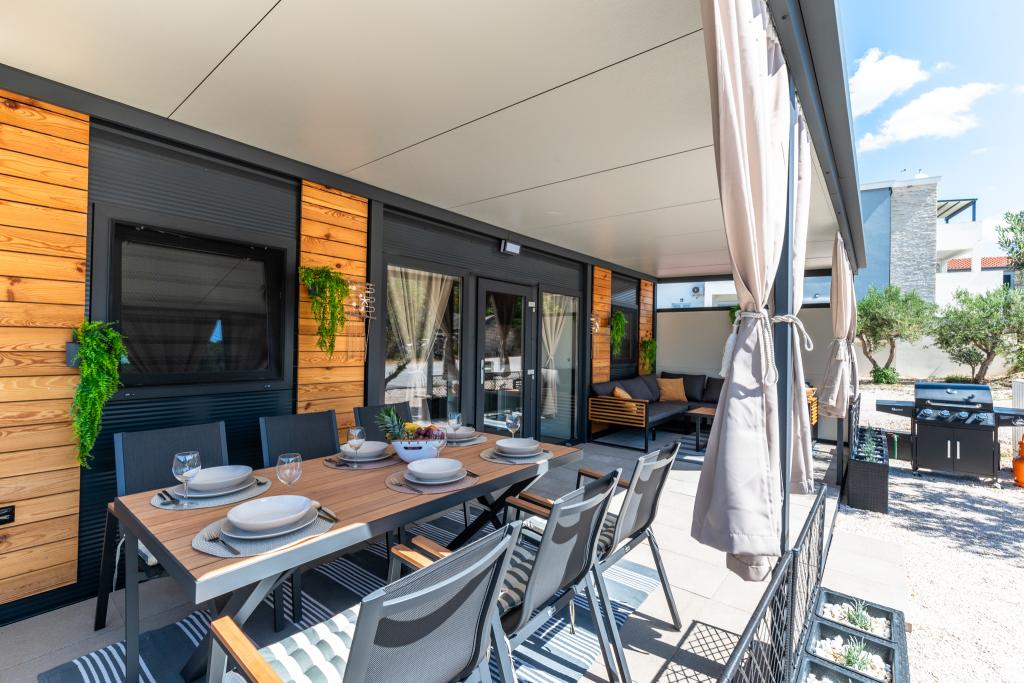 Fedezze fel a tökéletes tengerparti nyaralást bájos mobilházainkban, mindössze 70 méterre a Porat strandtól, a békés Drage faluban! Két házat kínálunk, mindegyikben akár 4 felnőtt és 1 gyermek is elfér. A házak két hálószobával rendelkeznek. Az egyikben egy 160x200-as franciaágy, a másikban pedig egy 140x200-as franciaágy található. Ezenkívül egy kanapéágyon egy legfeljebb 5 éves gyermek is elfér. Minden szoba kényelmes ágyakkal és ágyneművel van felszerelve, biztosítva a megérdemelt pihenést. A nappali modern bútorokkal és TV-vel van felszerelve, amely tökéletes az esti pihenéshez. A konyha teljesen felszerelt minden szükséges készülékkel, beleértve a hűtőszekrényt, tűzhelyet, kávéfőzőt, vízforralót és mikrohullámú sütőt. Élvezze reggeli kávéját vagy esti italát a tágas, 24 m²-es teraszon! Kérjük, minden kérdését kizárólag a kapcsolatfelvételi űrlapon keresztül küldje el!
