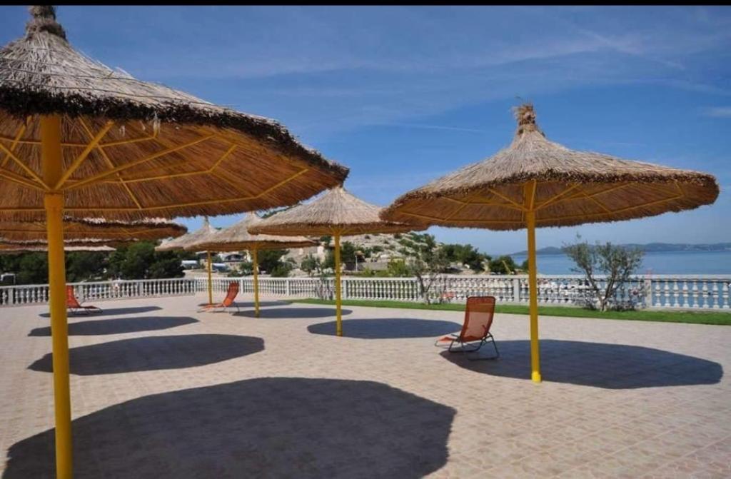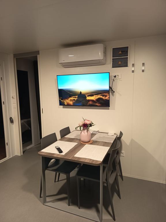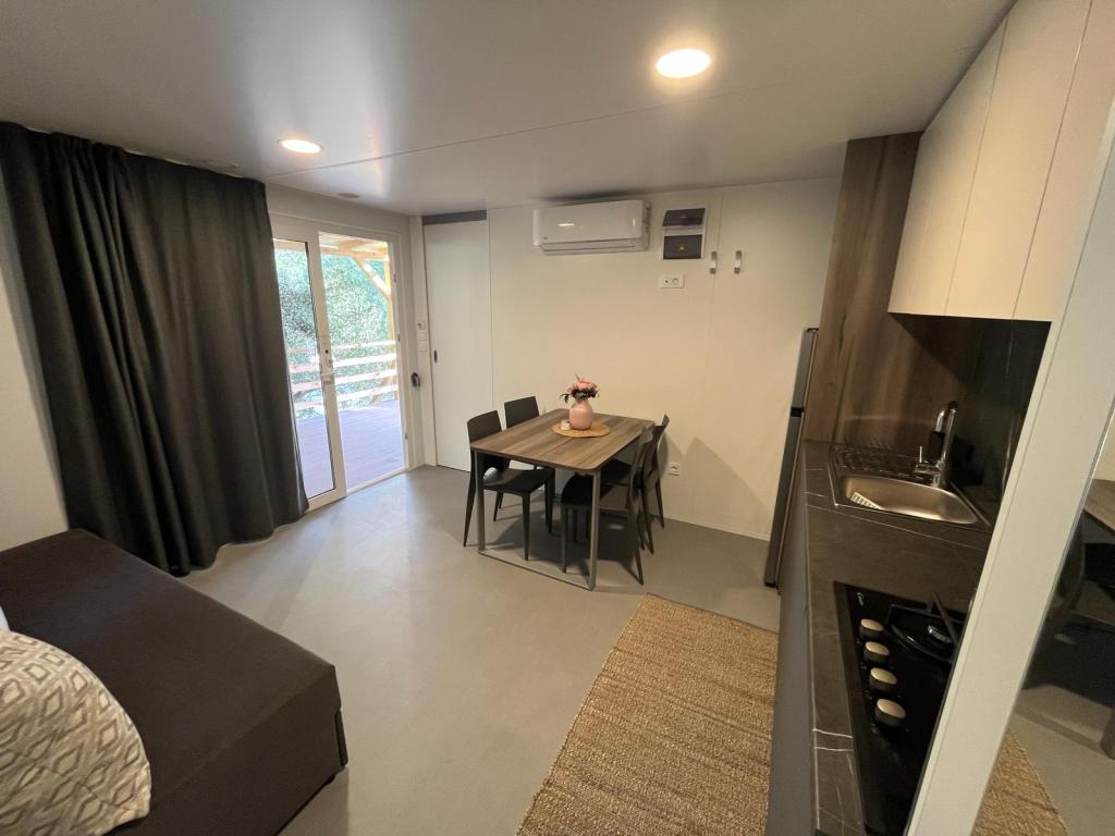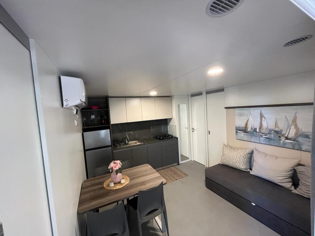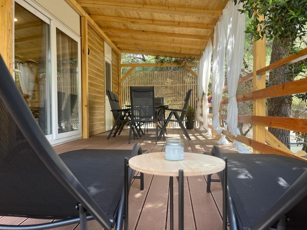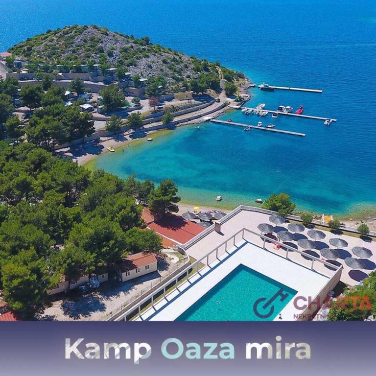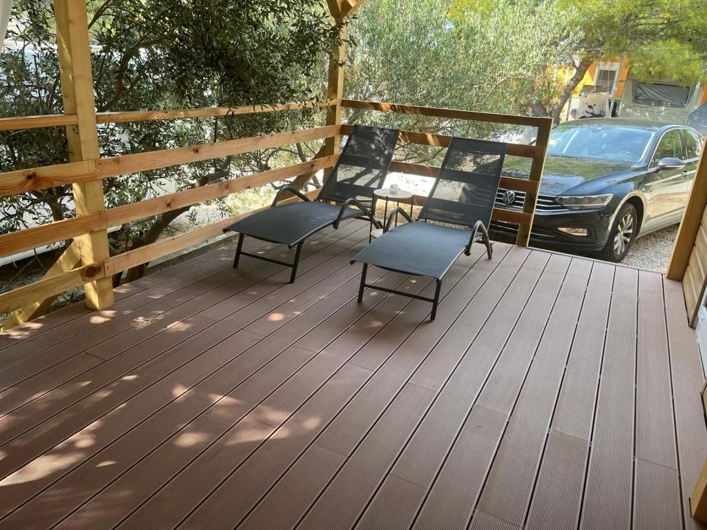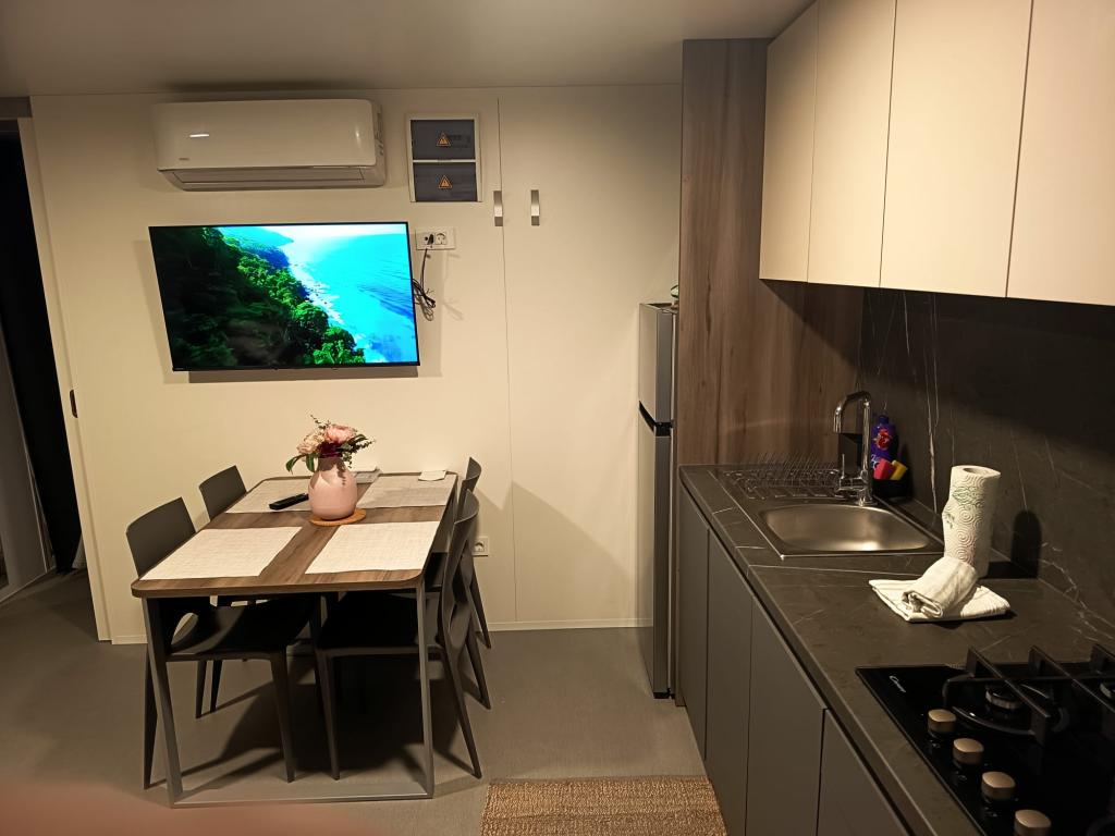 35 m2-es, új, teljesen felszerelt mobilház 24 m2-es terasszal az Oaza Mira kempingben található. A kemping 4****-os kategóriába tartozik. A kempingben található egy fürdőszoba mosógép használati lehetőséggel, teniszpályák, játszótér, étterem, kávézók, úszómedence. A kemping közelében számos kék zászlós strand, kikötő és sétányok is találhatók. Távolság a kempingtől: - Pakoštane 4 km - Biograd na Moru - Vrana-tó 3 km - Zadar 39 km - Krka Nemzeti Park 36 km - Šibenik 24 km - Vodice 20 km A ház a következőket kínálja: - egy szoba egy 160x200 cm-es franciaággyal - egy szoba két egyszemélyes ággyal (90x200 cm) - nappali kihúzható kanapéval 2 fő részére - 2 fürdőszoba zuhanyzóval és WC-vel - 6 fő részére felszerelt konyha - hűtőszekrény fagyasztóval - vízforraló - 4 gázrózsás üvegkerámia főzőlap - mosogatógép - Wi-Fi, Smart TV + Netflix - étkezőasztal + 4 szék - 2 nyugágy, asztal és 6 szék - 2 parkolóhely a mobilház előtt, - ágynemű és törölközők