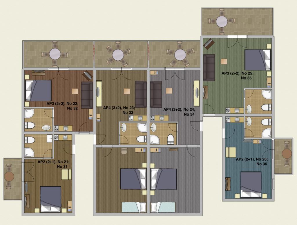 Az apartmanok a ház második és harmadik emeletén találhatók, közvetlenül a tengerparton. Mindhárom apartmantípus (AP2; AP3, AP4) 4, szinte teljesen azonos egységből áll.