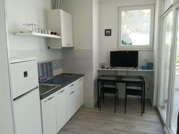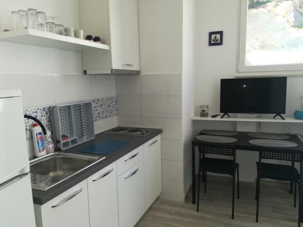 Nagyon kedves és barátságos házigazdák, felújított stúdió - konyhával, fürdőszobával és egy gyönyörű virágterasszal, ami estéket és reggelit kínál kellemesvé. A lakás felszerelése új és funkcionális. A teraszról közvetlenül elérhető a strandok, kb. 20 m Van egy üzlet és számos étterem a közelben. Parkolás a ház alatt. Csendes környéken, 30 percre Omis központjától gyalog. Nagyon örülünk, hogy ezen a helyen maradunk