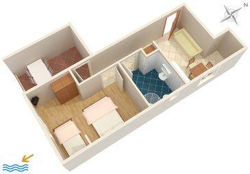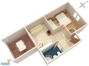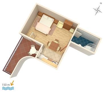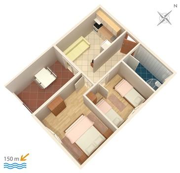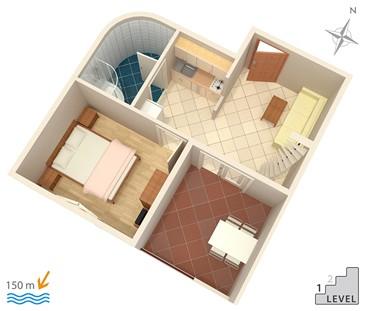 Ház egy csendes zsákutcában, forgalom nélkül. 150m-re vagyunk a strandtól. A strand homokos, nagy sekély, ideális a gyermekek számára. Omis központja 15 perc sétára, Split pedig 25 km-re található.