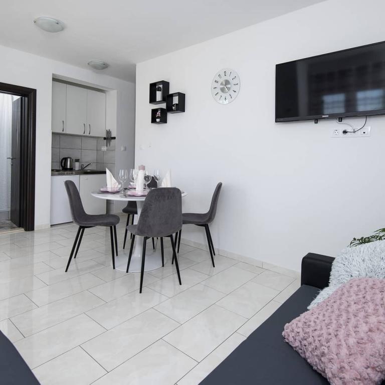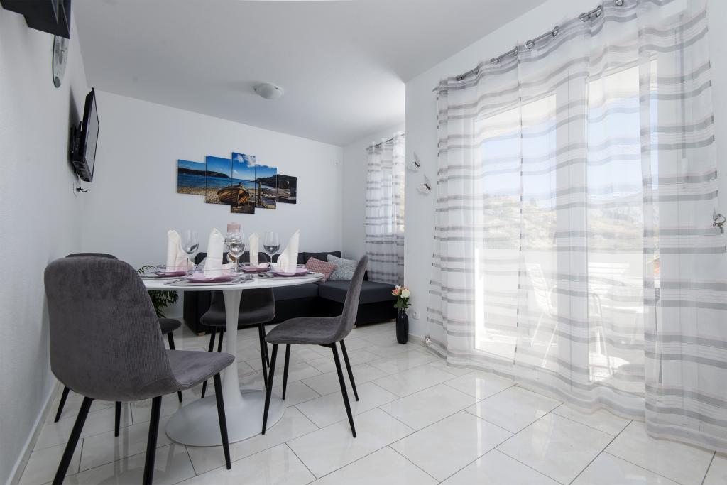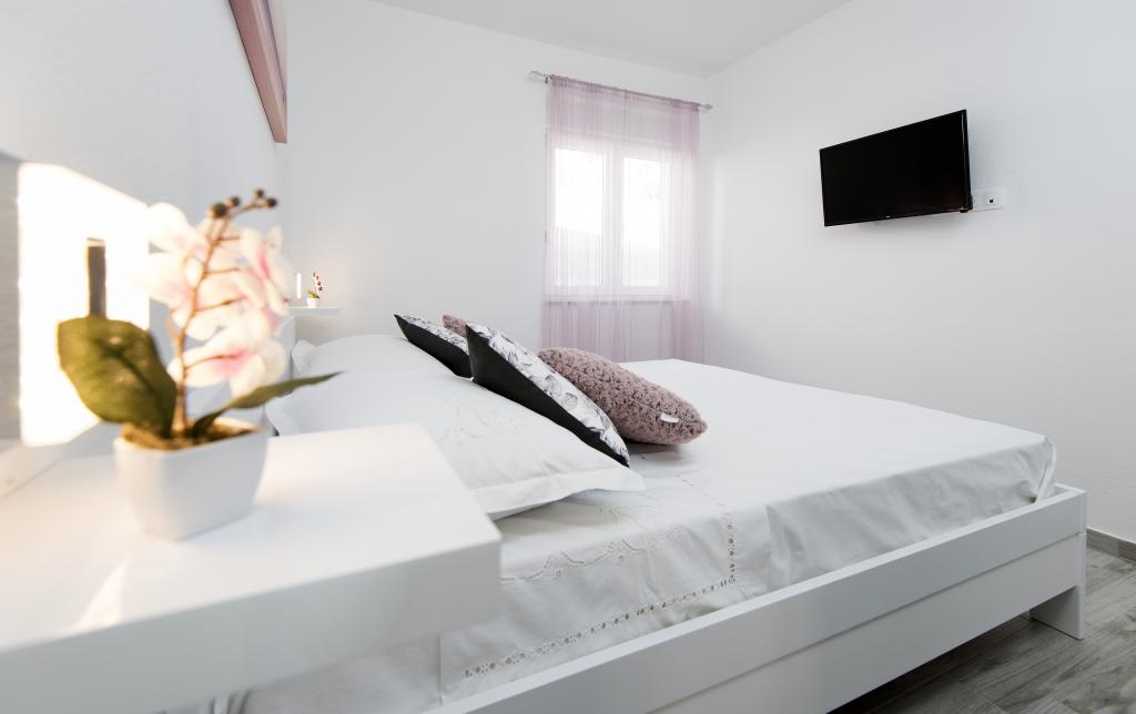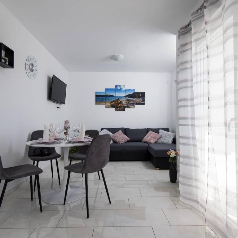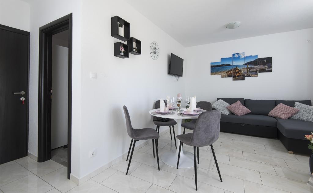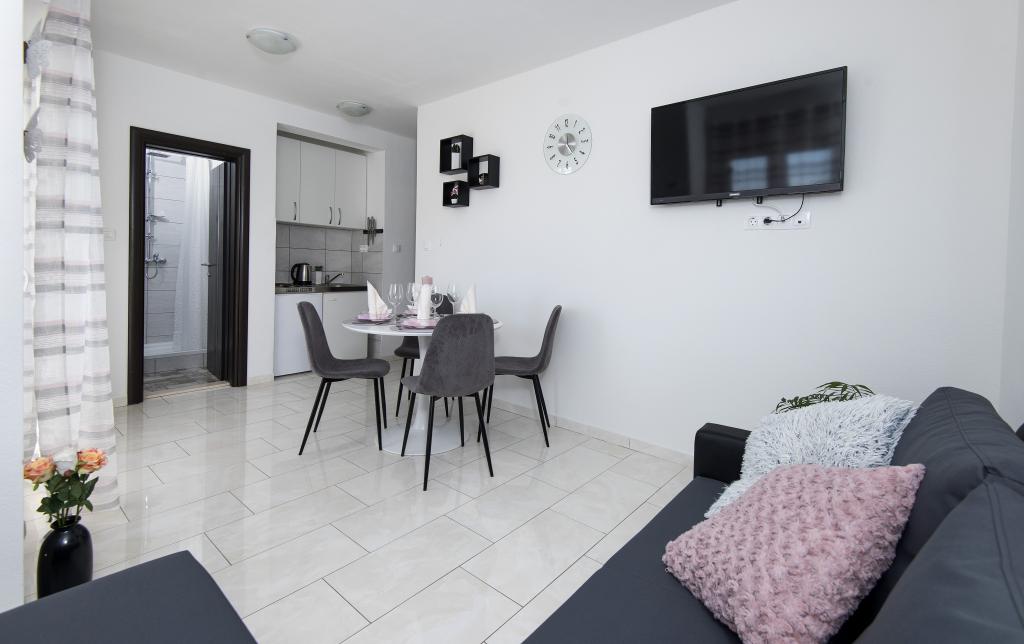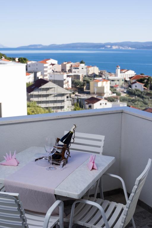 Teljesen felújított, légkondicionált apartmanok tengerre néző kilátással egy csendes turisztikai helyen. Közel a különböző szolgáltatásokhoz, üzletekhez, bárokhoz, éttermekhez. A homokos tengerparton, valamint a tiszta tenger mellett különféle sportolási és szabadidős lehetőségeket kínálnak. Vendégeink kedvezményeket kapnak bizonyos éttermekben, raftingozásban, hajókirándulásokban a Cetina folyó kanyonján, hajókirándulásokon Brac szigetére, jet-ski-ben, csónakkölcsönzésben, valamint a legkisebbeknek banán- és csőutakon. Az ár tartalmazza az internetet, a SAT -ot, a privát parkolást és a szabadtéri grill használatát.