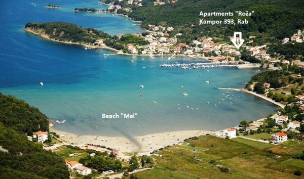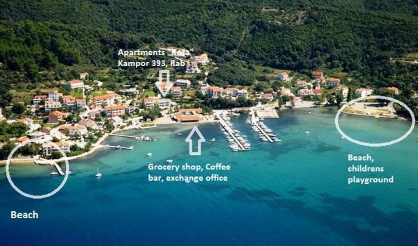 A Roža apartmanok Rab szigetének egyik legszebb öblében, Kampor csendes falujában találhatók, mindössze 30 méterre a tengertől. Tökéletes helyet kínálnak a tengerparti kikapcsolódásra, a nyugalomra és a mediterrán hangulatra. Minden apartmanhoz tengerre néző terasz tartozik, amely ideális egy reggeli kávé elfogyasztásához vagy a naplemente élvezetéhez. Kampor központjában találhatóak, ahol üzletek, kávézók és éttermek könnyen elérhetők. A híres homokos Mel strand, amely különösen alkalmas gyermekes családok számára, körülbelül 10 perces sétára található, míg a legközelebbi beton és kavicsos strandok mindössze néhány perc sétára találhatók. Üdvözöljük a Roža apartmanokban - egy olyan helyen, ahol a tenger, a béke és a kényelem tökéletesen kiegészítik egymást.