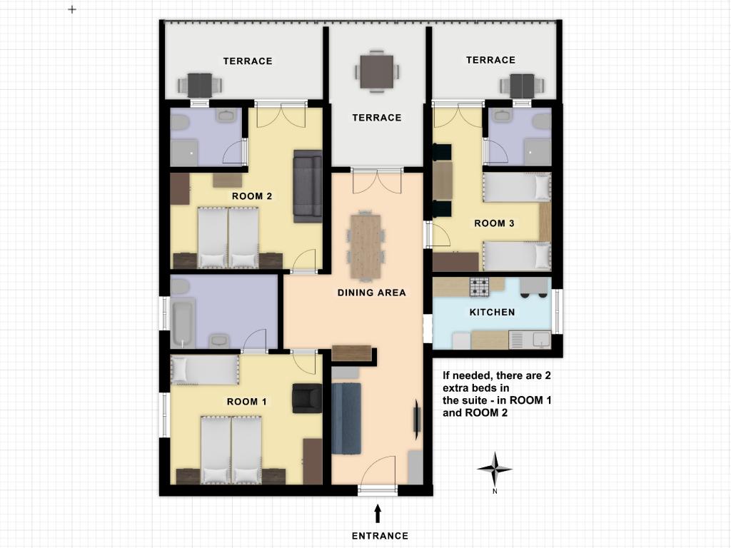 Klek központjában található, az első sorban a tenger felé, mindössze tíz méterre a strandtól és a hely által kínált szolgáltatások többségétől. A házon belül parkoló és grillező áll a vendégek rendelkezésére. Az apartmanok légkondicionáltak, TV-vel, WiFi-vel felszereltek, és mindegyikhez tengerre néző terasz tartozik. A nagy apartmanban a nappali, étkező és konyha mellett három különálló hálószoba található, melyek mindegyike saját fürdőszobával, légkondicionálóval és teraszkapcsolattal rendelkezik.