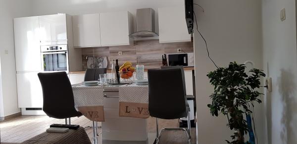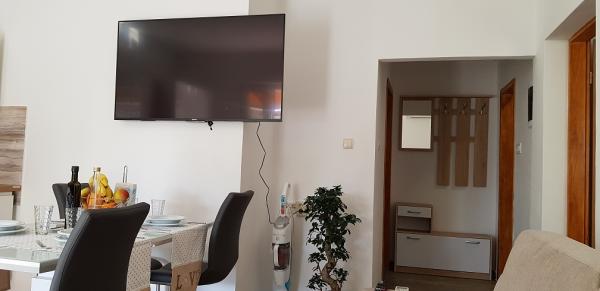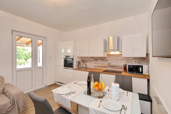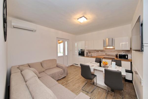 Az újonnan berendezett apartman (4 1) a családi ház földszintjén található, mindössze 70 méterre a tengertől, és egy sekély homokos strand, amely kisgyermekes családok számára alkalmas. Az apartman konyhából és nappaliból áll, kihúzható fotelekkel, nagy napernyős terasszal, két hálószobával, fürdőszobával, közös grillezővel és saját parkolóval. A lakás légkondicionált, konyhai felszereléssel és edényekkel felszerelt. A konyha és a nappali modern háztartási eszközöket tartalmaz, mint például hűtőszekrény fagyasztóval, sütő, indukciós lemezek, mikrohullámú sütő, mosogatógépek, műholdas és on-line televíziók és internet.