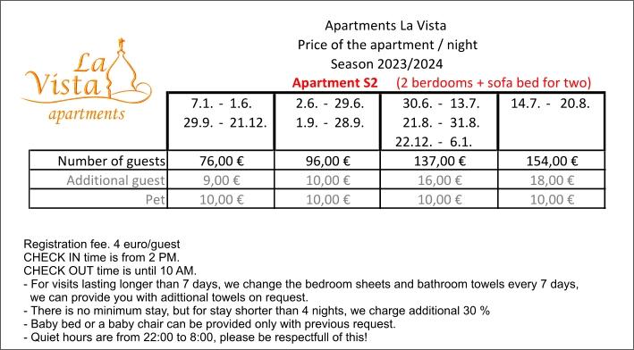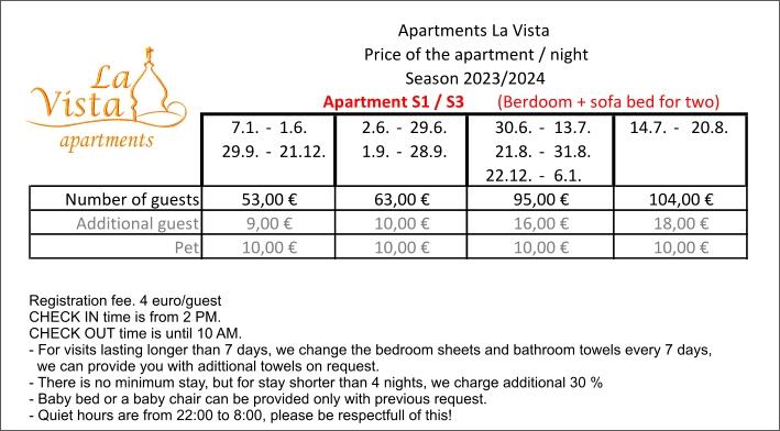 Tovább Kevesebb képekMinden kérdéssel és foglalással forduljon hozzánk e-mailben. Vendég regisztráció - 4,00 EUR / fő. Környezetvédelmi adó - 0,15 EUR fő/nap, 12 éves korig nem kell környezetvédelmi adót fizetni. 4 éjszakánál rövidebb tartózkodás esetén a szállás ára 30%-kal emelkedik. A szállás ára tartalmazza a távozás utáni takarítást és a tartózkodási (idegenforgalmi) adót.