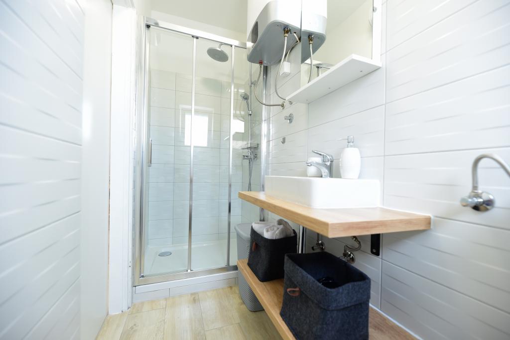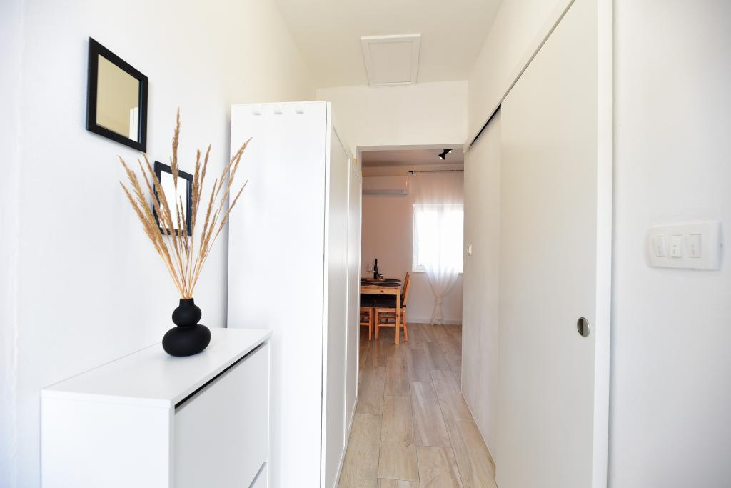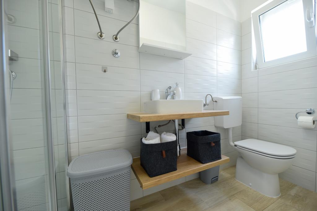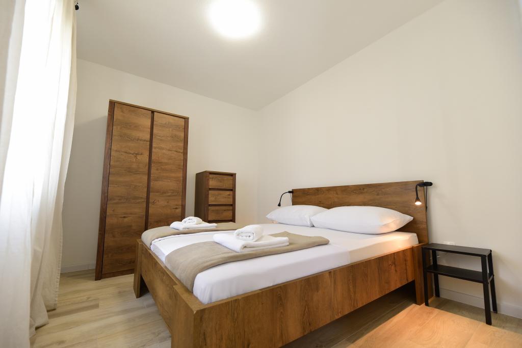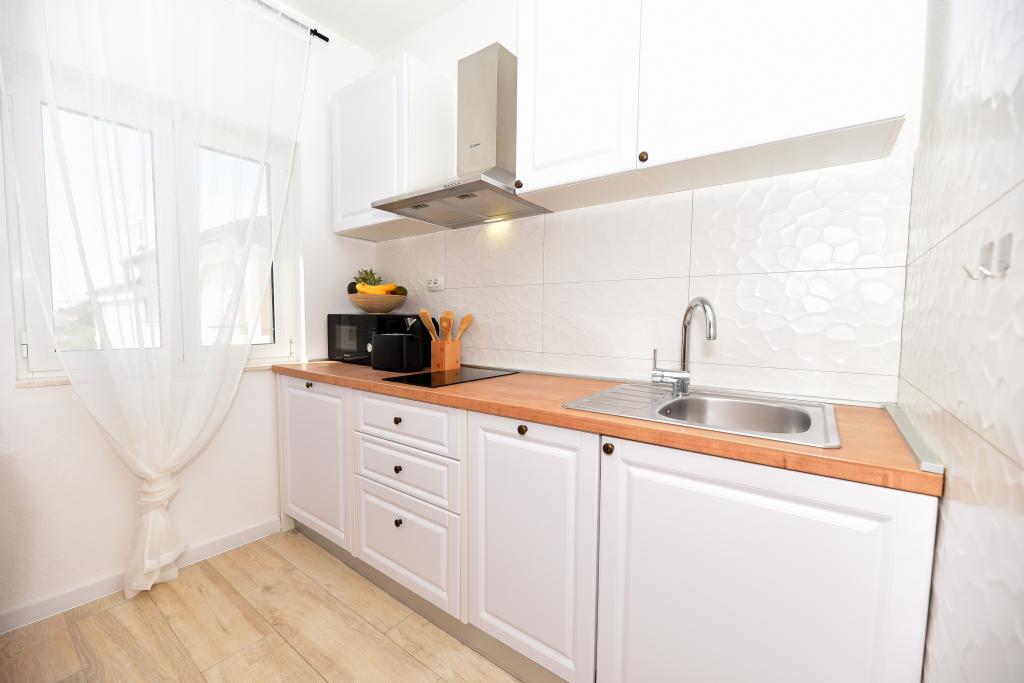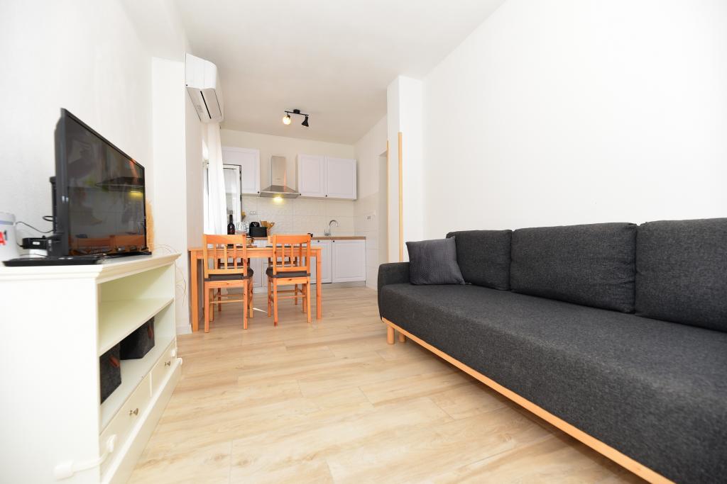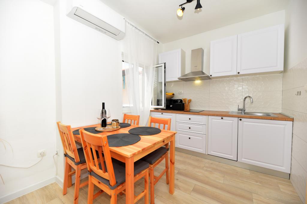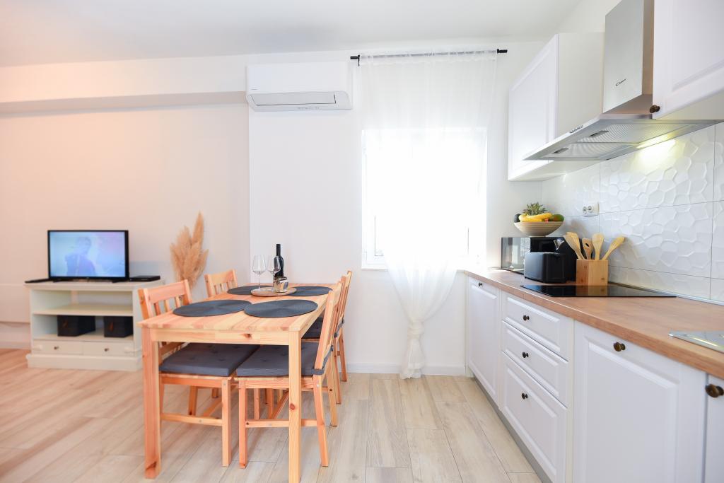 Tengertől és strandtól 50 m-re a tengertől és a strandtól 50 m-re található tetszetős sorházban található modern berendezésű apartman, teljesen felszerelt terasszal, garázzsal és mosógépes szobával ideális egy csendes családi nyaraláshoz.