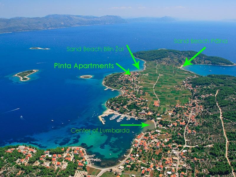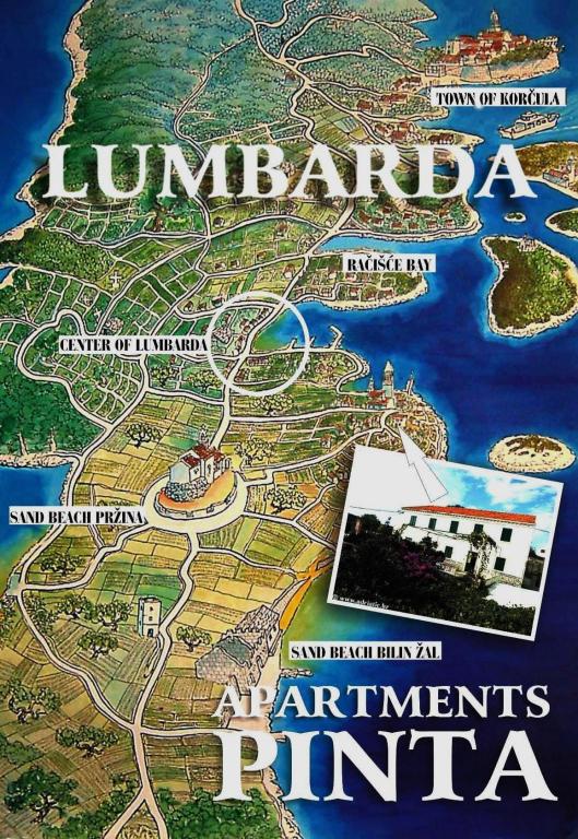 Az Apartments Pinta épülete Korčula szigetén, Lumbarda kisvárosának régi és csendes részén található. Bilin žal és Pržina homokos strandjaitól 5-10 perc sétára, Lumbarda központjától pedig 10 percre találhatók. Családunknak nagy hagyománya van az utazók boldoggá tételében. 1928-ban őseink PINTA néven megnyitották az első panziót Lumbardában. Az 1980-as években a házat lakásokká alakították, 2012-ben pedig teljes körűen felújították, ami a régi építés szépségét hozta elő. A rendelkezésre álló kapacitások és a nagy teraszok egy házba kapcsolással egy nagyobb vendégkör számára jelentik a közös nyaralás lehetőségét, akik egyidejűleg minden lakásban saját kényelemmel rendelkeznek. Az Ön rendelkezésére áll: Kétszemélyes apartmanok - az első emeleten találhatók (nagy terasszal), 5 személyes apartmanok - a ház földszintjén és emeletén (terasz és erkély); Négyszemélyes apartman az első emeleten, saját nagy erkéllyel.
