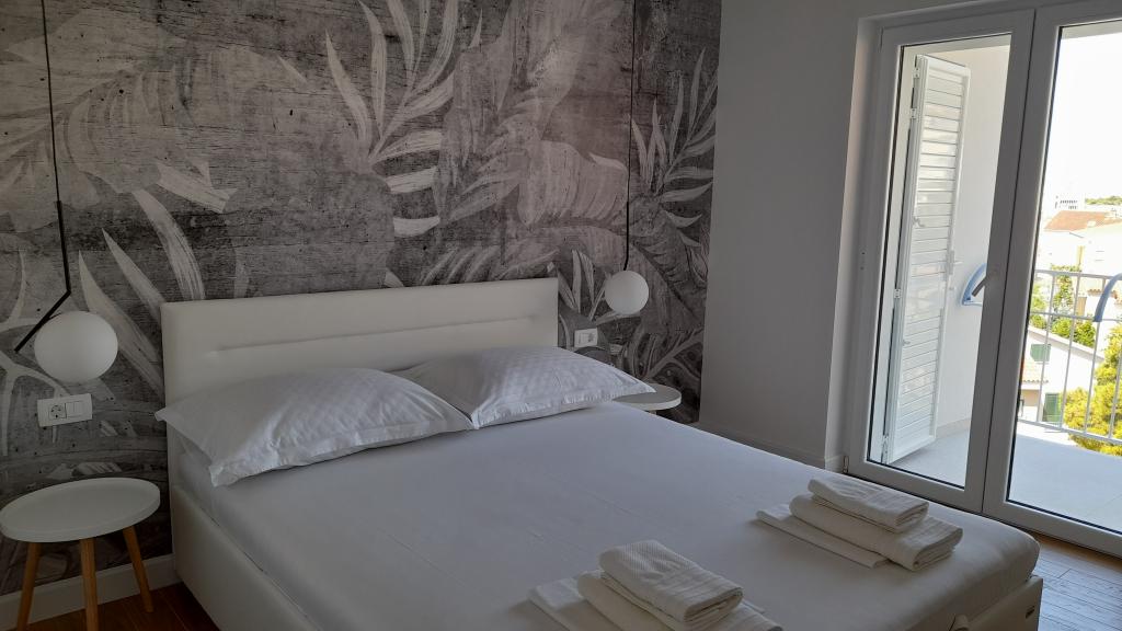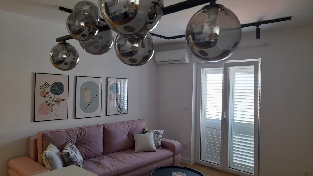 Modern apartman egy épület harmadik emeletén, terasszal, kilátással a tengerre és a Biokovo-hegyre. Az apartmanban konyha, nappali étkezővel, hálószoba és fürdőszoba található.
