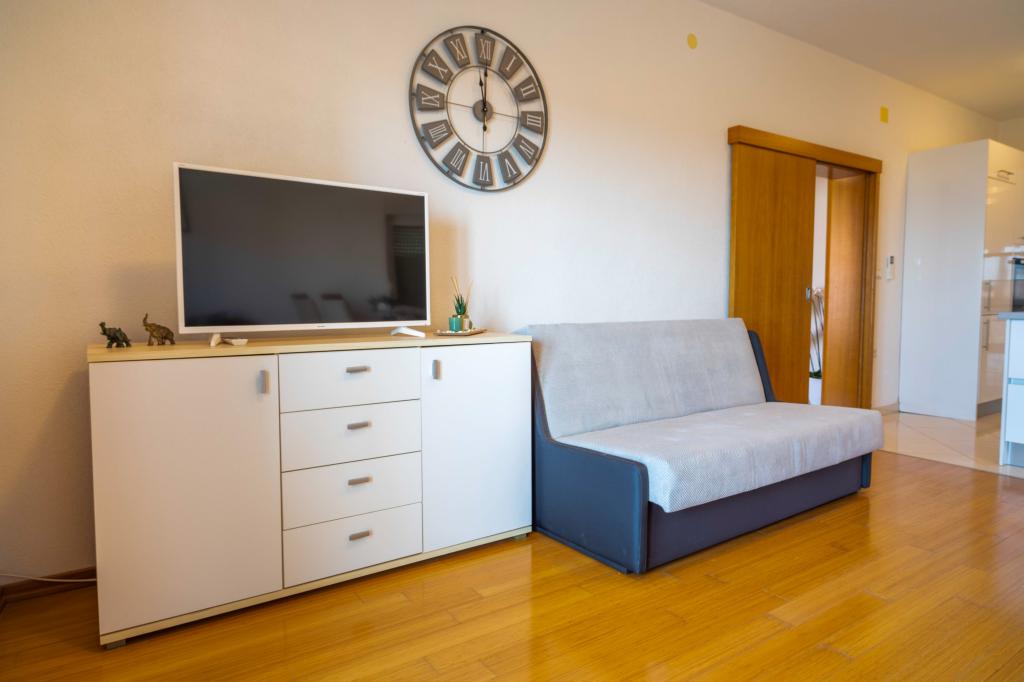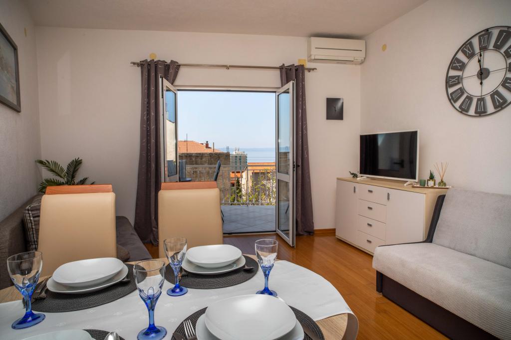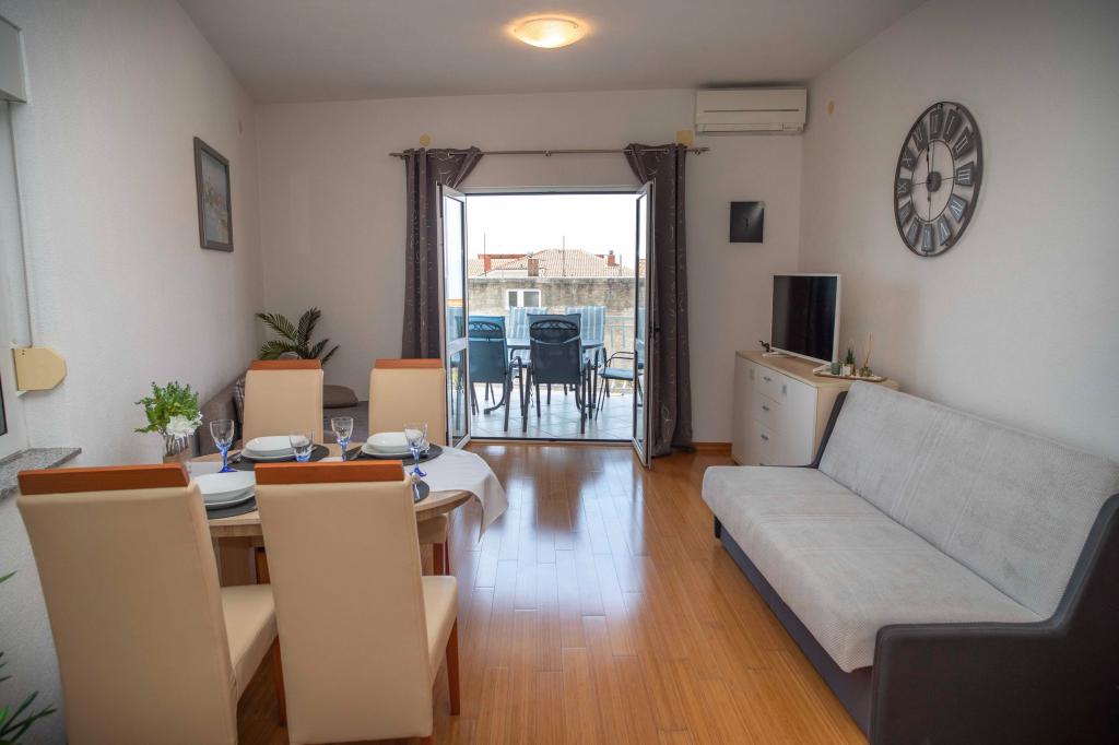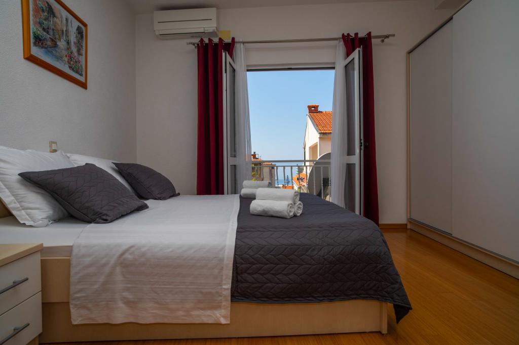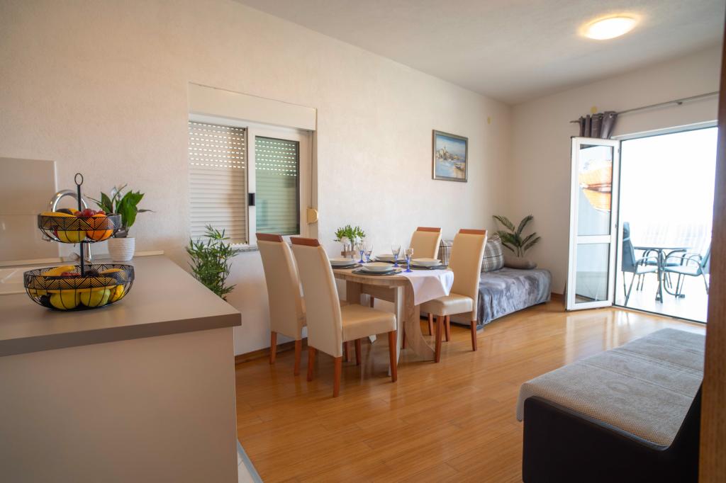 Üdvözöljük az "Ivana" apartmanban, kilátással a tengerre és egy garázzsal. Ideális 2 felnőtt és 4 gyermek számára. Az apartmanban egy hálószoba, egy fürdőszoba, egy nappali 2 kanapéval és egy teljesen felszerelt konyha található. A nappaliban és a hálószobában klímaberendezések találhatók.