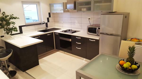A modern, teljesen berendezett lakás a legvonzóbb része a Makarska. A létesítmény található, 5 percre a strandtól és a sétánytól tele különböző eszközök, mint például a bárok, éttermek, ajándéküzletek, és így tovább. A házban, ahol a lakás egy gyógyszertár és egy szupermarket. Közel mint 10-20 m csendes kávézók, pékségek, orvos, gyermekorvos, ATM, újságos és üzletek. A lakás konyha, nappali, három hálószoba, három fürdőszoba, nagy terasz és erkély. A lakás egy gyönyörű kilátás nyílik a tengerre, a szigetek, a városközpont és a hegy lejtőjén. A lakás fel van szerelve légkondicionálóval, ami egy kicsit a lakásban, mosogatógép, mosógép, TV, síkképernyős TV-vel, ingyenes WIFI, mikrohullámú sütő. A vendégek használhatják a mosoda és törölközőt, valamint egyéb forgatható.