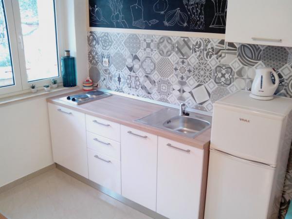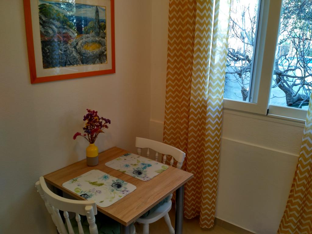 A lakás szerény, de minden megvan benne, amire egy nyaralás során szükség lehet. Még vasaló is van, a férjem nagy örömére, haha. Könnyedén lehet vacsorát főzni a lakásban, kézzel mosni (szárítókötelek vannak az ablakon kívül). A környék csendes és békés, kilátással két gyönyörű fára: egy fügefára és egy olajfára, és a mögöttük lévő hegyre. Kruno, a házigazdánk, nagyon barátságos és segítőkész. Mosolyogva üdvözölt minket, és ugyanazzal a mosollyal búcsúzott el tőlünk. Köszönjük, Kruno, a csodálatos tartózkodást!