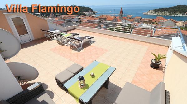 A Villa Flamingo apartmanjai és szobái a városközpontban, a főúttól távol, csendes környezetben találhatók, nagy kerttel és parkolóval. Minden a városközpontban található, az apartmanok a főtértől 100 m-re, a vízparttól 300 m-re, a strandtól 500 m-re találhatók. Az apartmanok távol esnek a főúttól, így garantáljuk a békés és csendes nyaralást. A ház előtt, a kertben található egy nagy kandalló, ahol grillezett ételeket készíthet, és vacsorázhat a kertünk gyönyörű hangulatában. Az erkélyről kilátás nyílik a tengerre és a város kikötőjére, valamint Brač és Hvar szigeteire. Minden apartman légkondicionált, műholdas TV-vel és WiFi internettel felszerelt. A vendégekkel egyeztetve megszervezzük a transzfert a repülőtérről az apartmanba. Az apartmanokban vezeték nélküli internet-hozzáférés biztosított. A ház tetején egy nagy terasz található, ahonnan csodálatos kilátás nyílik a tengerre és a városra, minden vendégünk számára. Lehetőség van reggeli, ebéd, vacsora megszervezésére egy közeli étteremben.