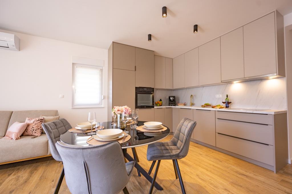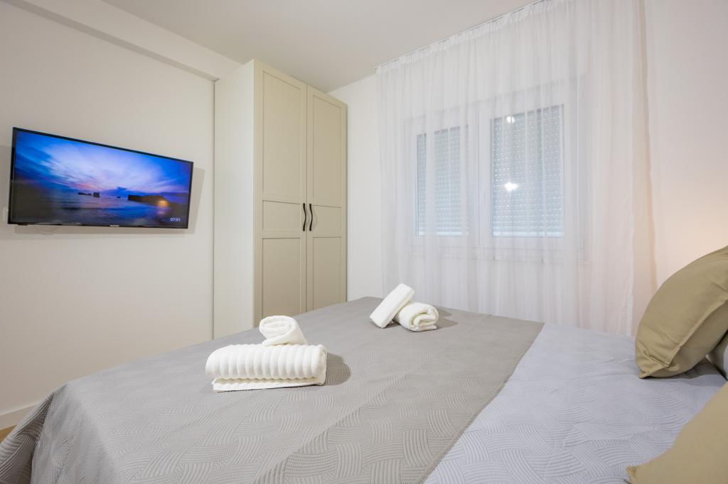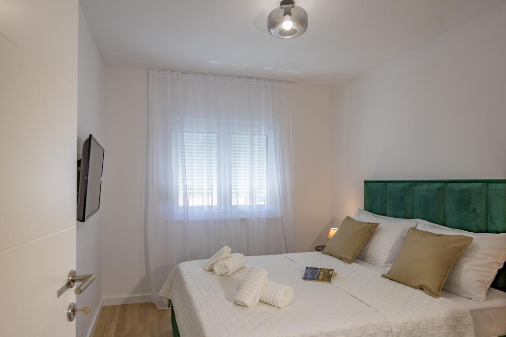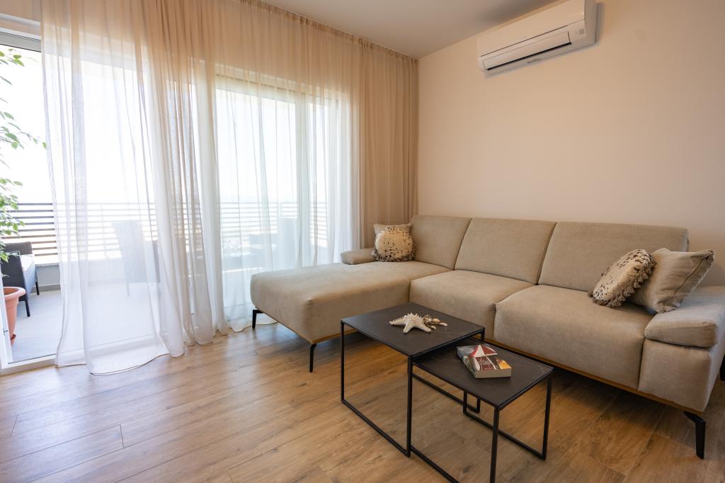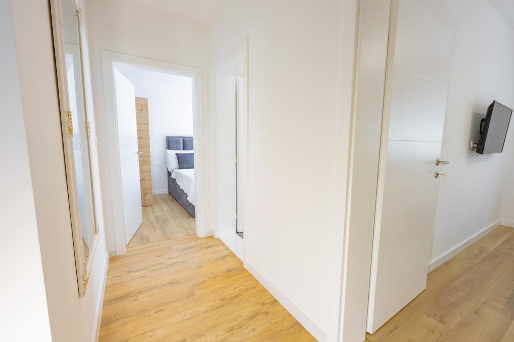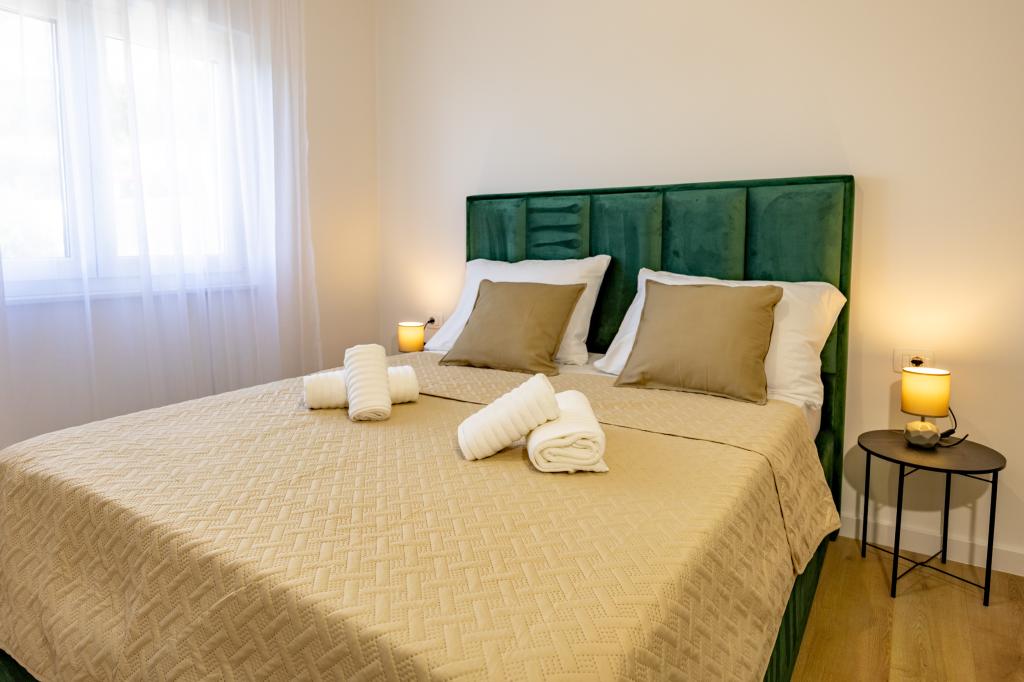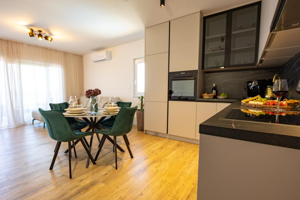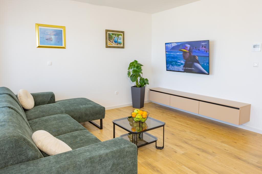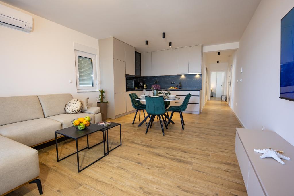 Minden apartman modern dizájnt és felújított belső teret kínál. A tágas nappaliban, ízléses bútorokkal és modern részletekkel otthon fogja érezni magát. A nyitott koncepció természetes módon köti össze a nappalit egy teljesen felszerelt konyhával, ahol elegáns munkalapok, minőségi készülékek és minden tér várja, amire szüksége lehet kedvenc ételei elkészítéséhez. A nappaliból egy kellemes erkélyre nyílik ki - ideális hely a reggeli kávéhoz vagy az esti pihenéshez egy pohár borral és egy felejthetetlen naplementével az Adriai-tenger felett. Minden apartmanban két kényelmes hálószoba található dupla ággyal, puha ágyneművel és rengeteg tárolóhellyel, egy modern fürdőszoba és egy további WC. Az apartmanok légkondicionáltak és teljesen felszereltek: TV/SAT, internet, mosógép, mosogatógép, kávéfőző és minden, amire szüksége van egy kényelmes és gondtalan tartózkodáshoz. Az ingyenes parkolás a strand közelében benne van a bérleti díjban!