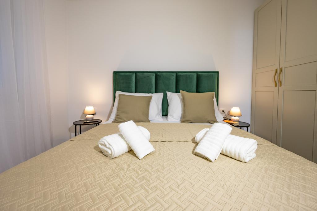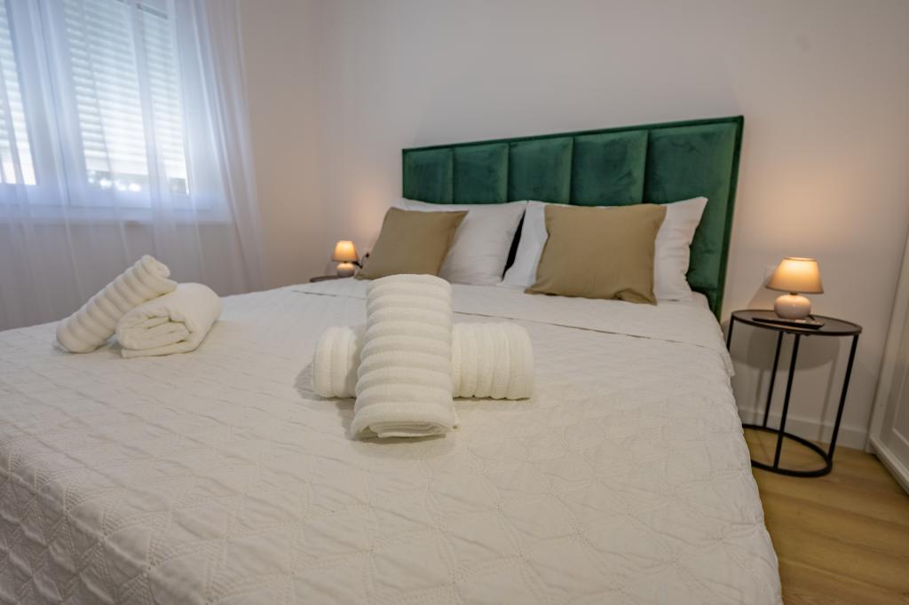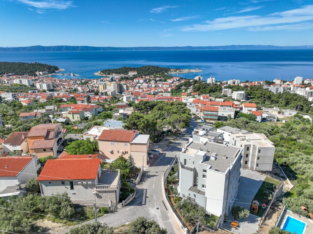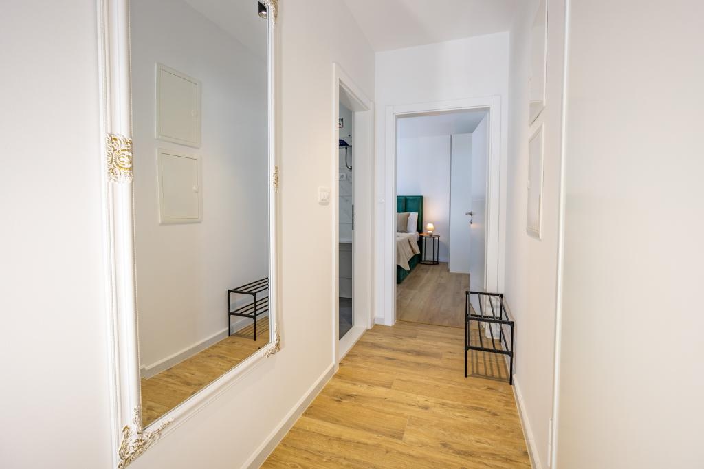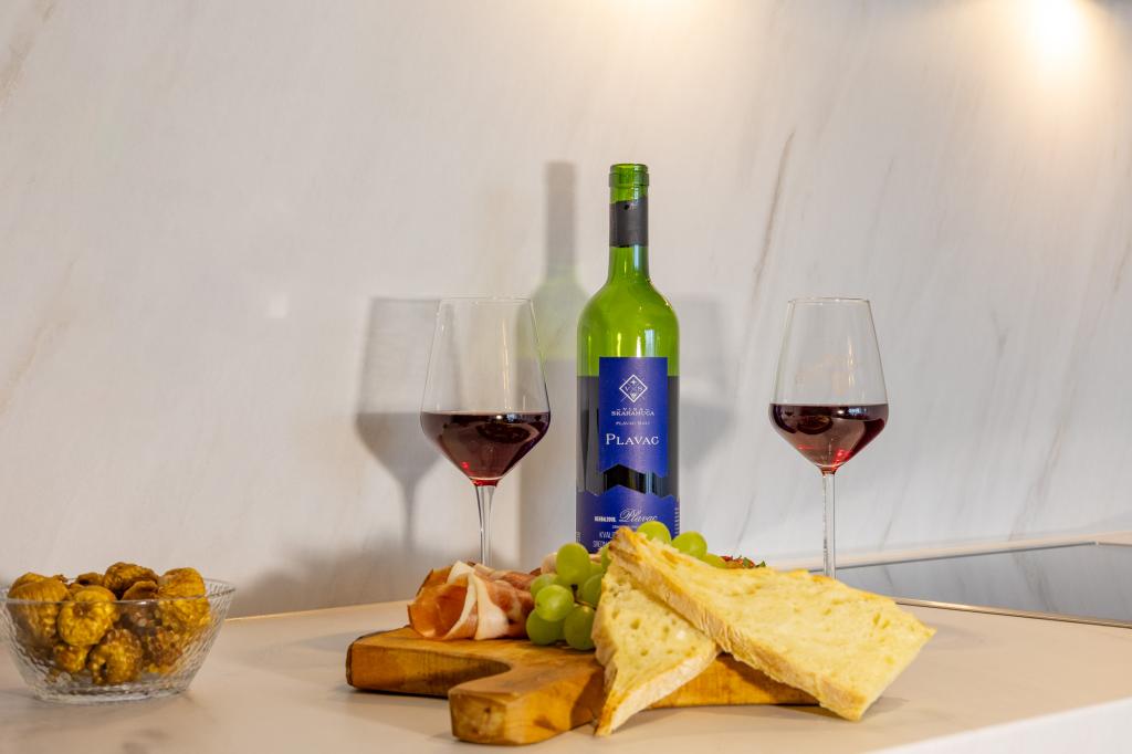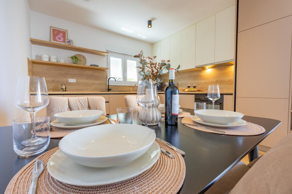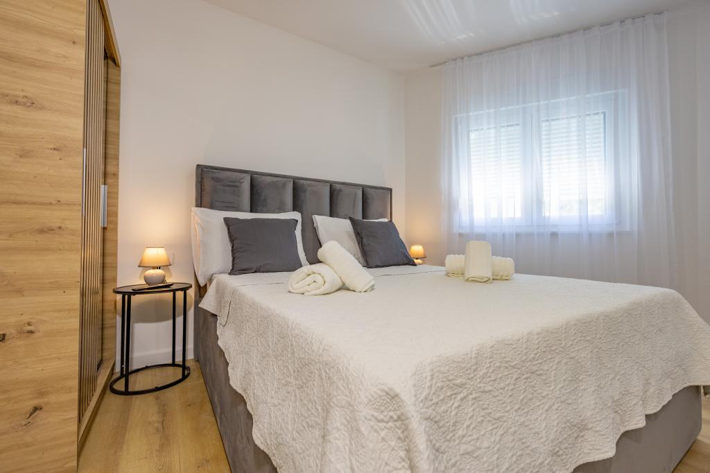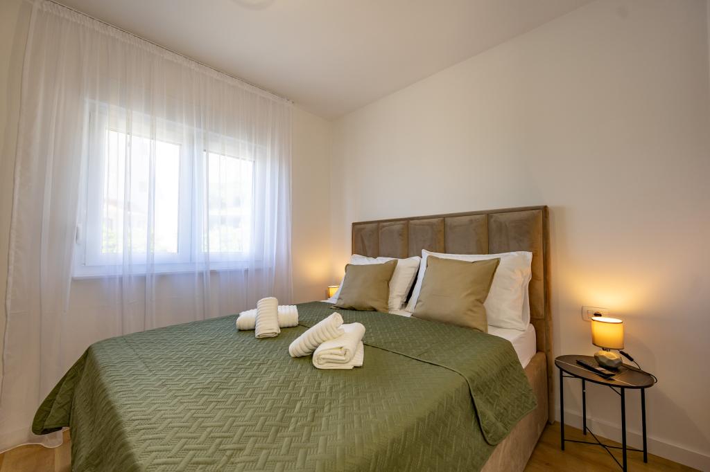 Minden apartman modern dizájnt és felújított belső teret kínál. A tágas nappaliban, ízléses bútorokkal és modern részletekkel otthon fogja érezni magát. A nyitott koncepció természetes módon köti össze a nappalit egy teljesen felszerelt konyhával, ahol elegáns munkalapok, minőségi készülékek és minden tér várja, amire szüksége lehet kedvenc ételei elkészítéséhez. A nappaliból egy kellemes erkélyre nyílik ki - ideális hely a reggeli kávéhoz vagy az esti pihenéshez egy pohár borral és egy felejthetetlen naplementével az Adriai-tenger felett. Minden apartmanban két kényelmes hálószoba található dupla ággyal, puha ágyneművel és rengeteg tárolóhellyel, egy modern fürdőszoba és egy további WC. Az apartmanok légkondicionáltak és teljesen felszereltek: TV/SAT, internet, mosógép, mosogatógép, kávéfőző és minden, amire szüksége van egy kényelmes és gondtalan tartózkodáshoz. Az ingyenes parkolás a strand közelében benne van a bérleti díjban!