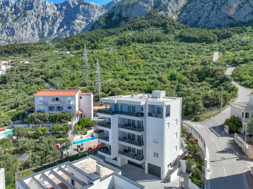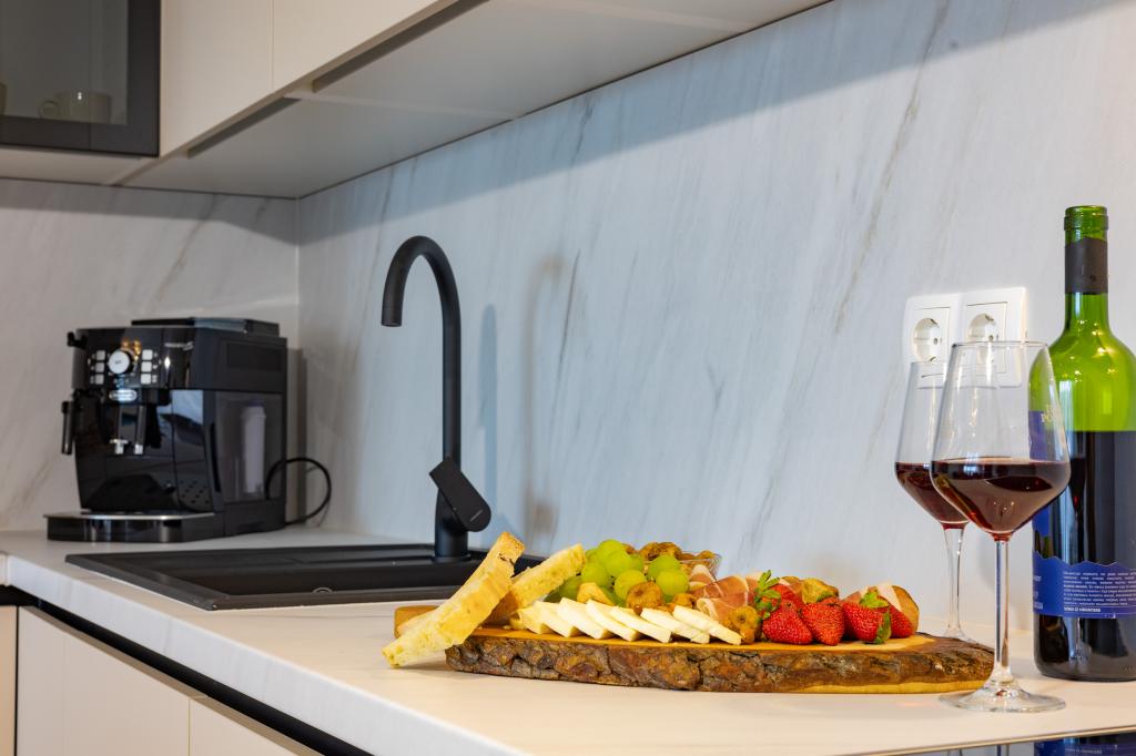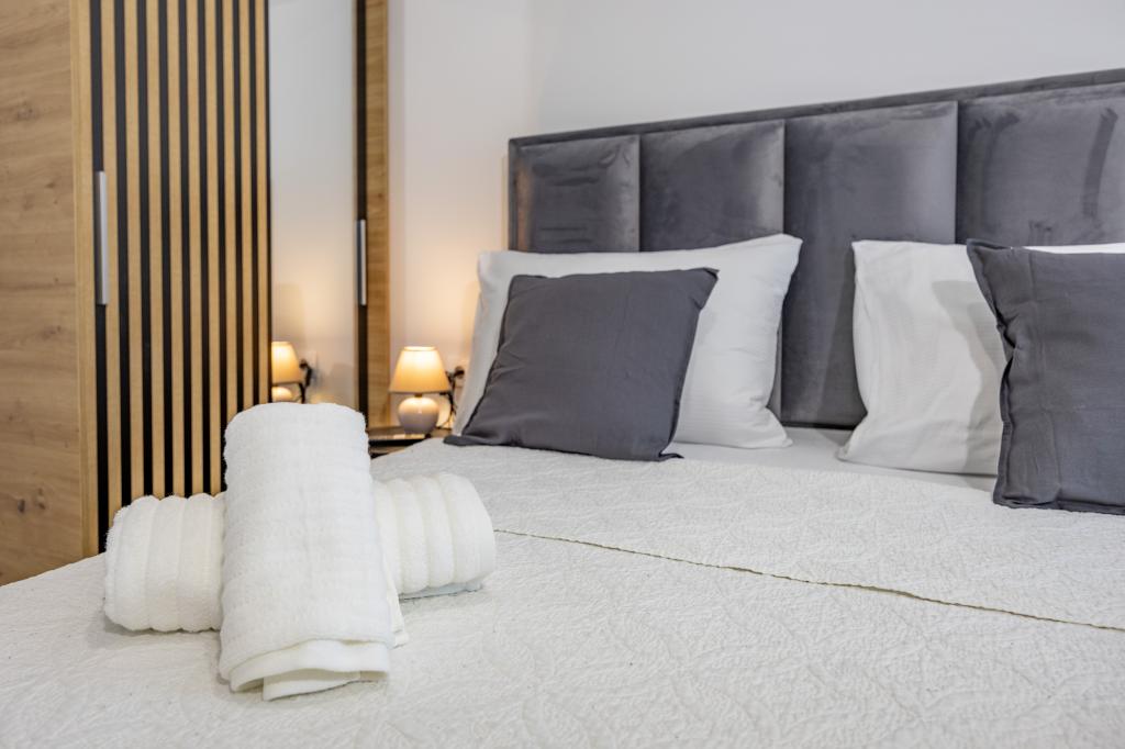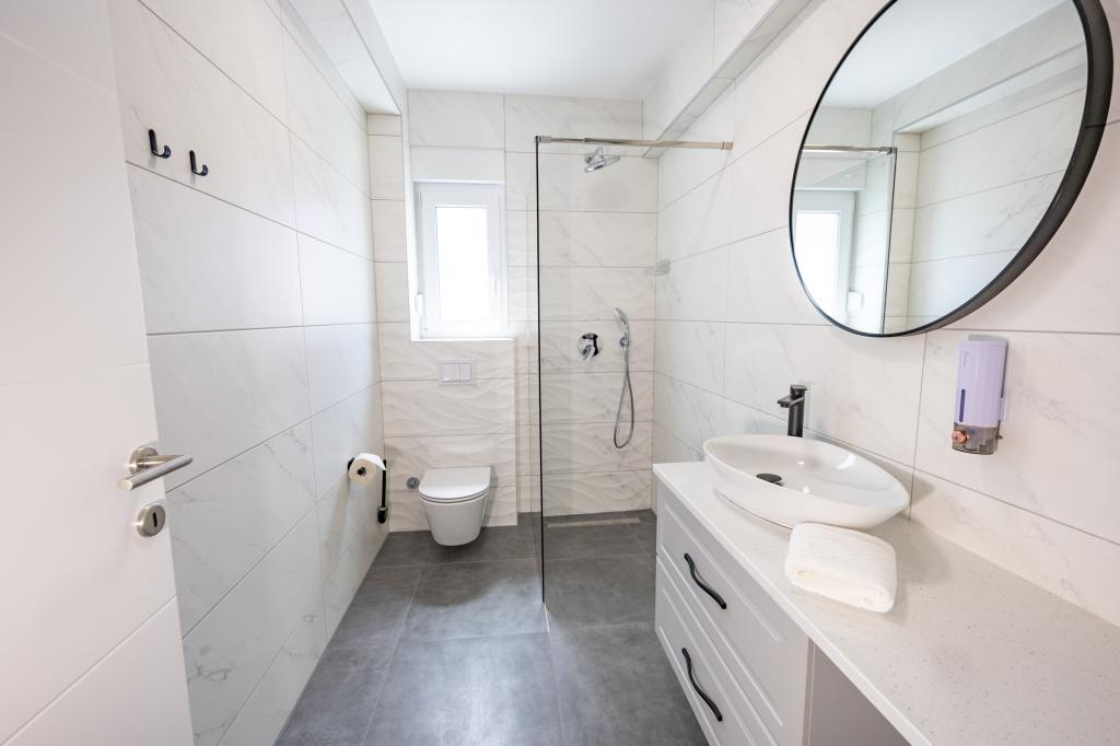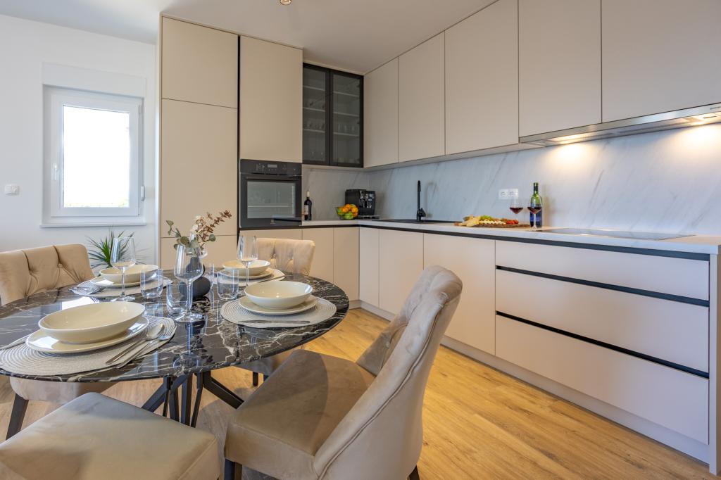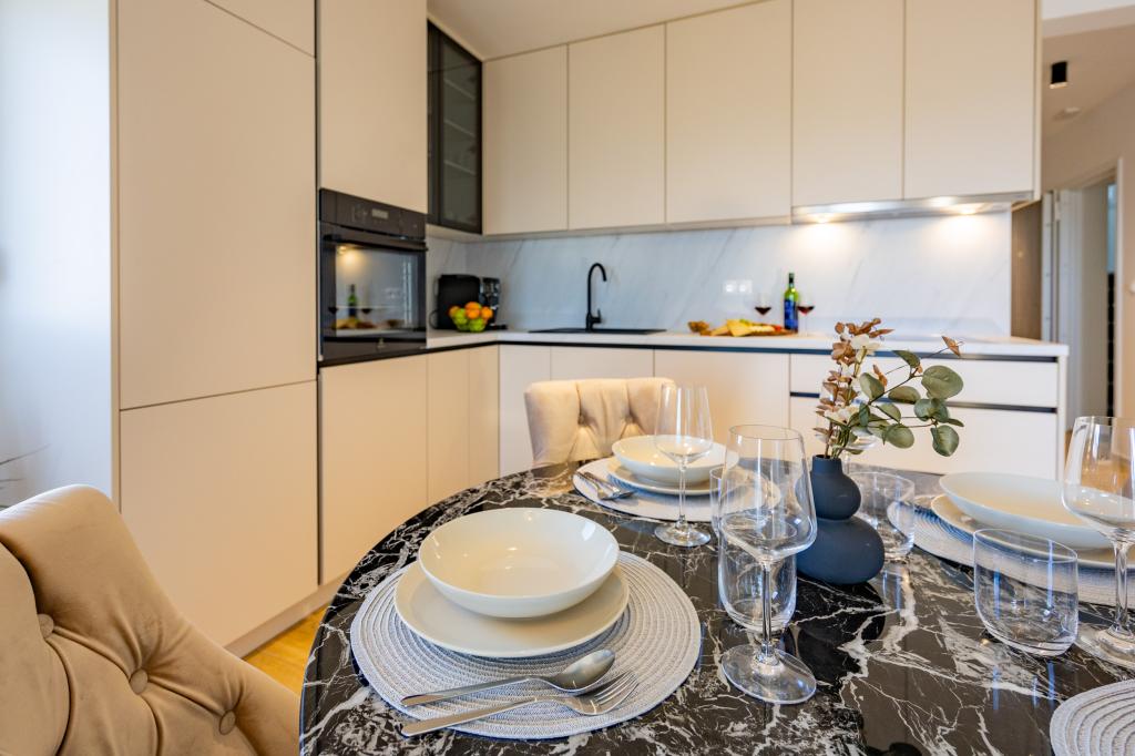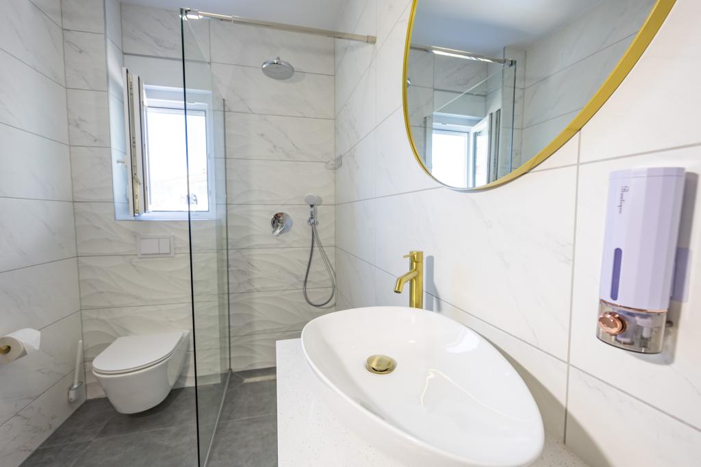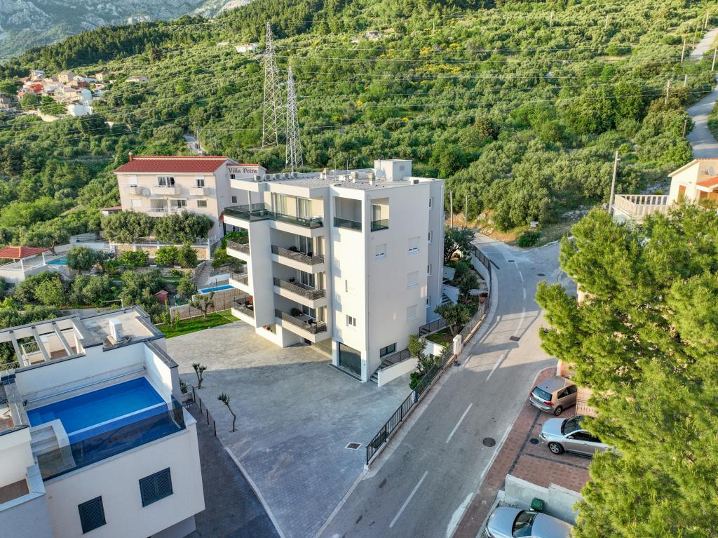 Minden apartman modern dizájnt és felújított belső teret kínál. A tágas nappaliban, ízléses bútorokkal és modern részletekkel otthon fogja érezni magát. A nyitott koncepció természetes módon köti össze a nappalit egy teljesen felszerelt konyhával, ahol elegáns munkalapok, minőségi készülékek és minden tér várja, amire szüksége lehet kedvenc ételei elkészítéséhez. A nappaliból egy kellemes erkélyre nyílik ki - ideális hely a reggeli kávéhoz vagy az esti pihenéshez egy pohár borral és egy felejthetetlen naplementével az Adriai-tenger felett. Minden apartmanban két kényelmes hálószoba található dupla ággyal, puha ágyneművel és rengeteg tárolóhellyel, egy modern fürdőszoba és egy további WC. Az apartmanok légkondicionáltak és teljesen felszereltek: TV/SAT, internet, mosógép, mosogatógép, kávéfőző és minden, amire szüksége van egy kényelmes és gondtalan tartózkodáshoz. Az ingyenes parkolás a strand közelében benne van a bérleti díjban!
