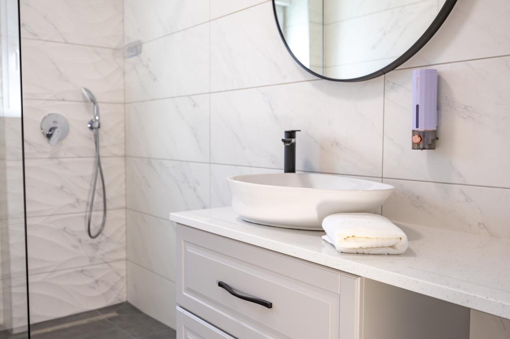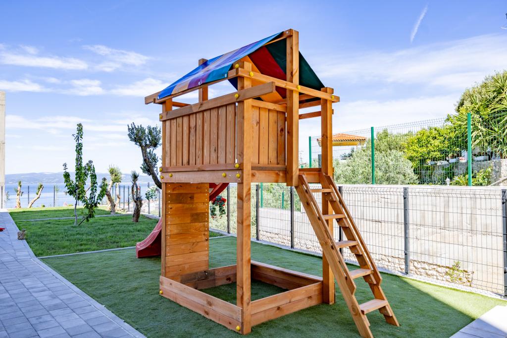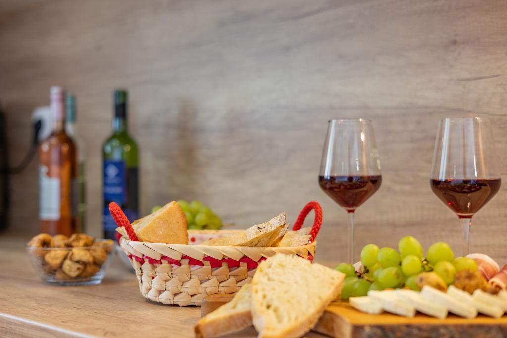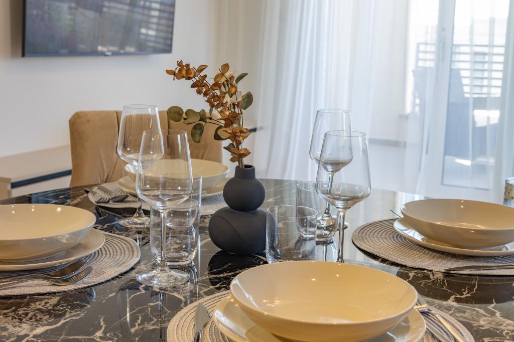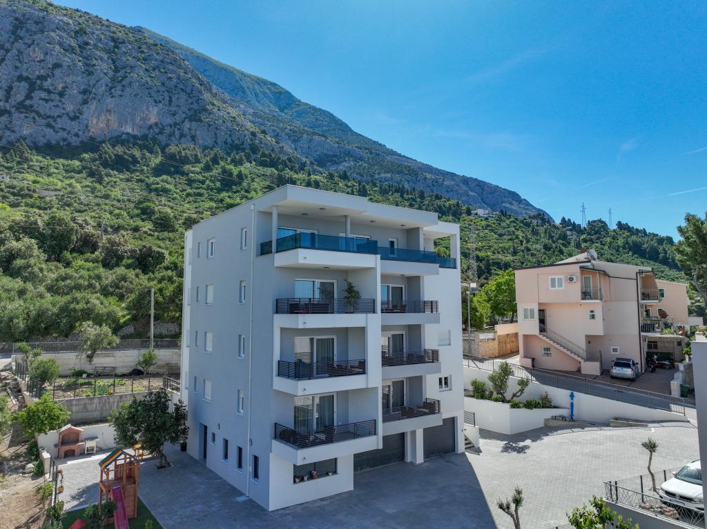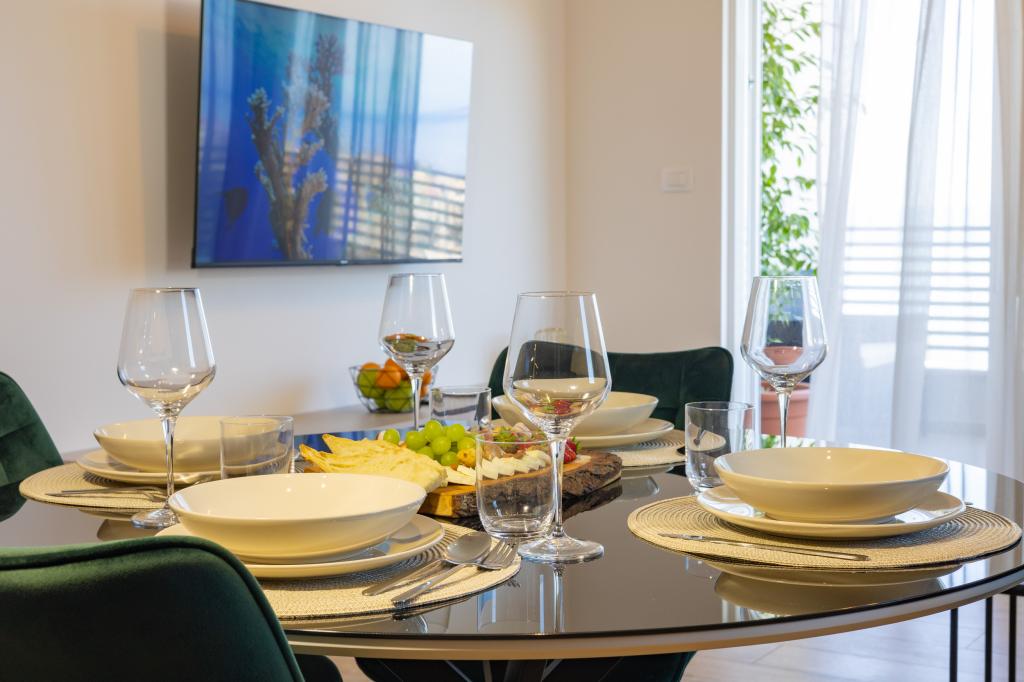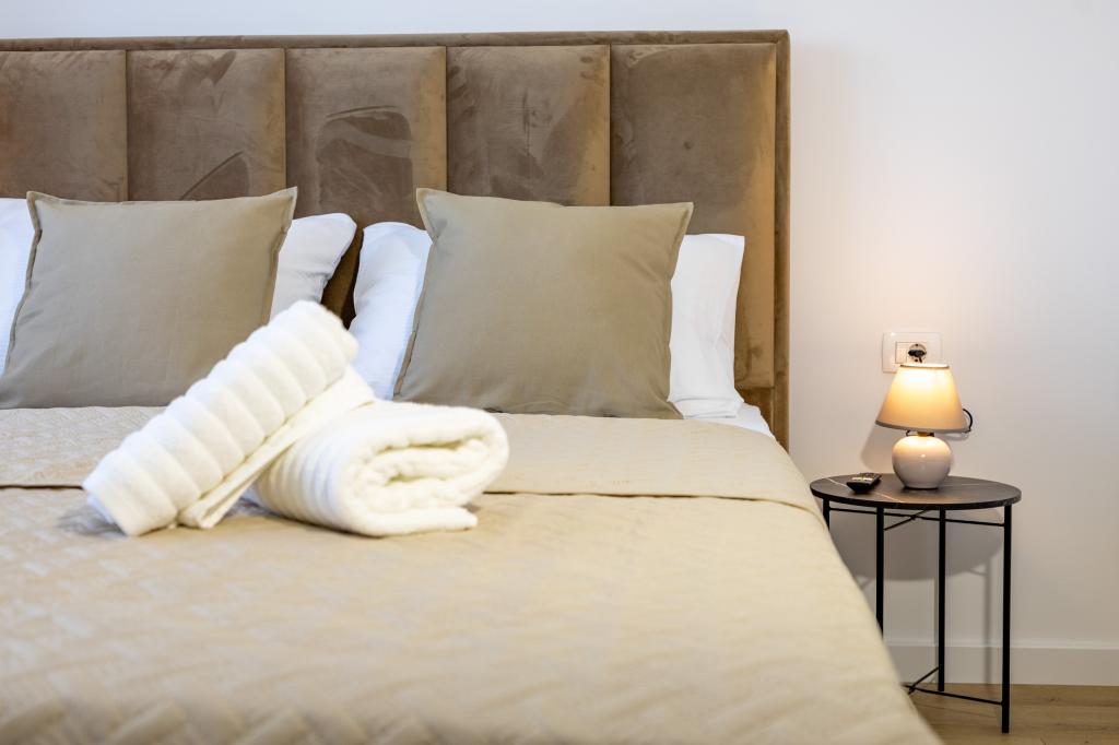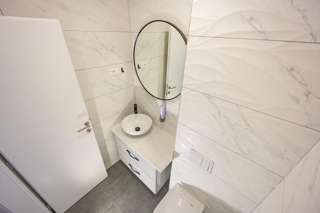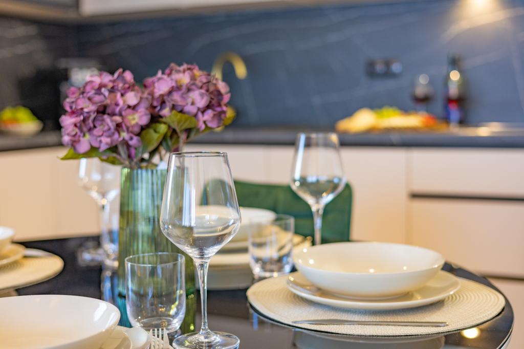 Minden apartman modern dizájnt és felújított belső teret kínál. A tágas nappaliban, ízléses bútorokkal és modern részletekkel otthon fogja érezni magát. A nyitott koncepció természetes módon köti össze a nappalit egy teljesen felszerelt konyhával, ahol elegáns munkalapok, minőségi készülékek és minden tér várja, amire szüksége lehet kedvenc ételei elkészítéséhez. A nappaliból egy kellemes erkélyre nyílik ki - ideális hely a reggeli kávéhoz vagy az esti pihenéshez egy pohár borral és egy felejthetetlen naplementével az Adriai-tenger felett. Minden apartmanban két kényelmes hálószoba található dupla ággyal, puha ágyneművel és rengeteg tárolóhellyel, egy modern fürdőszoba és egy további WC. Az apartmanok légkondicionáltak és teljesen felszereltek: TV/SAT, internet, mosógép, mosogatógép, kávéfőző és minden, amire szüksége van egy kényelmes és gondtalan tartózkodáshoz. Az ingyenes parkolás a strand közelében benne van a bérleti díjban!