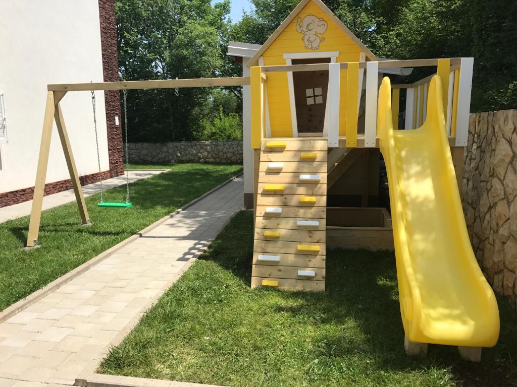 A ház mellett úszómedence és napozóágyak találhatók. A kertben játszóteret alakítottunk ki a gyerekeknek. A medence mellett van egy faszén grill. Szállást és szállítást biztosítunk a Camina KRK túrázóinak.