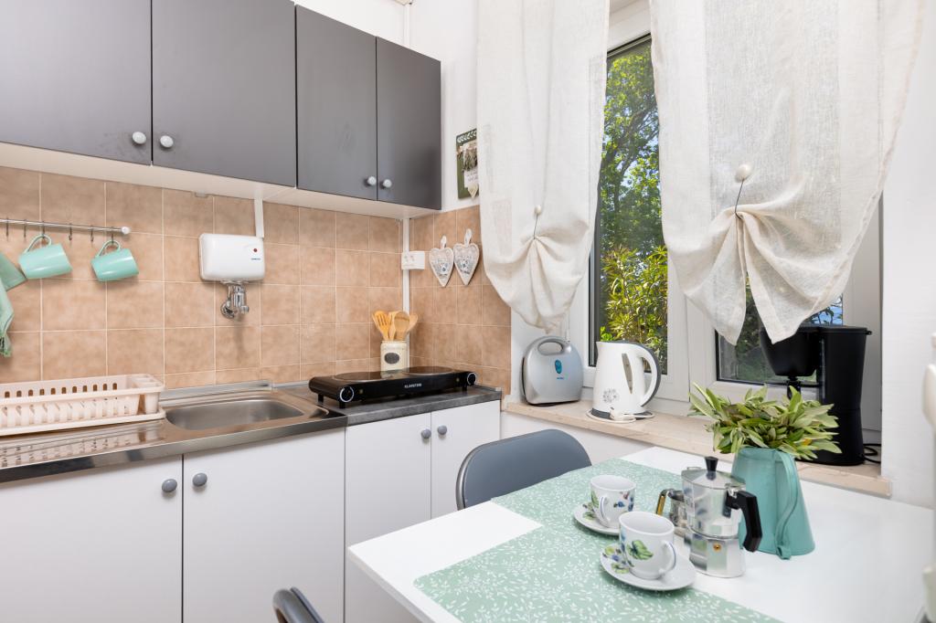 Kellemes apartman gyönyörű helyen, pár lépésre a víztől. Korszerűen felszerelt, hangulatos apartman tengerre néző terasszal és gyönyörű, gondozott kerttel. Parkolási lehetőség a háznál, grillezés vagy napozás a nyugágyakon. A tulajdonosok nagyon kedvesek, kommunikatívak. Kellemes hely az aktív pihenéshez és kikapcsolódáshoz. Nagyon szívesen visszajövök ide.