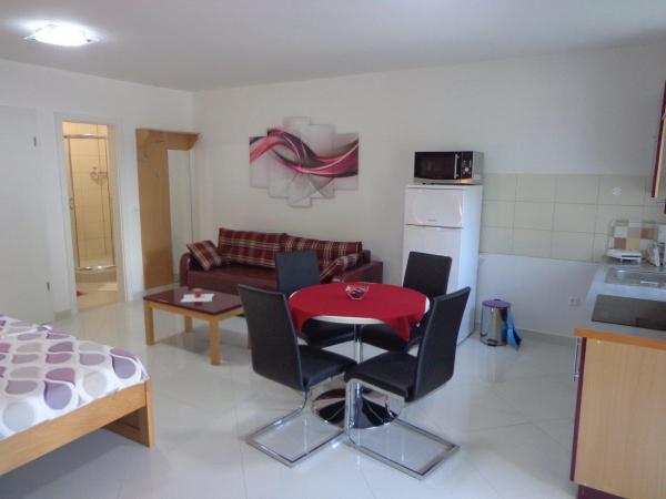 Három modern, jól felszerelt stúdió apartman található, mindössze 150 méterre a tengertől, közel üzletek és éttermek. Mindegyik apartman mellett egy nagy franciaágy egy kanapé, amely könnyen alakítható ágy. Az apartmanok szépen berendezettek, egy TV, légkondicionáló és vezeték nélküli internet. Studio Rouge, lakás található a földszinten, jellemző a mély vörös szín sugárzik a szeretet érzése és a szenvedély. Rouge fér egy kis kertje tökéletes szocializációs nap után a tengerparton. Studio Rose található központjában (1. emelet), és ez jellemzi a szelíd rózsaszínű sugárzik, hogy a gyengédség és a kényelem. Rose egy erkély, ahol pihenhet a csicsergő madarak és a kilátás nyílik a vidékre, ami körülveszi a lakások. Studio Beige, lakás, amely található a tetején, jellemző árnyalatú bézs. Beige apartman külön hálószoba és konyha a lakóhely. ezért különösen alkalmas a kisgyermekes családok.