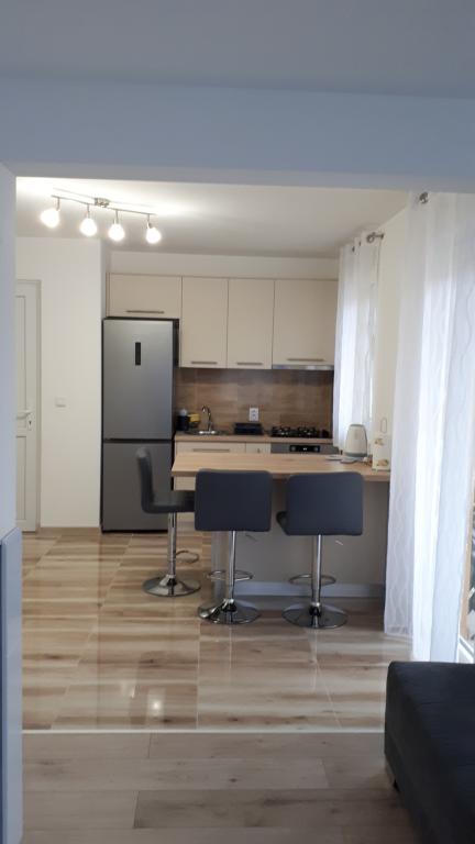 Csendes helyen lévő lakóépület 1. emeletén található modern kialakítású apartman. Teljesen felújított lakás, 1 hálószoba + kanapé, 2 erkély, teljesen új berendezés, ágynemű, törölköző, klíma, Wi-Fi, parkoló, hűtőszekrény, mosógép rubel