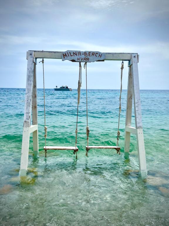 Két- és négyágyas apartmanok, valamint egy apartman nagy terasszal Milna csendes részén találhatók. 5 percre található a központtól és az első strandtól. Alkalmas gyermekes családok számára. Hvar város közelsége (3 km) a fiatalok számára is alkalmas, ahol napközben Milna kisváros nyújtotta előnyöket és rejtett öblöket élvezhetik fürdőzésre, éjszaka pedig Hvar városa nyújt számukra felejthetetlen éjszakai szórakozást. .