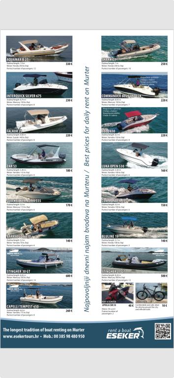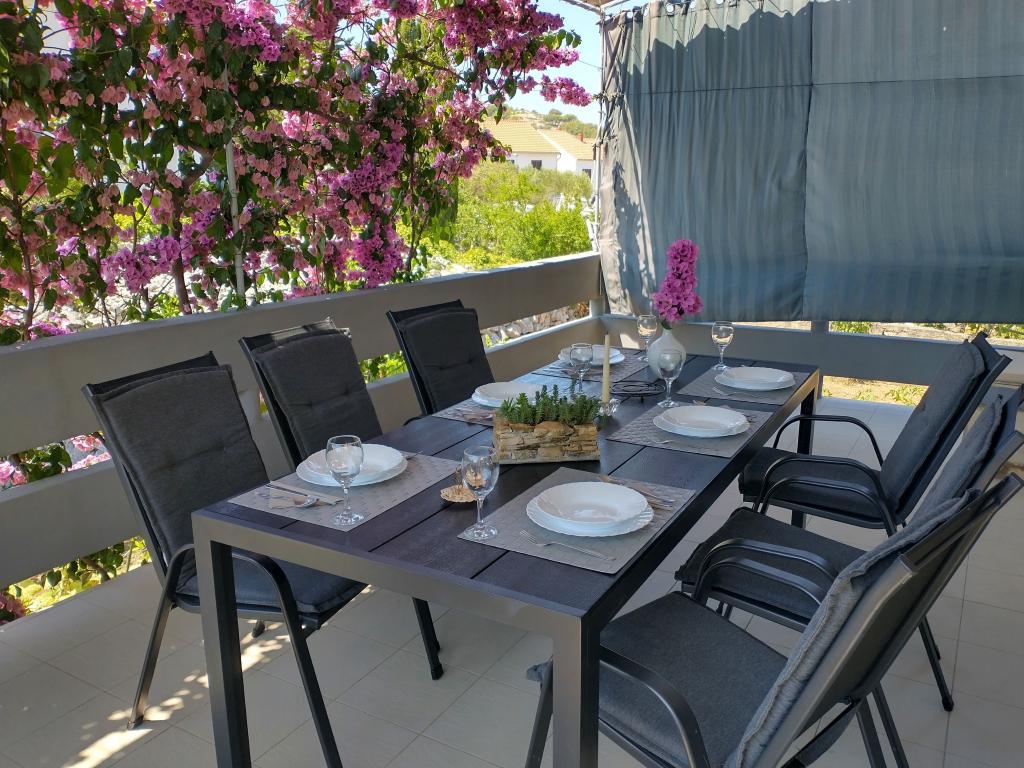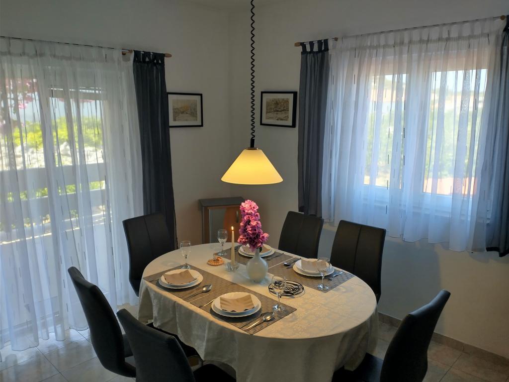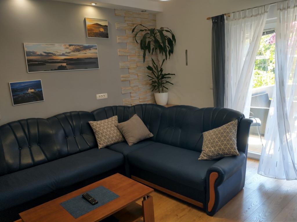 A Ježina család háza Murterben található, 300 méterre a strandtól. 100m2-es teraszos, erkélyes apartman áll a vendégek rendelkezésére. Három kétágyas szoba két pótággyal, konyha, étkező, nappali, fürdőszoba, wc, nagy terasz természetes árnyékban és erkélyek, kilátással a zöldre, a környékre és a távolban a tengerre, alkalmas családok-barátok, vagy csoportok számára 6-8 tagból áll. A nagy kert és az úttól való távolság biztonságot nyújt a gyerekeknek, míg a mobil grillsütő és a szőlő- és olajfák árnyéka a felnőttek számára. A Ježina család megegyezés szerint a közeli szigeteken saját olajfaligeteket is bemutathat vendégeinek.