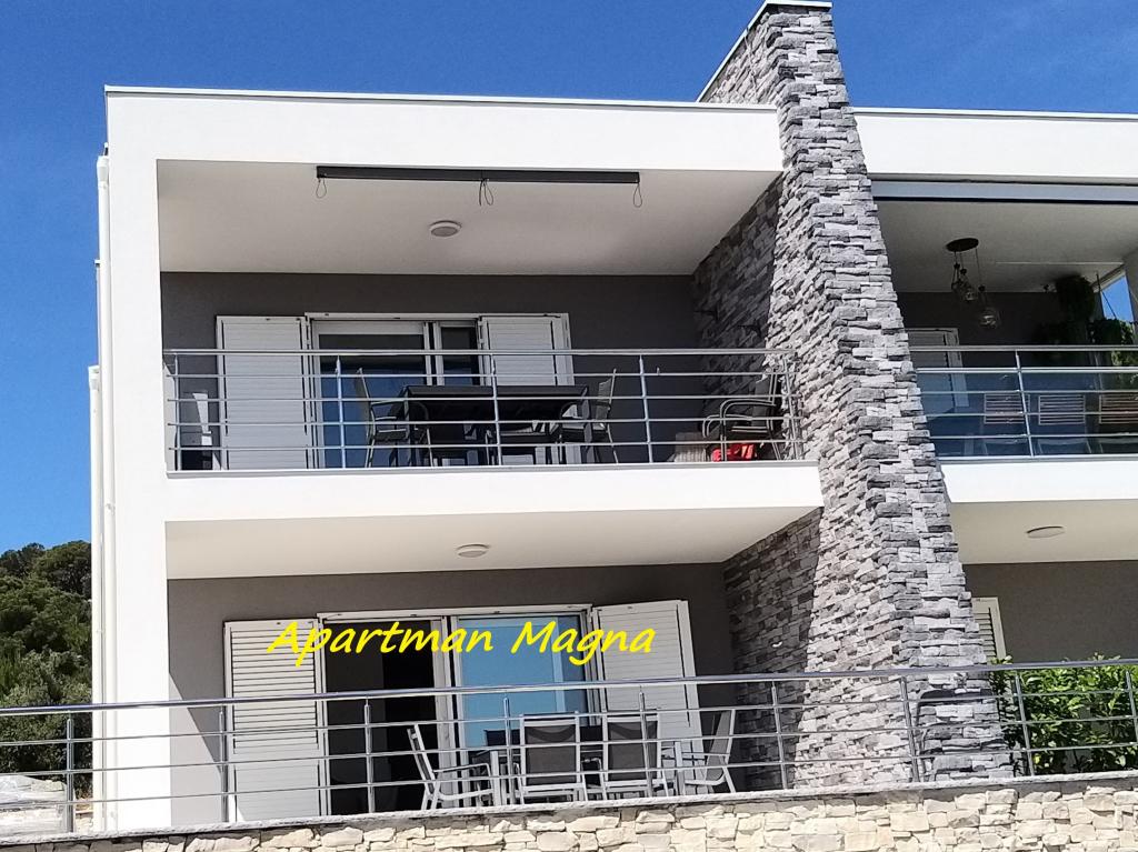 A "MAGNA" apartman a városi strand közvetlen közelében található, 1000 m-re a városközponttól, és gyönyörű kilátást nyújt a tengerre. Az apartman alapterülete 60 m2, két hálószobája maximum 5 felnőtt elszállásolására alkalmas. Az apartman a földszinten található (a képen jelölve) és a vendégek számára egy grillezős terasz is elérhető. Parkolás a ház előtt van, benne van az árban. Háziállat nem megengedett.