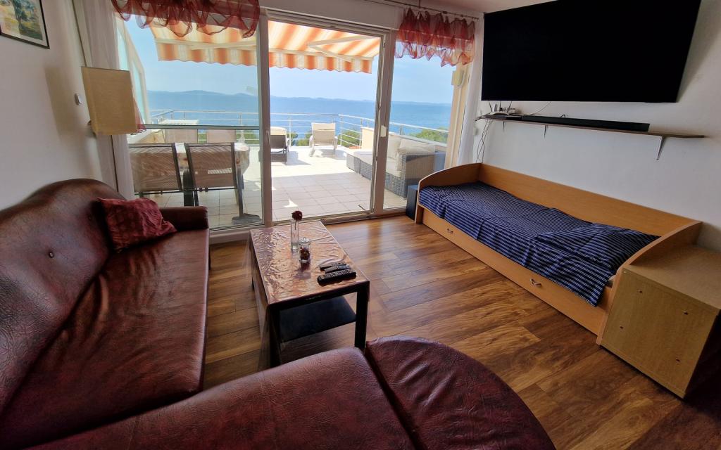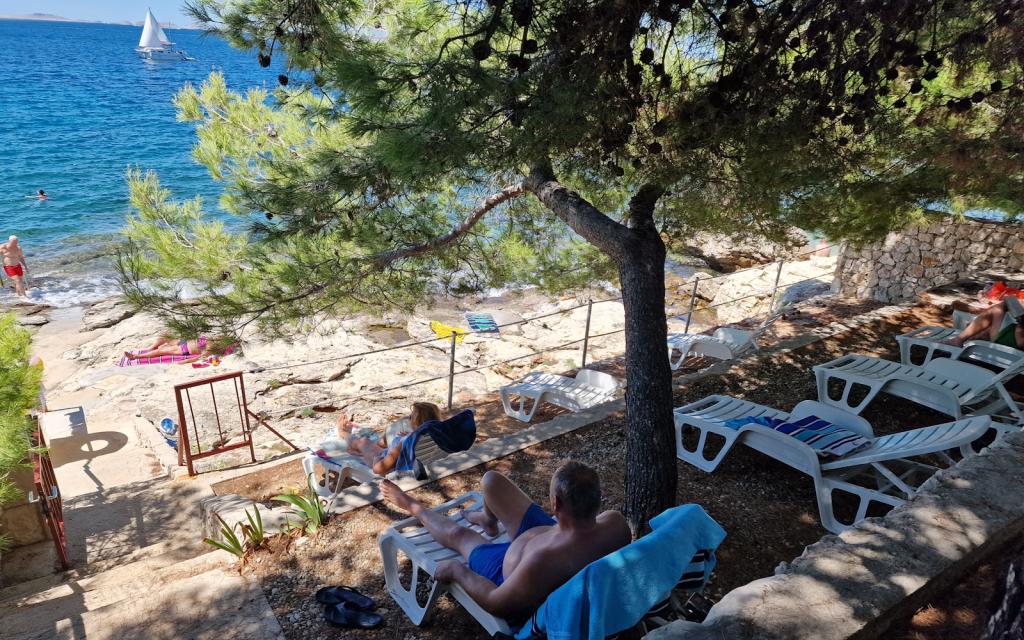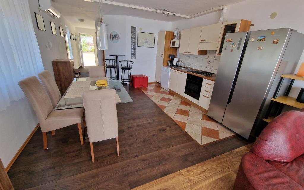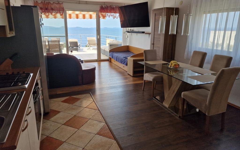 A G1 apartman a felsőház nyugati oldalán található. 50 m2 alapterületű, további 20 m2 terasszal. 2-3 fős kényelmes tartózkodásra szolgál, nagy terasszal, panorámás kilátással a Kornatira és a Kornati és Murter közötti nyílt tengerre. Az apartmanban egy hálószoba és egy fürdőszoba WC-vel, valamint egy nagy közös helyiség található, amely vizuálisan teljesen nyitott a teraszra és a tengerre panorámás kilátással. Ebben a közös térben egy konyha étkezővel és egy nappali található. A lakás erős klímaberendezéssel, WiFi internettel, műholdas programokkal és streaming szolgáltatással (netflix) felszerelt. Az apartman mellett egy parkolóhely és egy árnyékos, a strand melletti rész áll rendelkezésre napozóágyakkal.