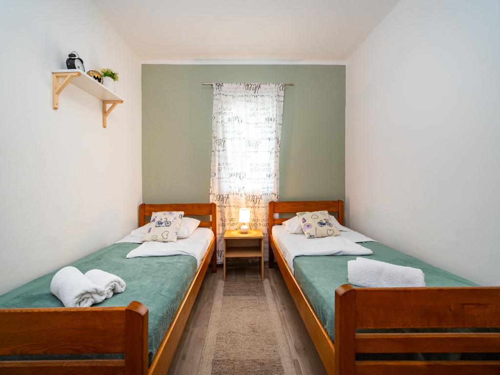 A FIFA apartmanok Nin város új részén, a Vágóhíd területén találhatók. A házak kb. 400 méterre vannak a királynő strandjától, és a turisták közvetlen közelében vannak. település Zaton. Körül egy nagy udvar veszi körül, amely alkalmas gyermekek játszására, kültéri zuhanyzókra és asztalokra az apartmanban. Nem közvetlenül az úton vannak, így a gyerekek szabadon játszhatnak a ház körül. Az udvaron grillezési lehetőség áll a vendégek rendelkezésére, és az autó árnyékában parkolhat. Két apartman négyágyas, 55 m2-es, két hálószobával, fürdőszobával, nappali (kanapéval) konyhával és két terasszal, és egy apartman nyolcszögletű gyermekágy lehetőségével, 80 m2-es három szobával, 2 fürdőszobával, konyhával és tágas terasszal. Az apartmanok teljesen felszereltek, légkondicionáltak, műholdas TV-vel a nappaliban. Minden apartmanhoz saját mosógép és mosogatógép, valamint internet-hozzáférés tartozik, amelyet a bérleti díj tartalmaz, valamint parkolás és végső takarítás. Háziállatok, légkondicionáló használata és reggeli felár ellenében.