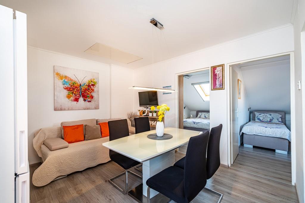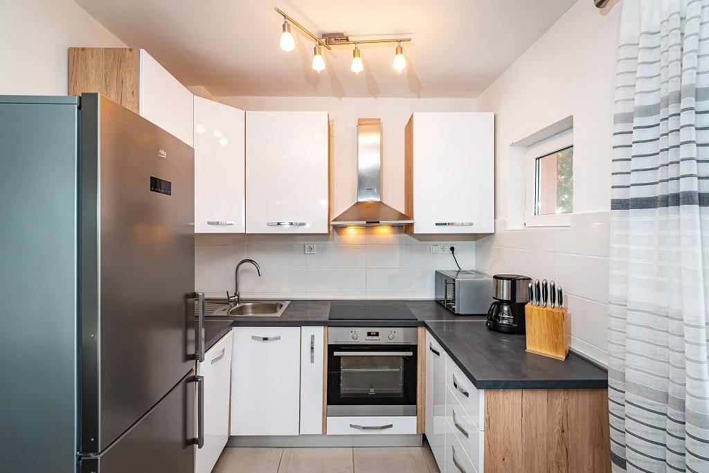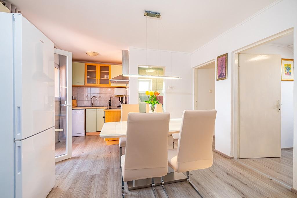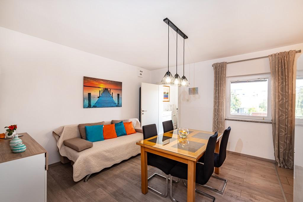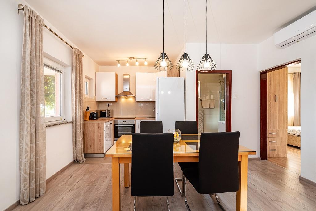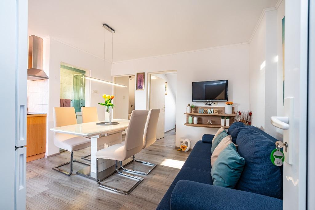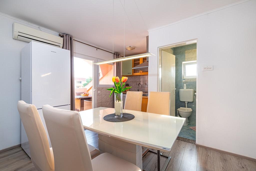 Modern apartmanjaink Ninben, a Nin-öböl déli részén, a Ždrijac-félszigeten fekvő tengerparti városban találhatók, Zadartól 17 km-re északra. Horvátország legrégebbi királyi városa, a híres Ždrijac homokos strand közelében. Nin nemcsak történelmi város. Környezetével együtt kedvező feltételeket biztosít a pihenéshez és a kikapcsolódáshoz. Nin környékén számos hosszú homokos lagúna található homokos strandokkal, távol a tömegtől, valamint egy ipari övezet, kiváló mikroklímával. Az apartmanok egy gyönyörű és nagyon csendes környéken találhatók, kevesebb mint öt perc sétára a strandtól és az Adriai-tengertől. A ház kétszintes. A tulajdonosok a földszinten laknak, két apartman az első emeleten és kettő a másodikon. A ház különálló, és a telek kerített, így nagyon alkalmas gyermekek számára. Öt autó számára parkoló és grillező is található a kertben. Az apartmanok kerekesszékkel nem alkalmasak. Vezeték nélküli internet áll rendelkezésre. A strand és a tenger mindössze 100 méterre található az apartmanoktól, egyéb létesítmények pedig 600 méterre.