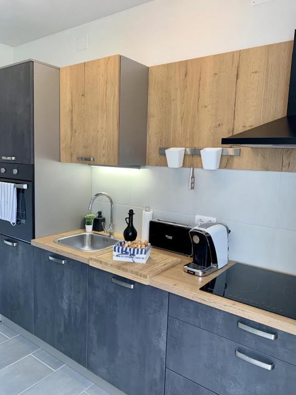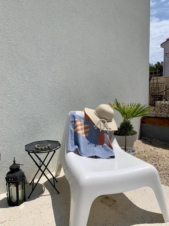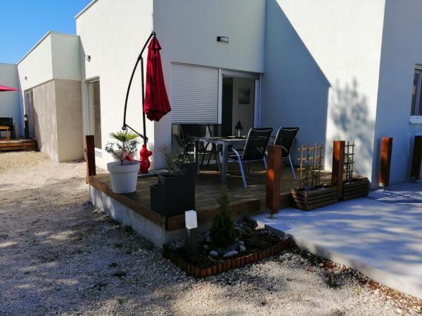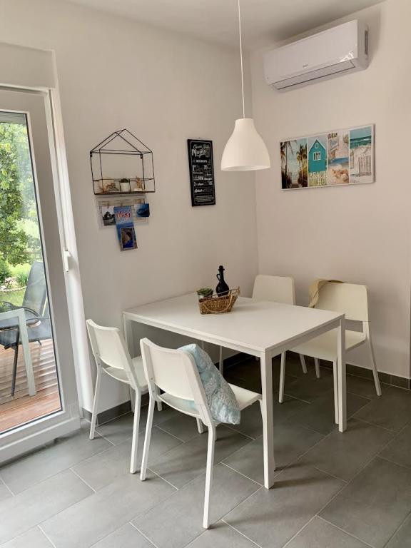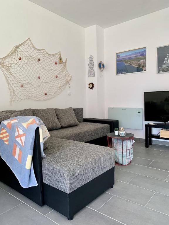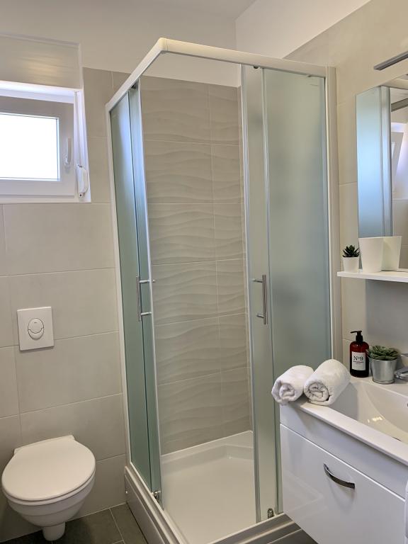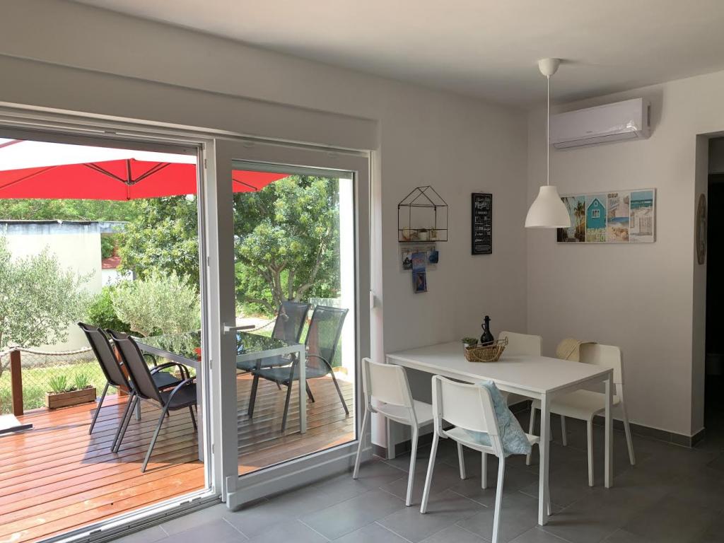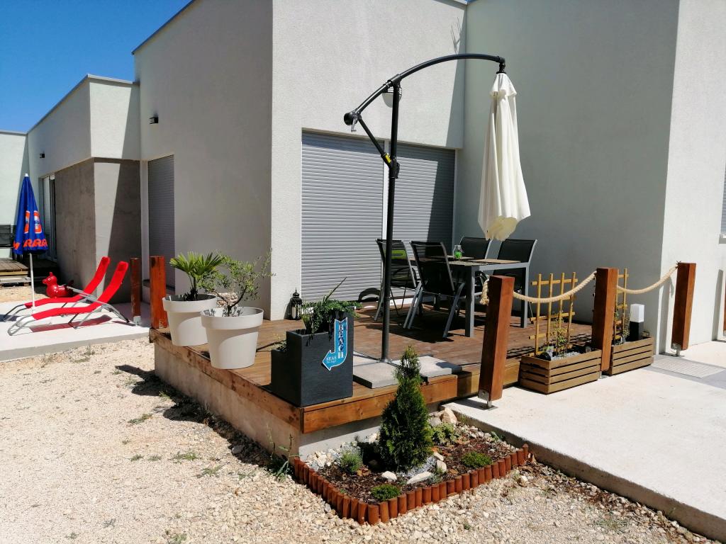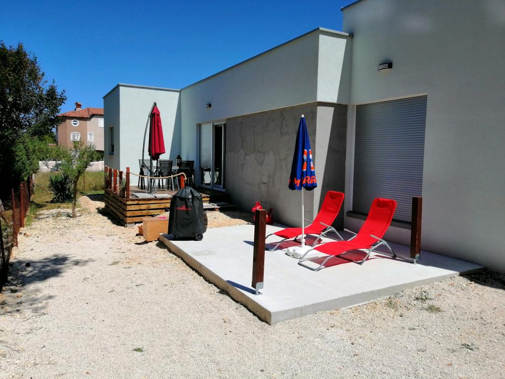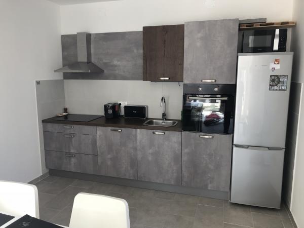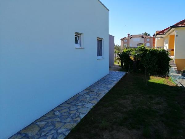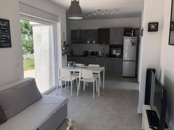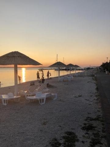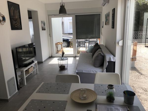 Vadonatúj apartmanok, modern berendezéssel. Minden apartmanban 2 hálószoba, komplett fürdőszoba (mosógép) és egy további WC található. A konyha teljesen felszerelt (sütő, mikrohullámú sütő, mosogatógép, kávéfőző, kenyérpirító), gyönyörű fa burkolatú terasz. Mindkét apartman a földszinten található. 80 m-re a tengertől és a kavicsos strandtól, a strand mentén sétány, játszótér, strandröplabda és egyéb létesítmények találhatók. Biztonságos parkoló.