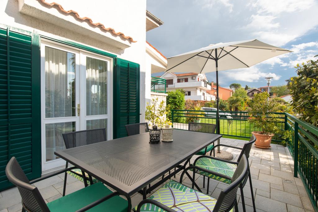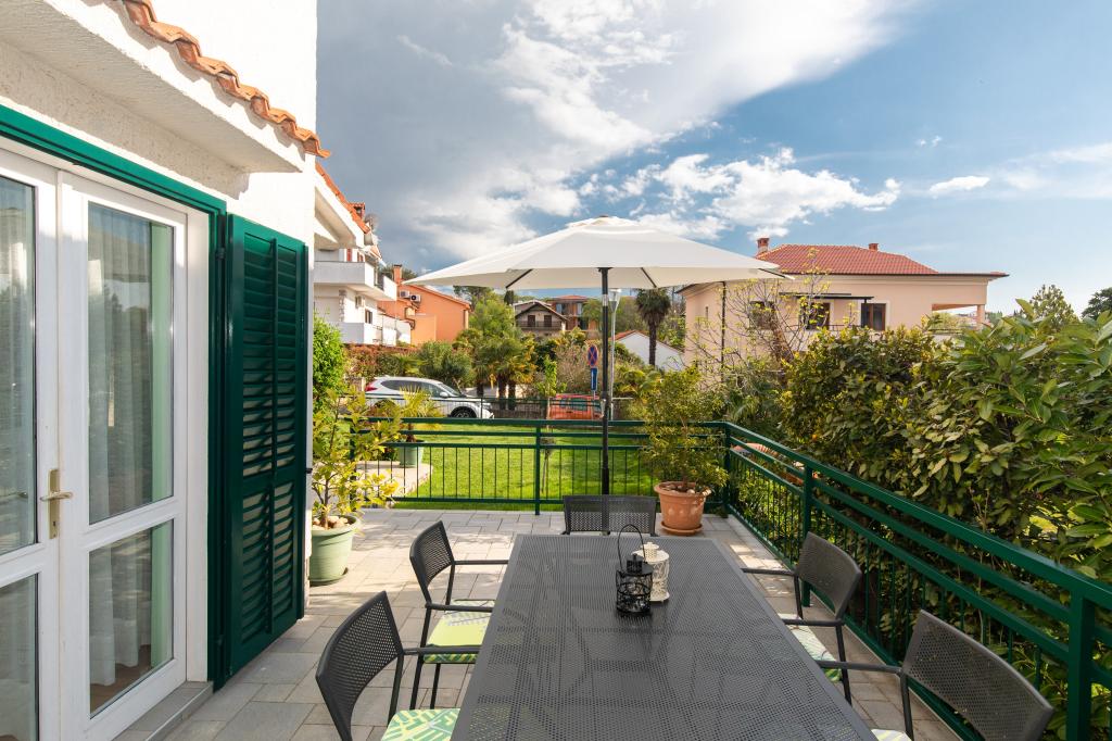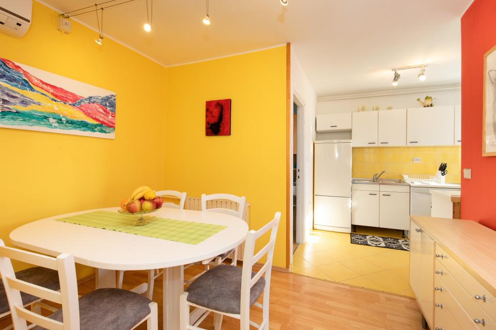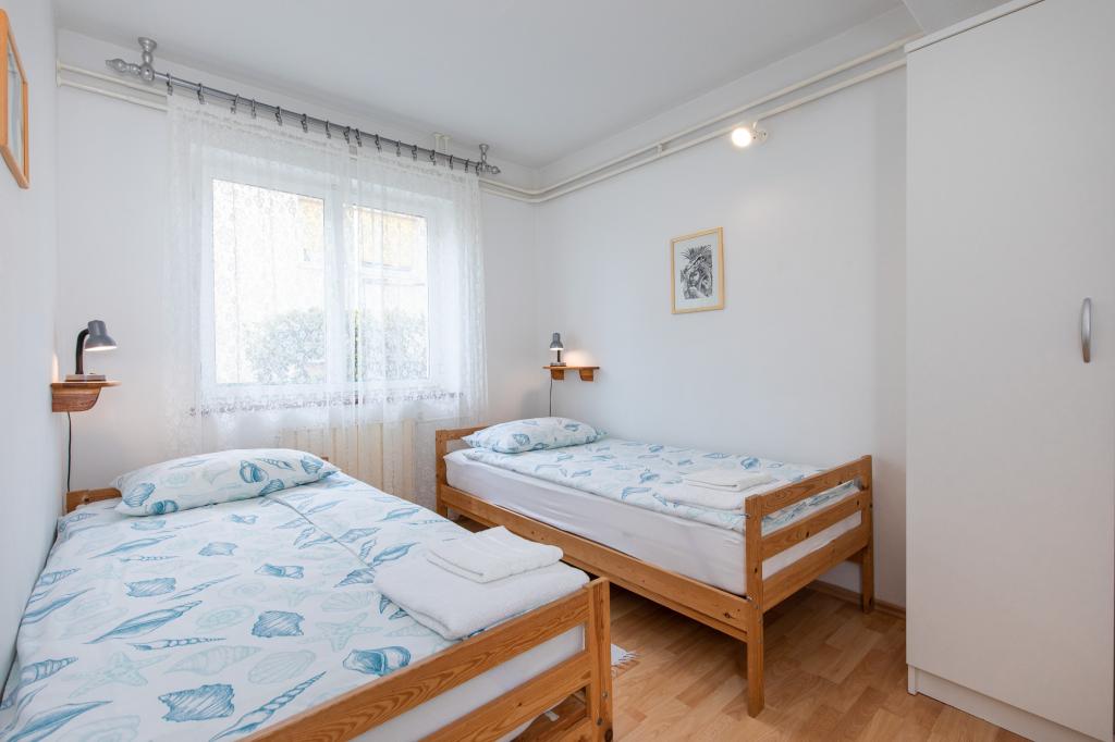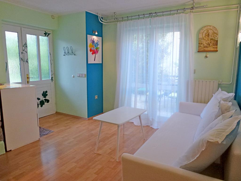 Teljesen felszerelt, nagy terasszal rendelkező apartman egy családi ház földszintjén. A városközpontban, csendes helyen található. Konyhából, étkezőből, nappaliból, két hálószobából és egy fürdőszobából áll. Parkolás a telken belül lehetséges.
