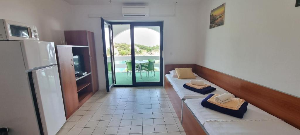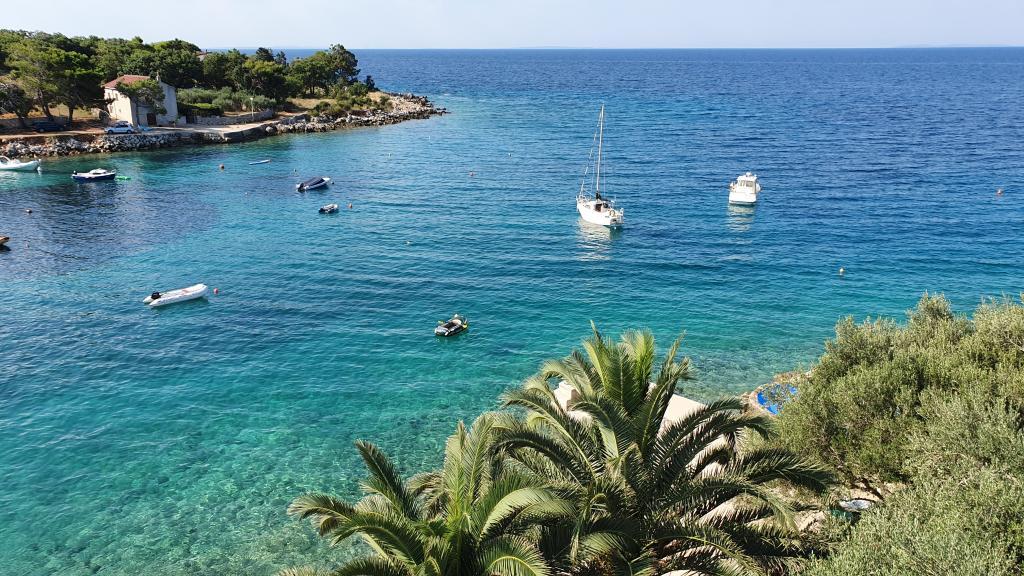 Teljesen és korszerűen felszerelt apartmanok a sziget zöld részén, az első sorban találhatóak, gyönyörű kilátással a tengerre. A létesítmény 8 km-re található Novalja városától. Az épülettől balra homokos strand, az épület előtt betonozott strand úszómedencével és 5 percre. sétálni nagy homokos. Csónakkikötő, nagy grillező, saját parkoló és saját strand. Lehetőség a teljes épület bérbeadása szezonon kívül hétvégi ünnepségekre vagy bulikra megegyezés szerint.
