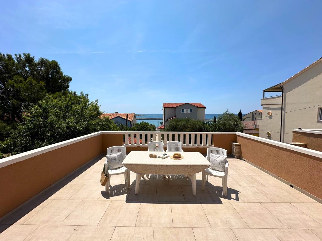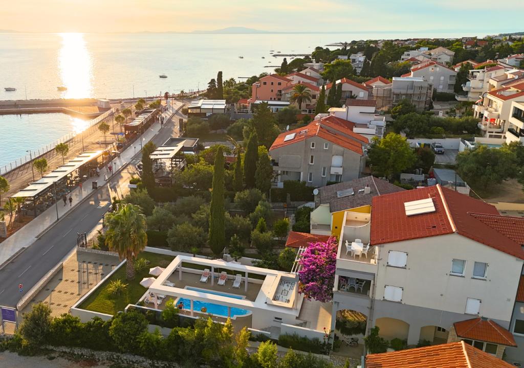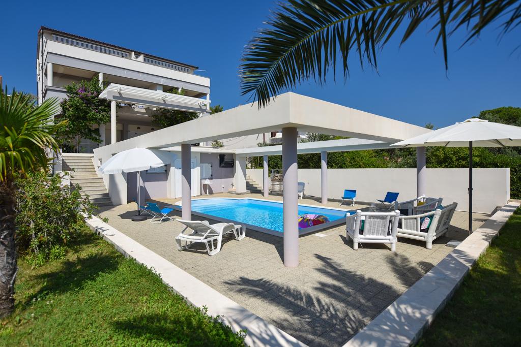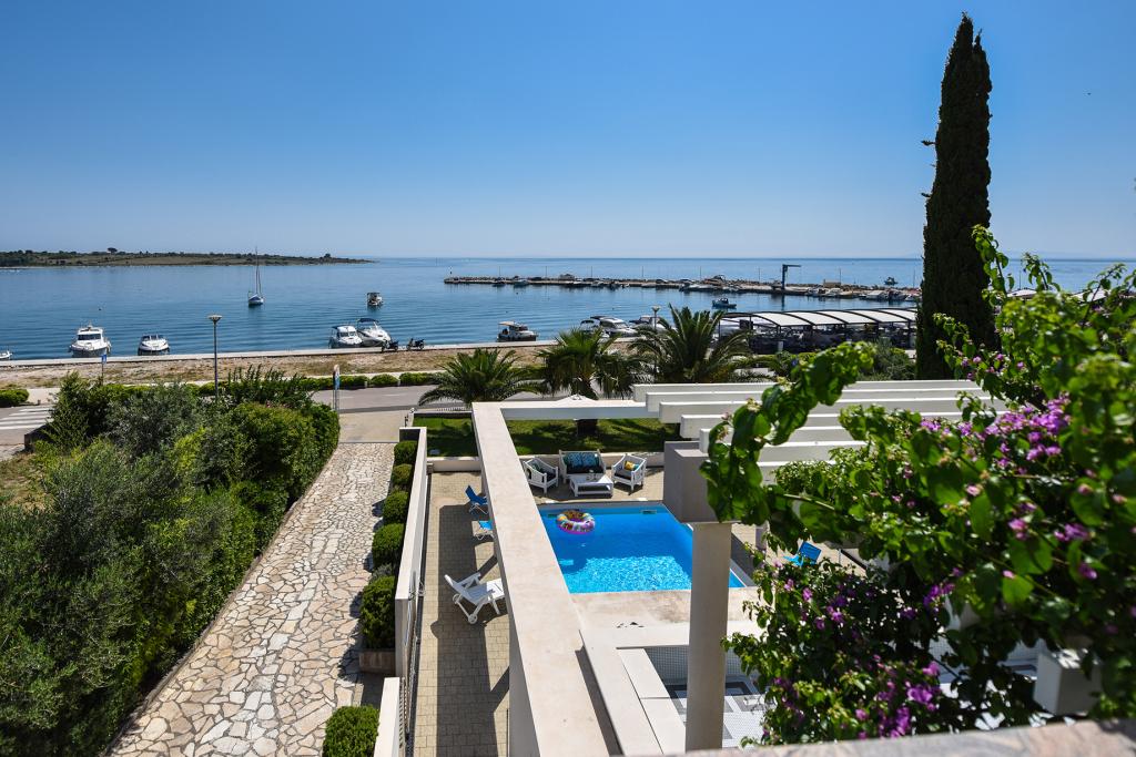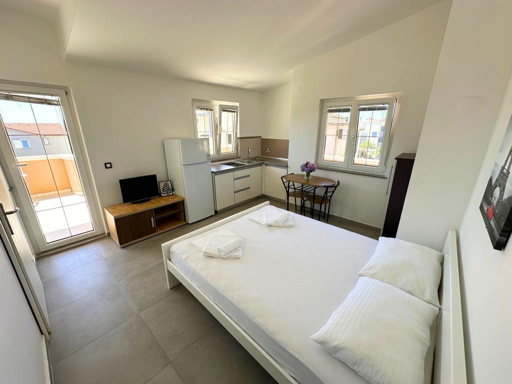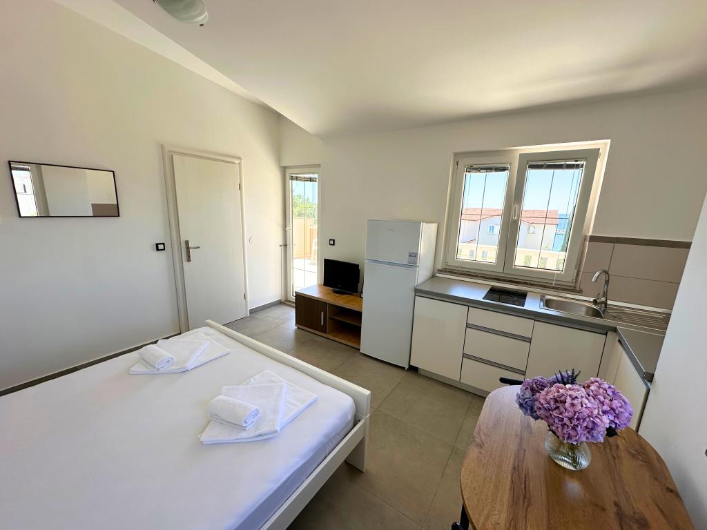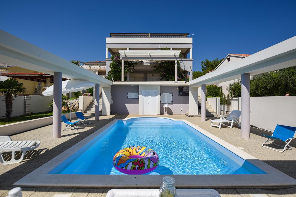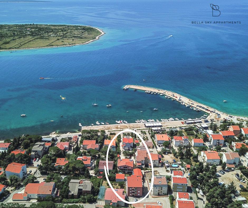 A Bella Sky apartmanok Novalja központjától nem messze találhatók, és 5 házból állnak, összesen 29 apartmannal. Az első ház közvetlenül a tenger mellett található, míg a többi ház egy sorban az első ház mögött található. Az apartmanok 2-6 fő befogadására alkalmasak, alapfelszereltségűek, tengerre néző kilátással, ingyenes parkolási lehetőséggel, úszómedencével és az udvaron társalgóhelyiséggel és grillezővel. Az apartman közelében számos étterem és kávézó, valamint strandok találhatók számos további tevékenységgel.