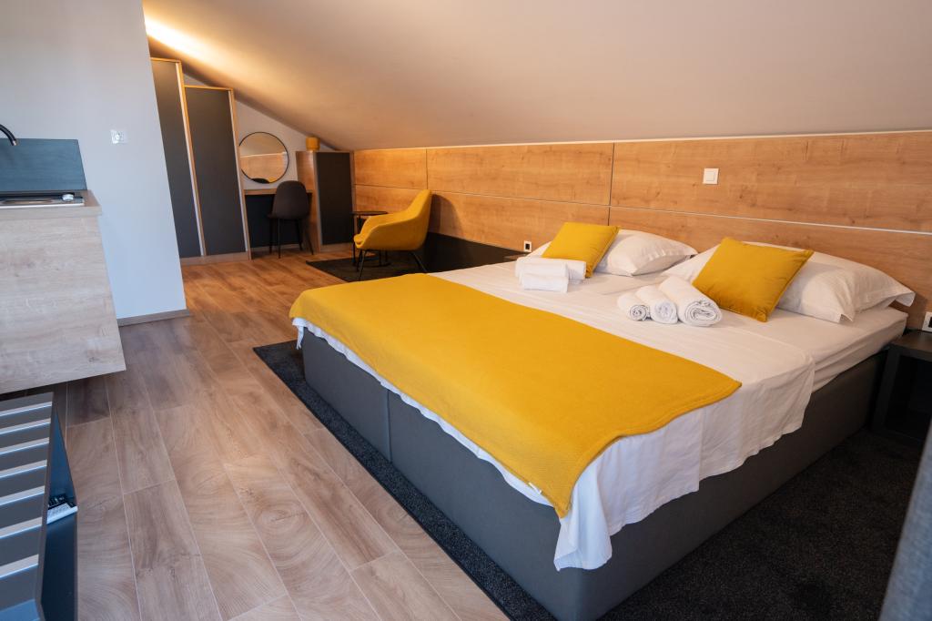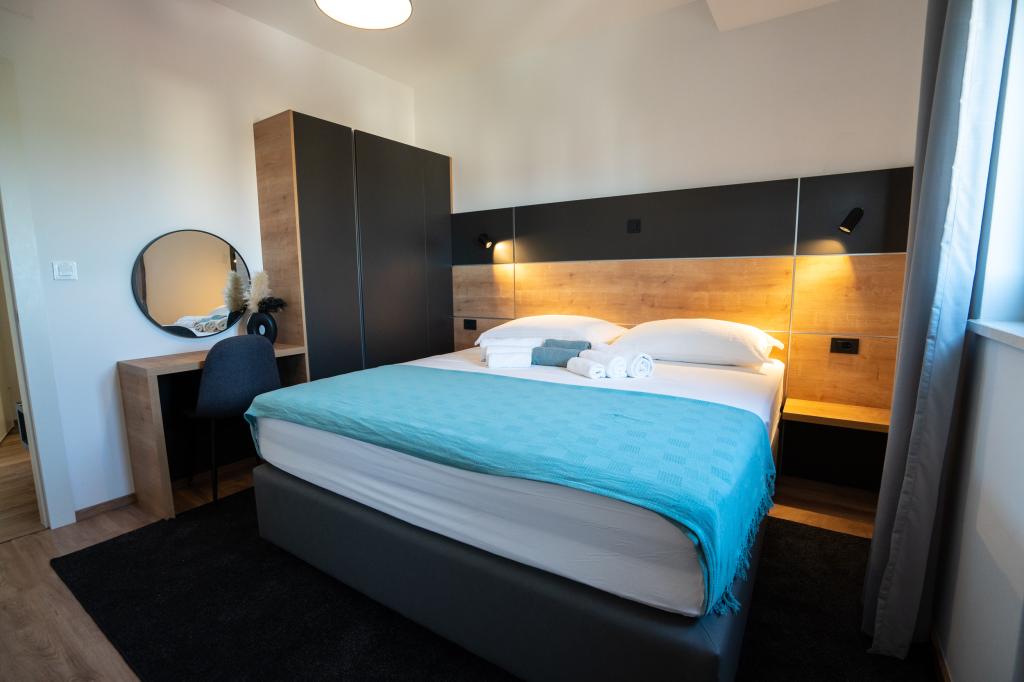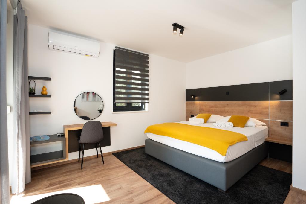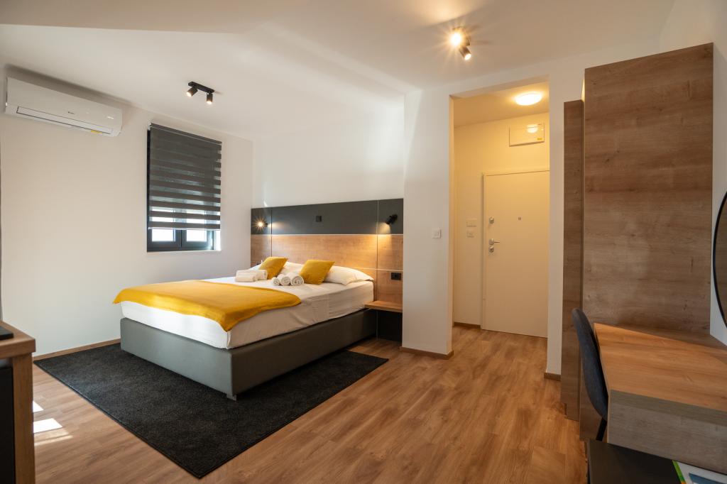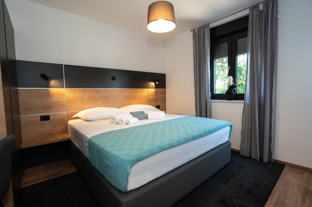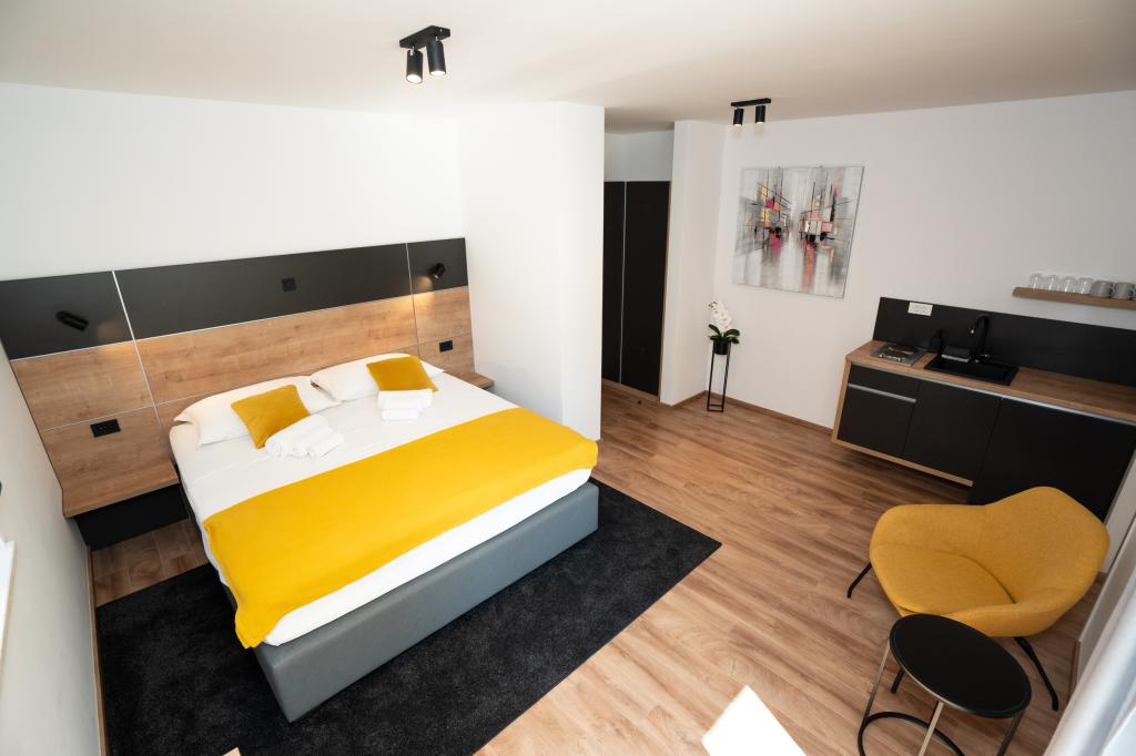 Élvezze modern felszereltségű szobáink és felsőkategóriás apartmanjaink kényelmét és eleganciáját. Minden szálláshely 4 csillagos besorolású, és a szállodai szabványoknak megfelelően, gondosan válogatott bútorokkal és minőségi felszereléssel van felszerelve. Ideális üzleti utakhoz, családi nyaralásokhoz vagy nyári kikapcsolódáshoz - a tökéletes novaljai tartózkodás itt kezdődik! I 4 csillag - a minőség visszaigazolása I Modern felszerelés és dizájn I Egyszobás apartmanok I Két pótágy a tágas nappaliban I Ingyenes Wi-Fi I Saját parkoló Foglaljon most, és tapasztalja meg a maximális kényelmet! MEGJEGYZÉS: A nappaliban található pótágyakat csak 12 év alatti gyermekek használhatják.