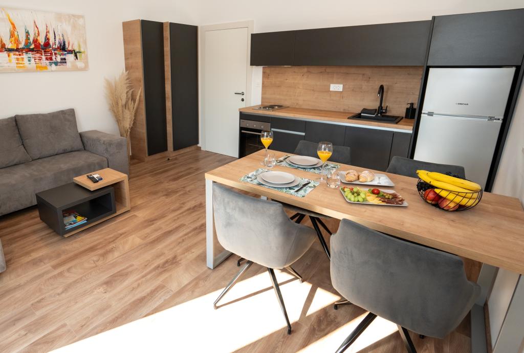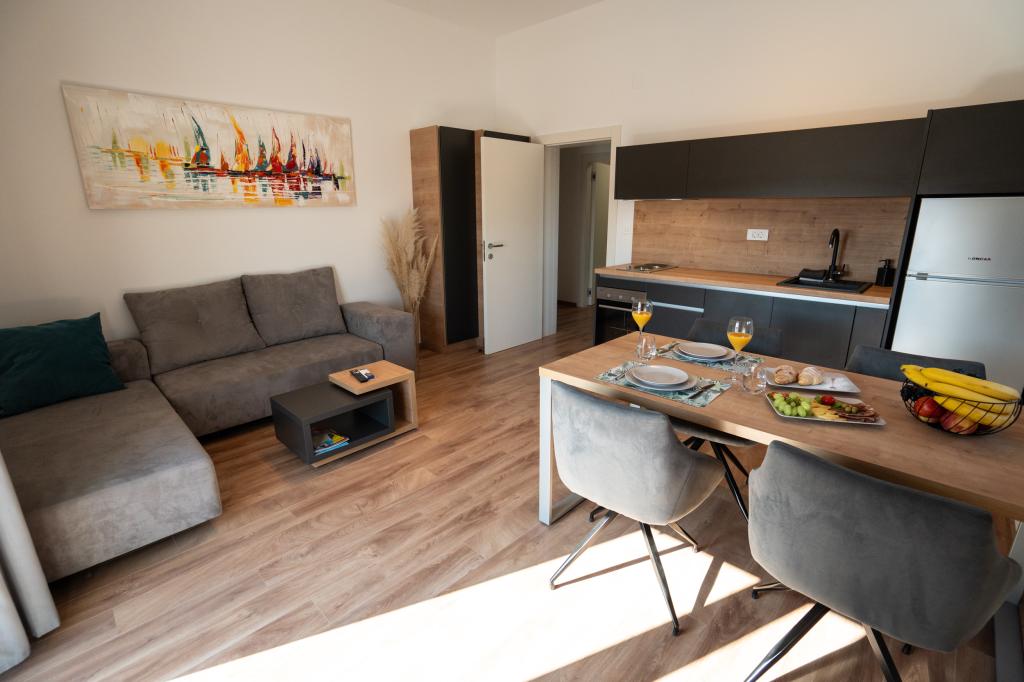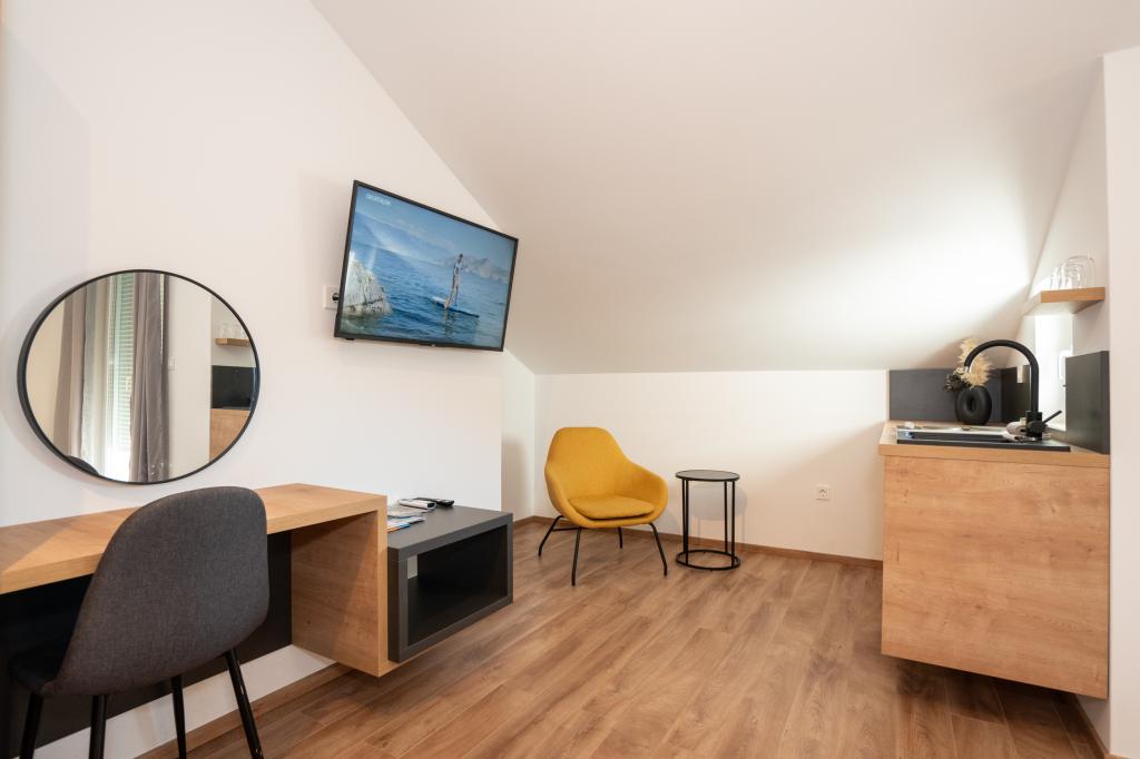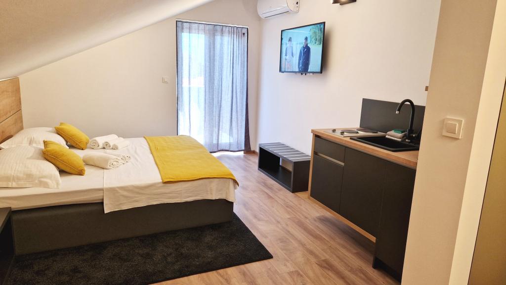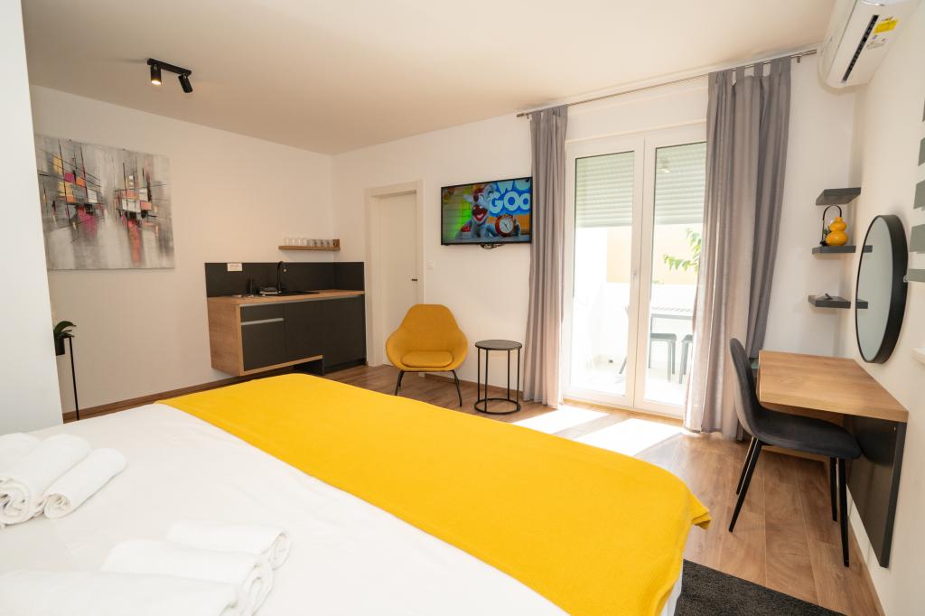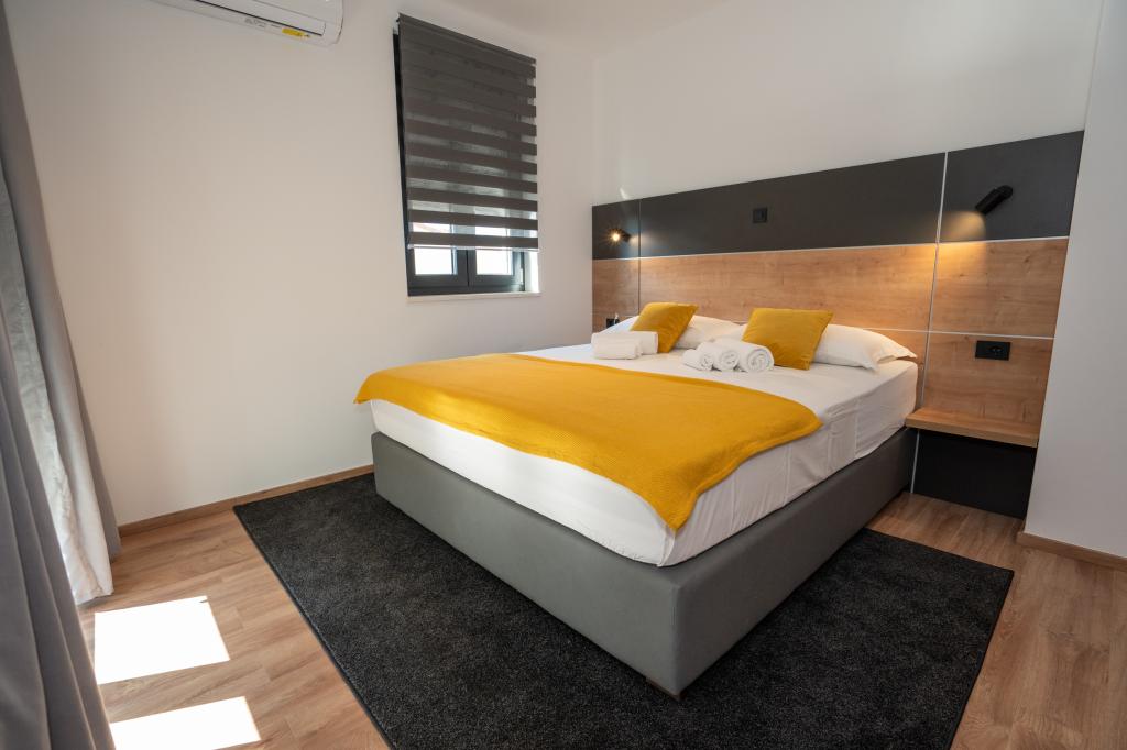 Élvezze modern felszereltségű szobáink és felsőkategóriás apartmanjaink kényelmét és eleganciáját. Minden szálláshely 4 csillagos besorolású, és a szállodai szabványoknak megfelelően, gondosan válogatott bútorokkal és minőségi felszereléssel van felszerelve. Ideális üzleti utakhoz, családi nyaralásokhoz vagy nyári kikapcsolódáshoz - a tökéletes novaljai tartózkodás itt kezdődik! I 4 csillag - a minőség visszaigazolása I Modern felszerelés és dizájn I Egyszobás apartmanok I Két pótágy a tágas nappaliban I Ingyenes Wi-Fi I Saját parkoló Foglaljon most, és tapasztalja meg a maximális kényelmet! MEGJEGYZÉS: A nappaliban található pótágyakat csak 12 év alatti gyermekek használhatják.